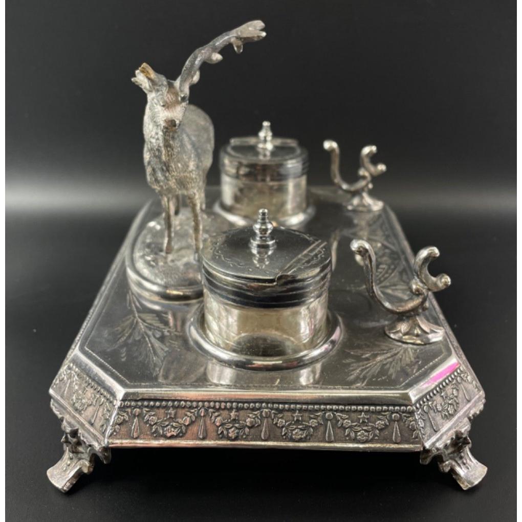 A STUNNING 1920's EP desk inkwell set by silversmith JD and S stamp - the stag antler has been damage repaired but intact with two glass inkwells and a holder for a pen - dimensions 19cm x 13cm approx