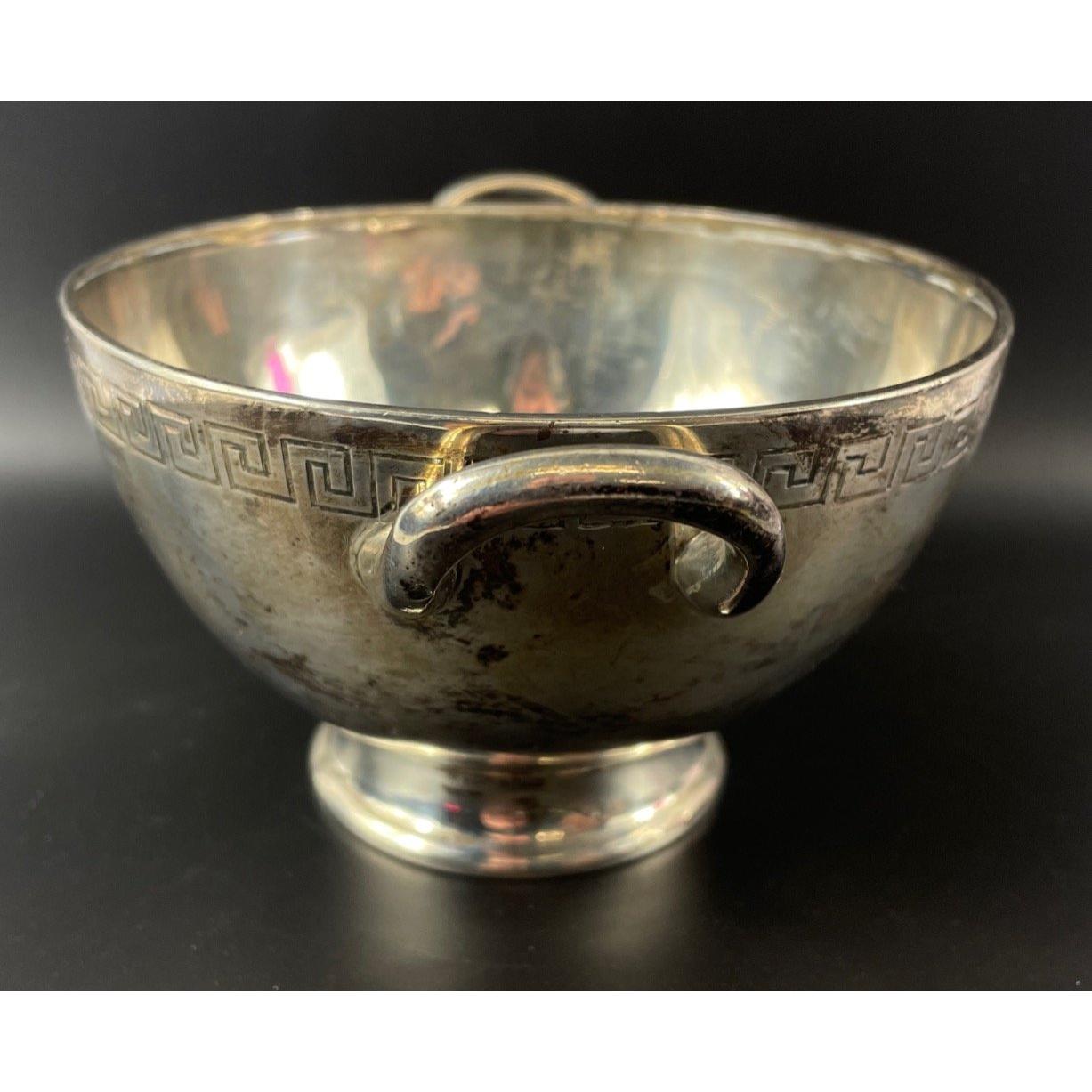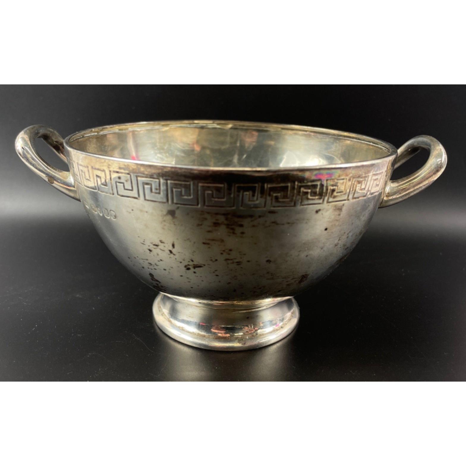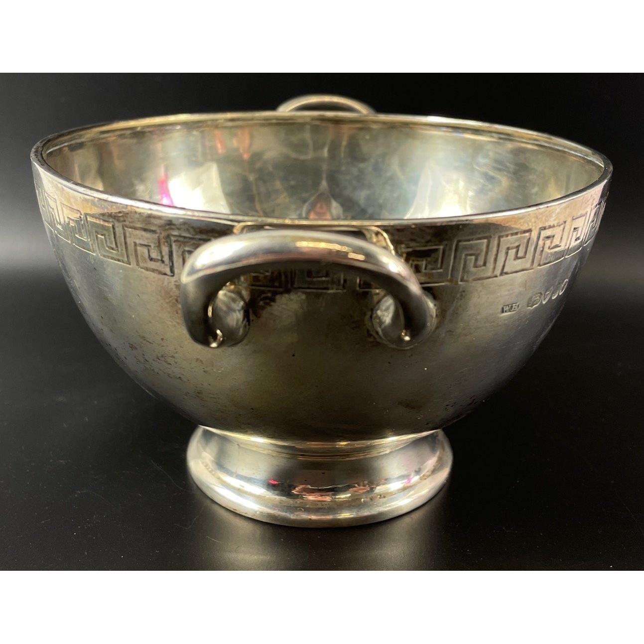 A SILVER Hallmarked London raised bowl with Greek Key design, twin handles 1848 including a Victoria Head stamped - (maker stamp WH) William Holmes - weight 190g approx - dimensions 7.5cm height x 16cm diameter (incl handles)