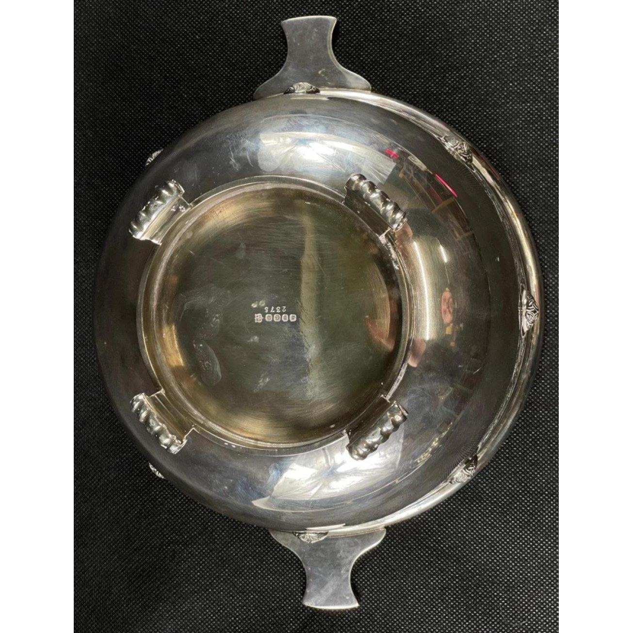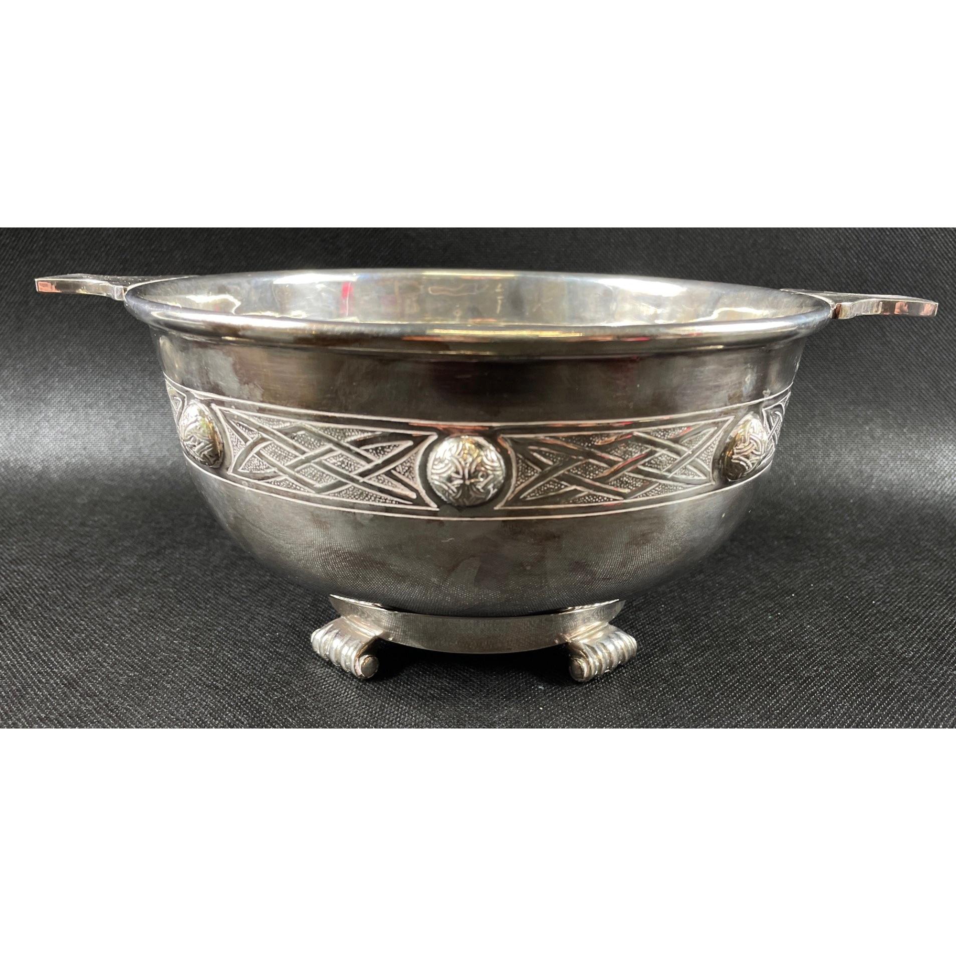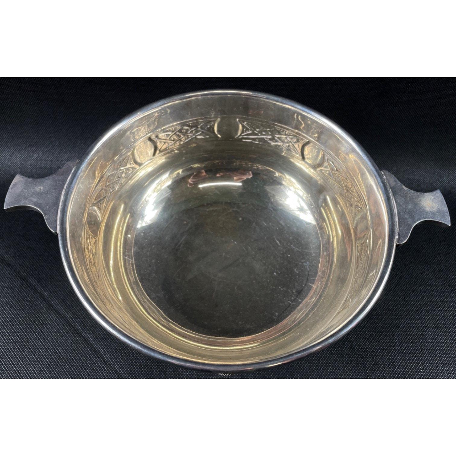 A large VINTAGE EPBM stamped two handled large bowl/quaich on four scroll feet with an outer pattern by silversmiths MB and Co 2375 - weight 720g - dimensions 26.5cm diameter from handle to handle x 11cm height approx