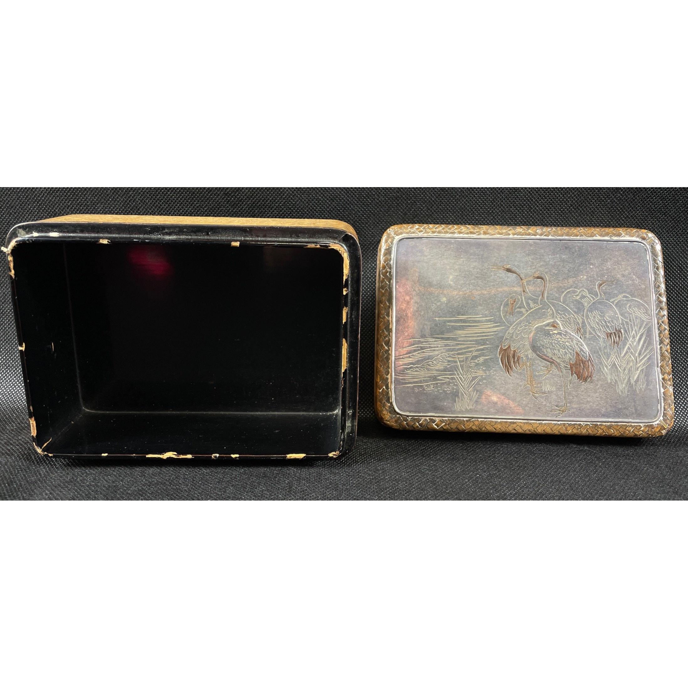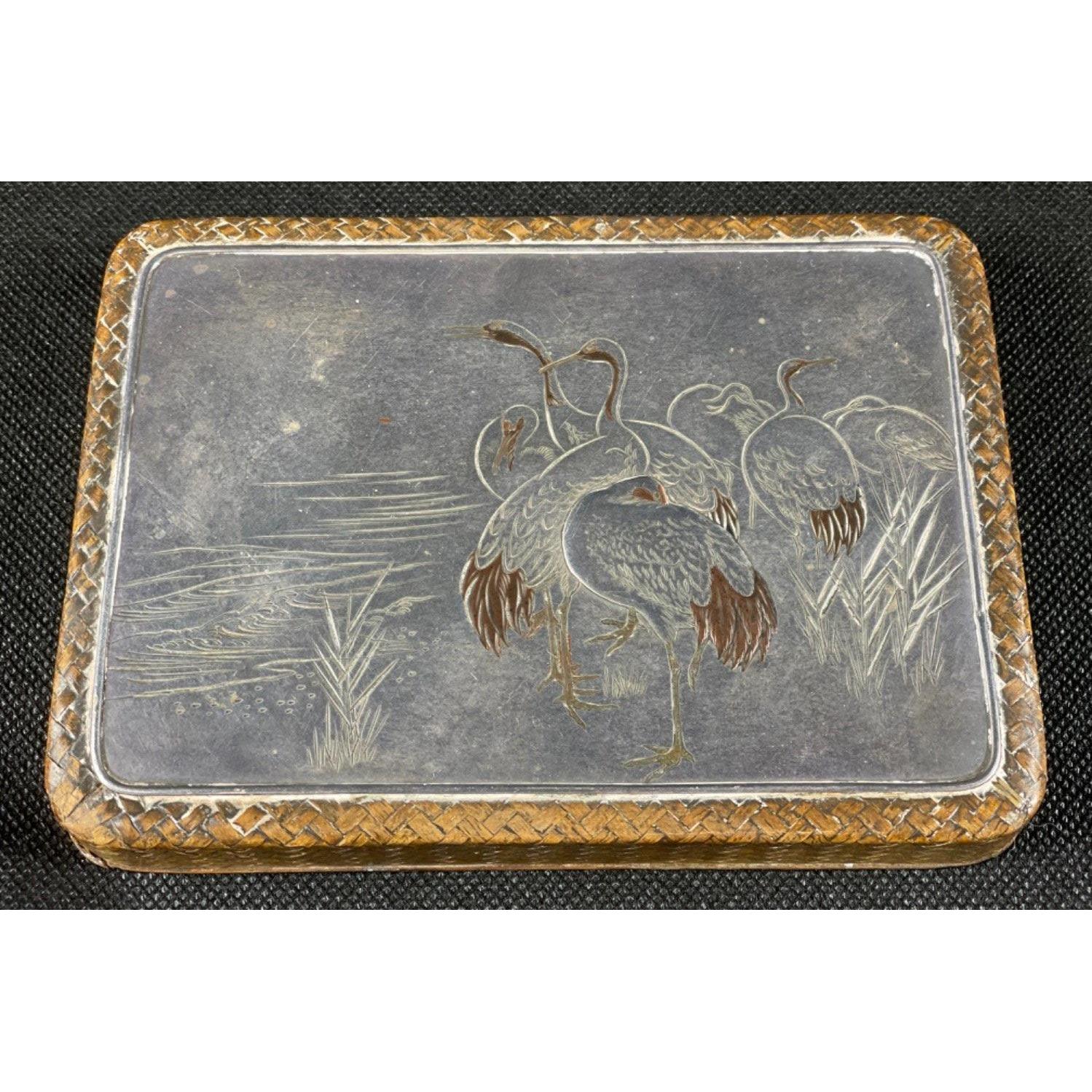 An early 20th century silvered and copper highlighted exotic bird patterned lidded jewellery box, inner lacquer lined with an UNUSUAL reed basket-weave exterior - super quality! - dimensions 14.5cm length x 10.5cm depth x 5.5cm height approx - showing slight wear and tear commensurate with age.