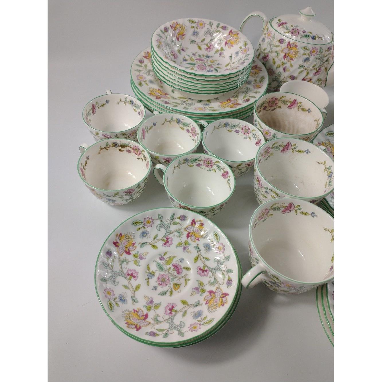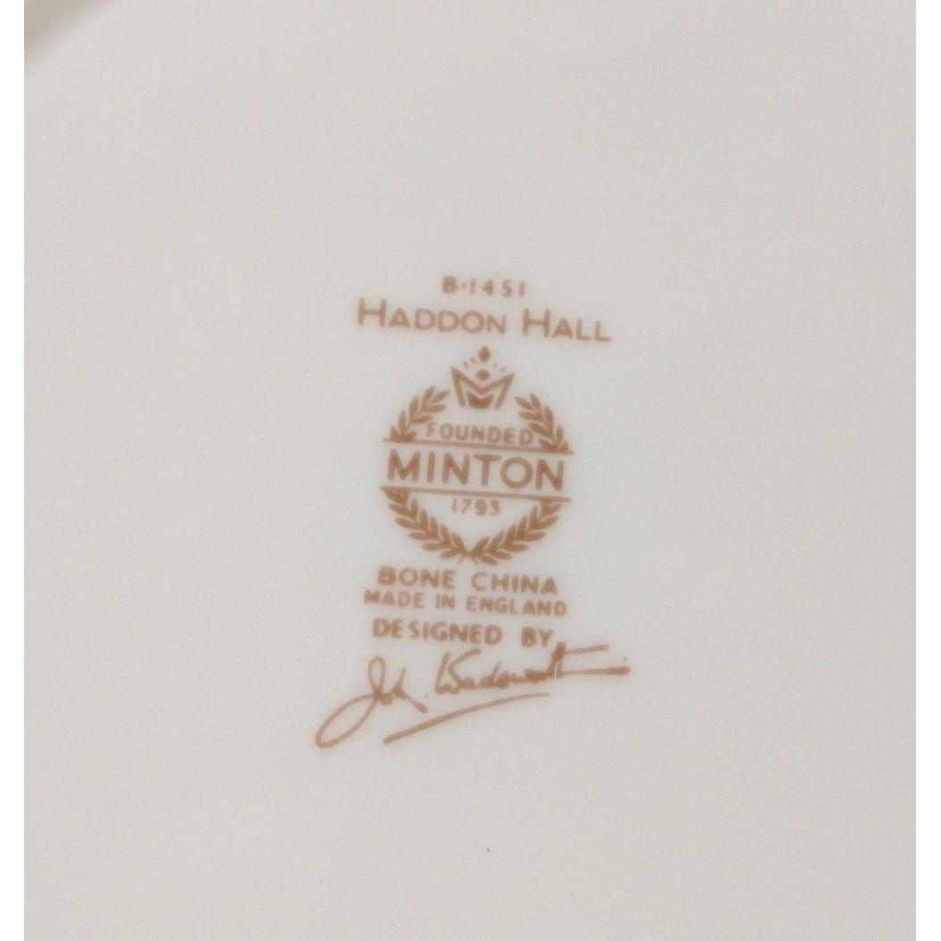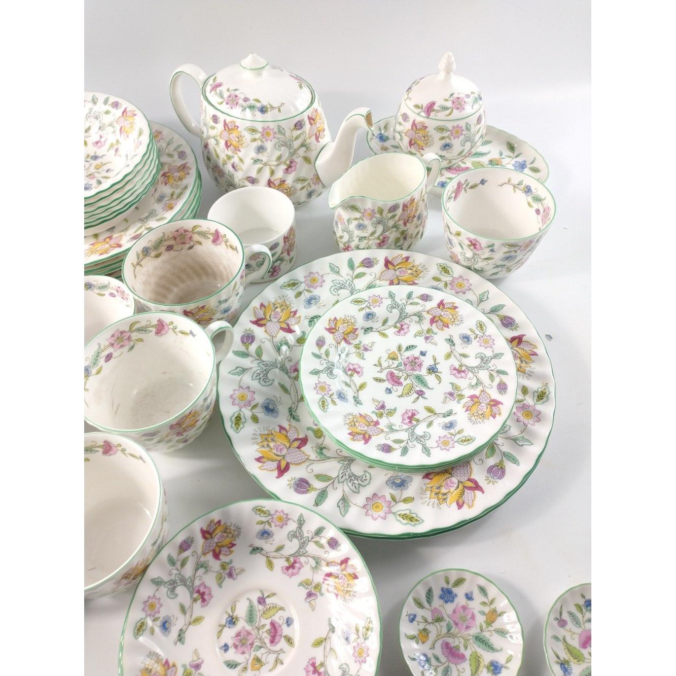 Collectable - a part MINTON HADDON HALL dinner service to include 5 cups (9cm), 3 cups (10cm 1 stained inside), 6 bowls (17cm), 4 bowls (23cm), 3 plates (27cm), 4 plates (17cm), 5 saucers (14.5cm), 3 saucers (15.5cm), 2 butter dishes (8cm), 1 milk jug, 1 sugar bowl (10cm), 1 sugar bowl (8cm), 1 oval trinket dish (22cm) and 1 lidded trinket dish (13cm tall)