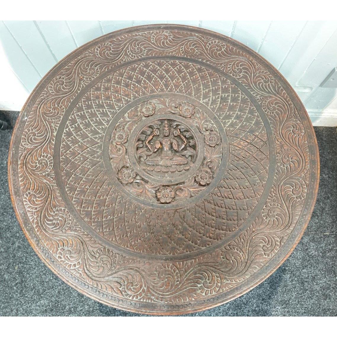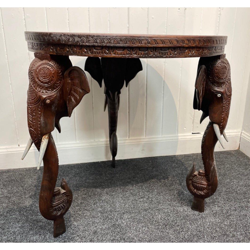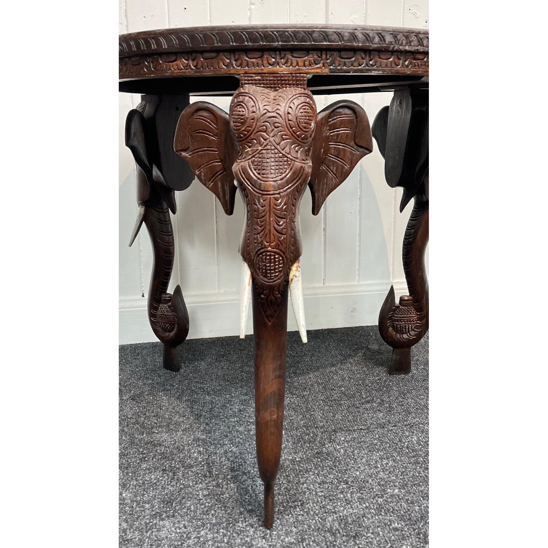 An INDIAN inspired hand carved side table with elephant head and tusks form legs - there is no ivory in this table only white wooden painted tusks and beads for eyes - the elephant form trunks also act as legs - dimensions 53cm diameter x 54cm height approx