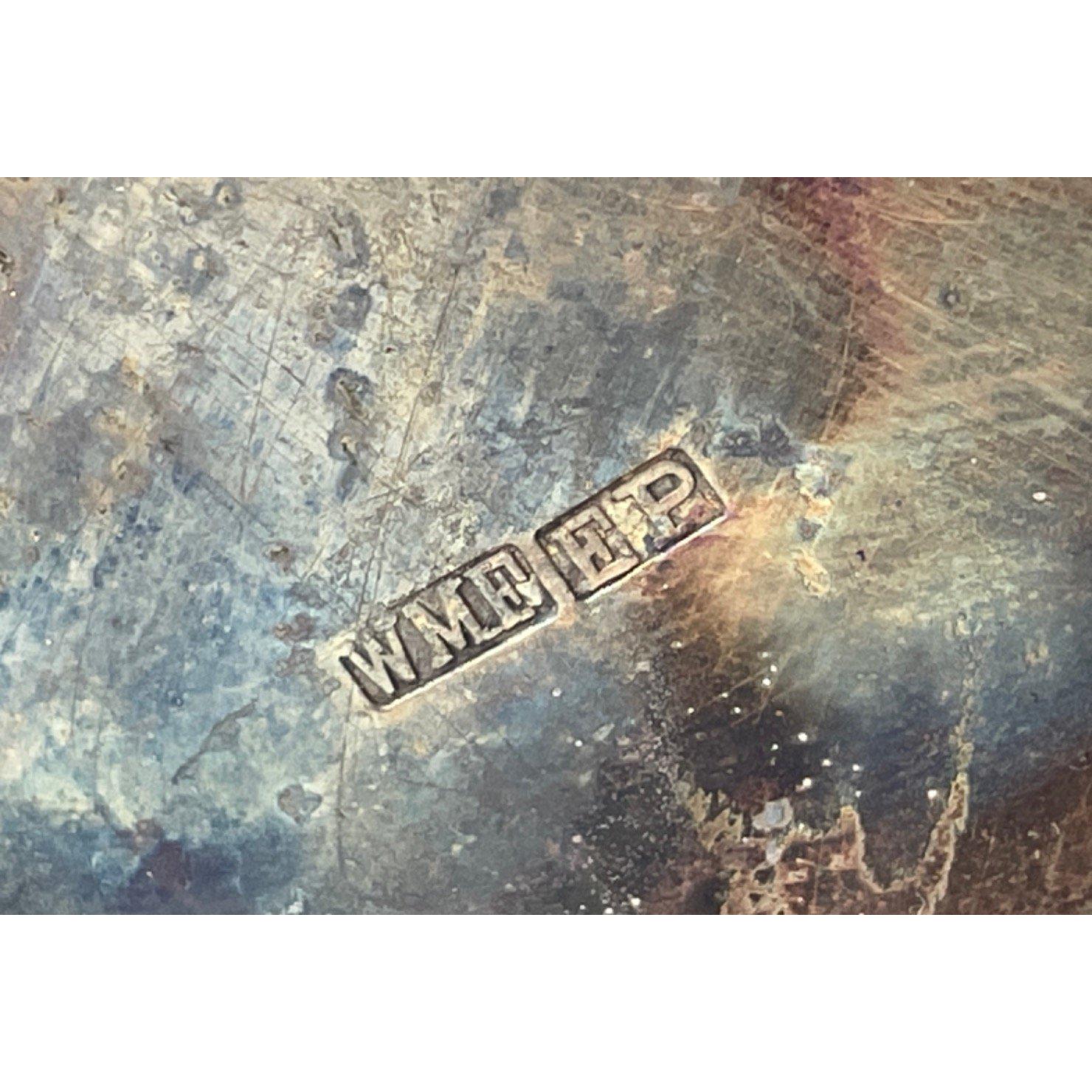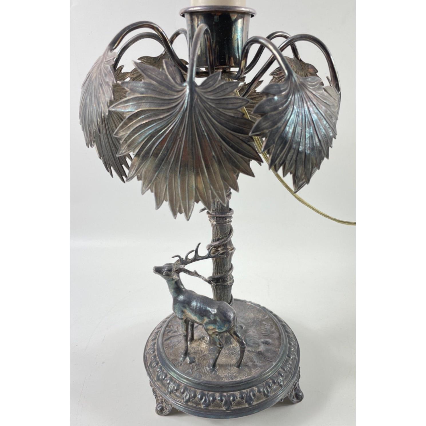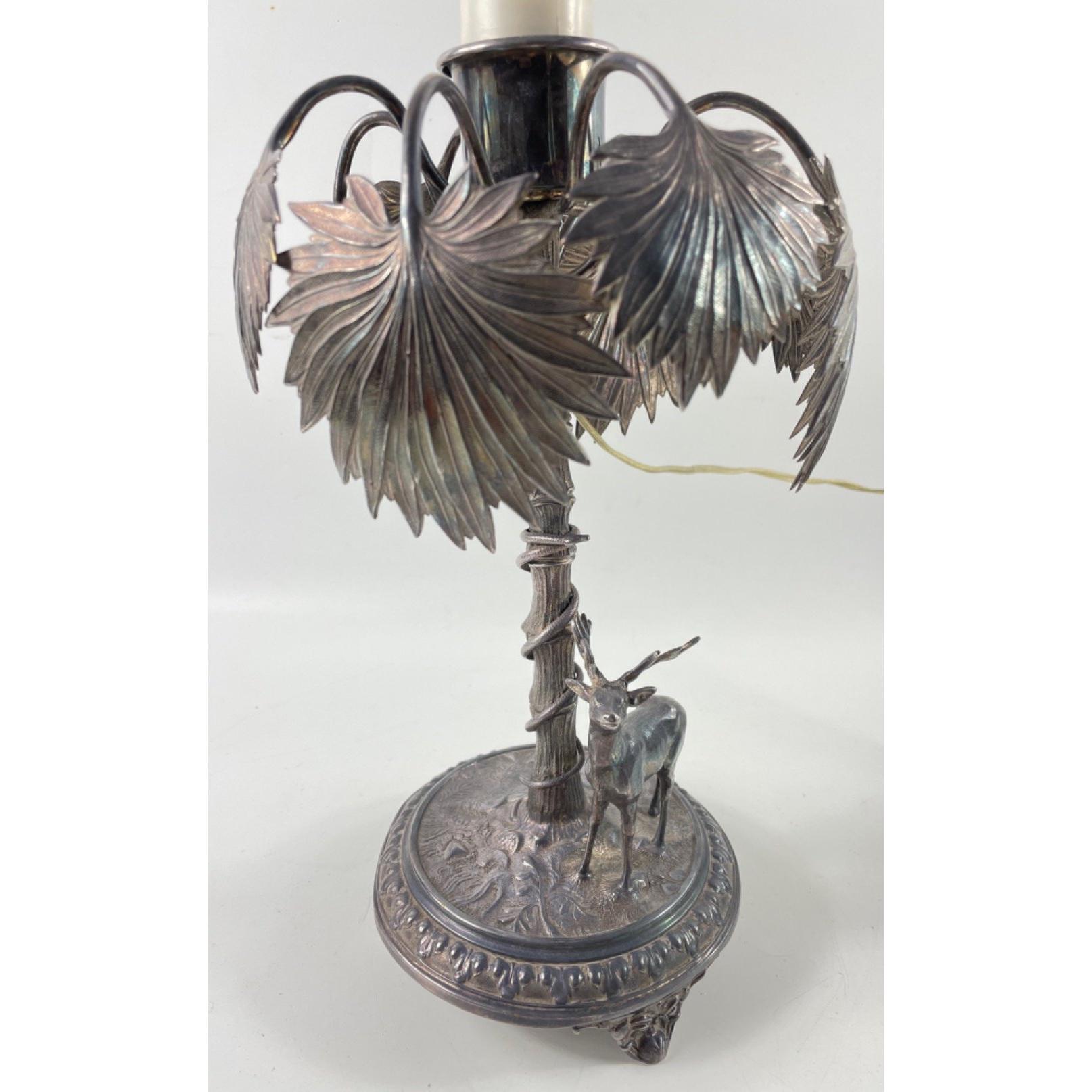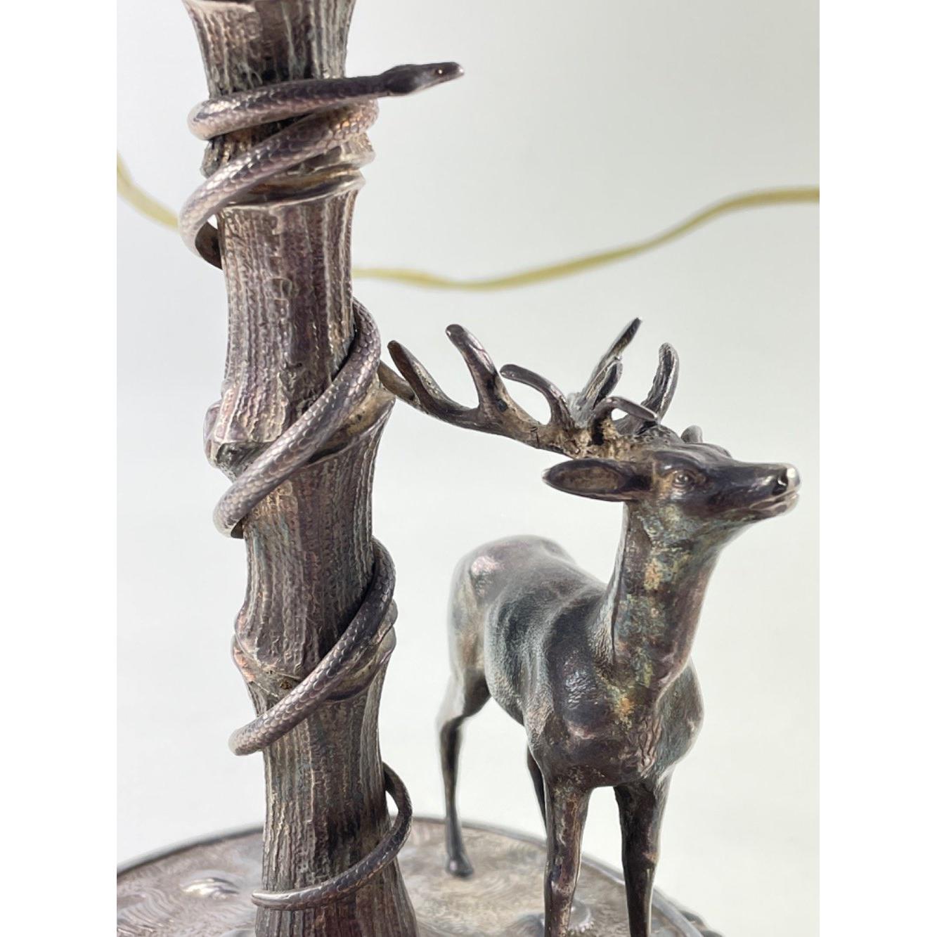 A VINTAGE WMF EP stamped white metal feature table lamp with shade depicting a SCOTTISH STAG with 11 point antlers, a tree serpent with 8 large leaves atop, the lamp in candle form, the base raised on three ornate feet - full height 60cm approx