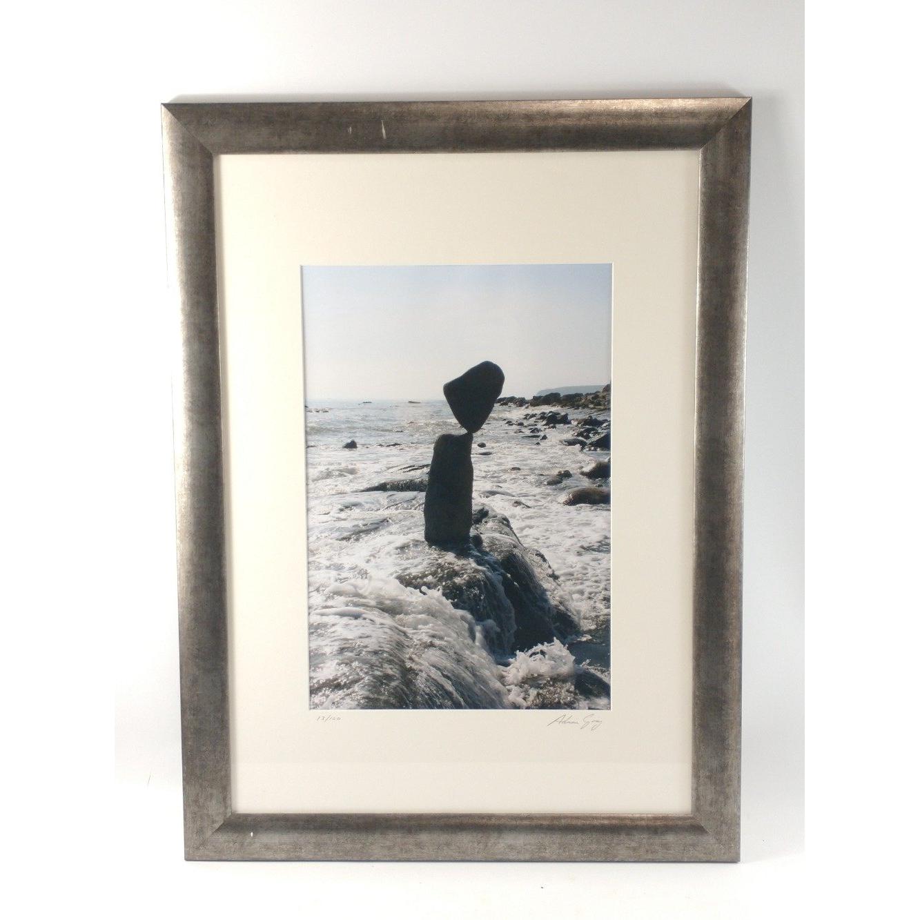 Two photographic prints of balancing stones signed in pencil by ADRIAN GRAY, the first being a limited edition (13/100) frame size 80x60cm visible work 4732cm approx, the second piece measures 60x80cm, visible work 33x46cm appro
