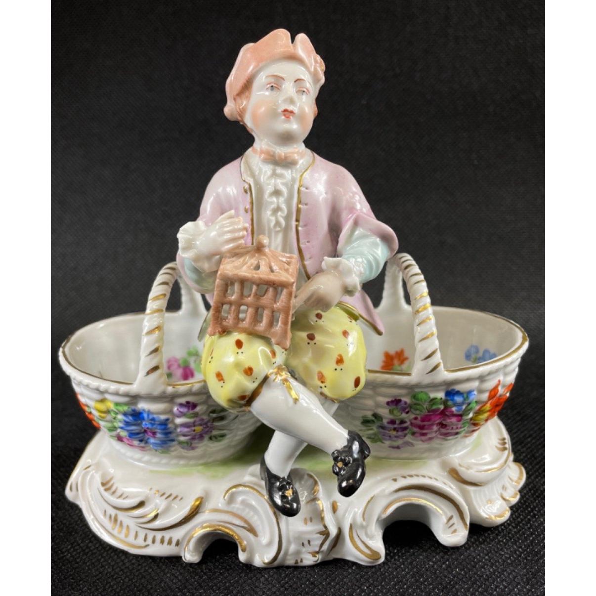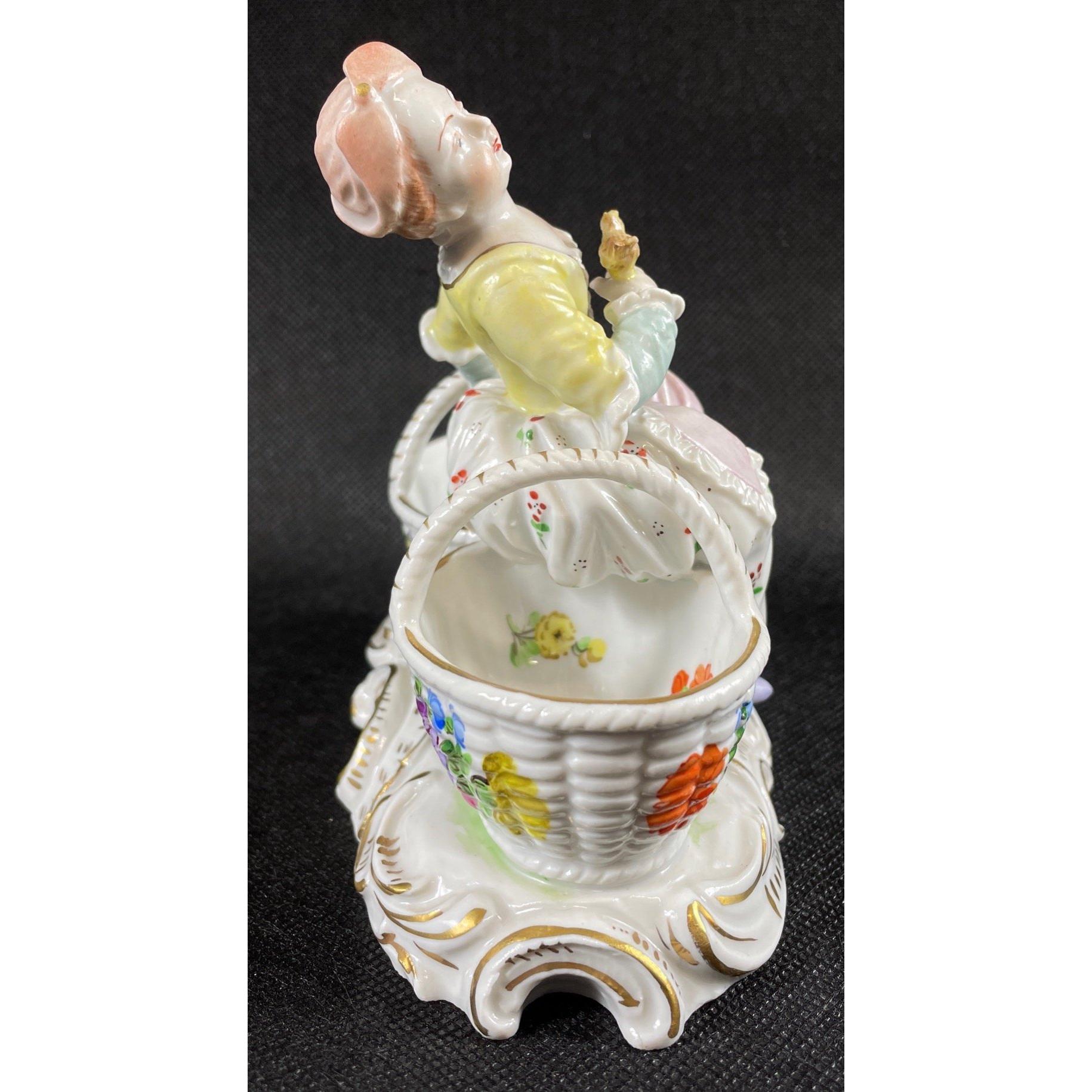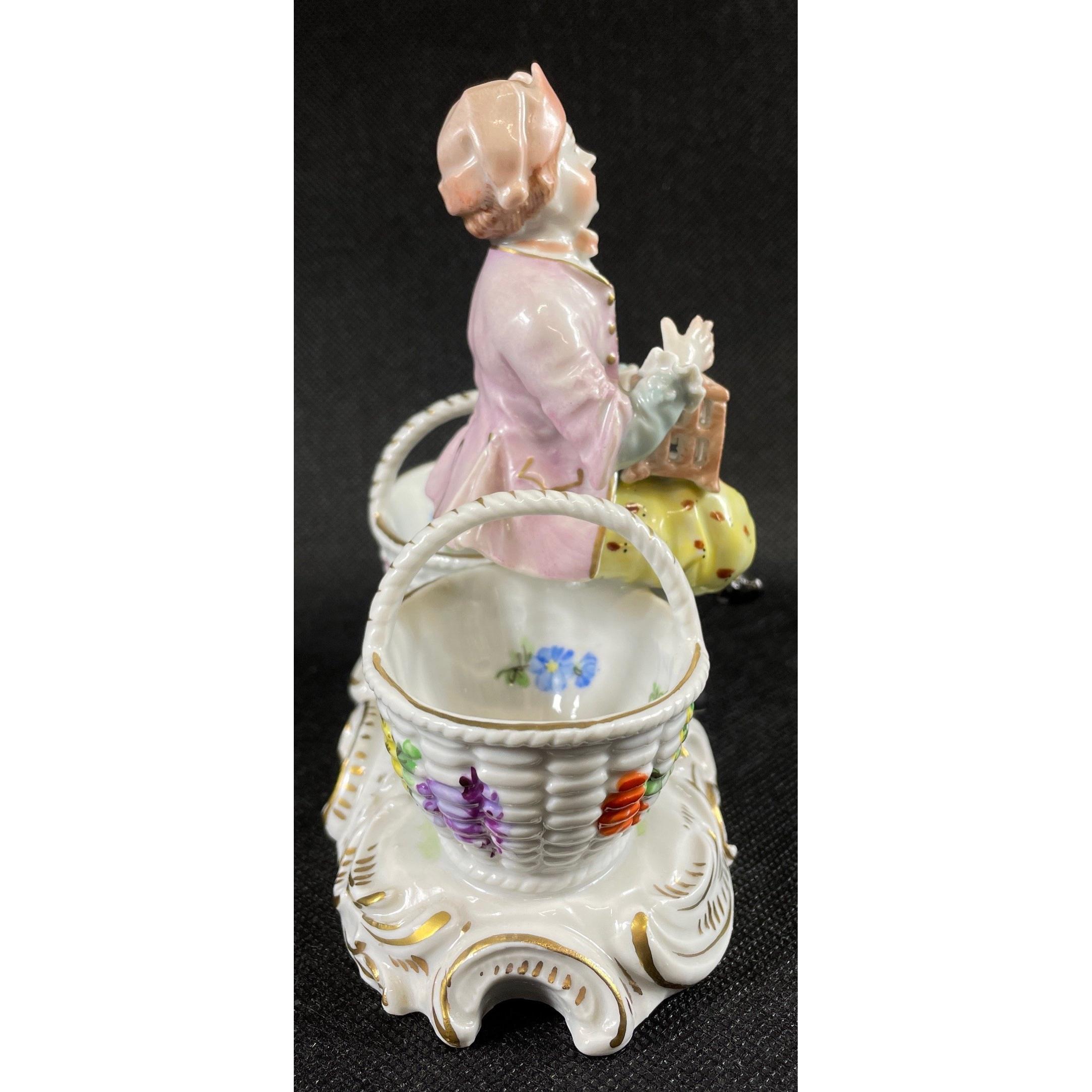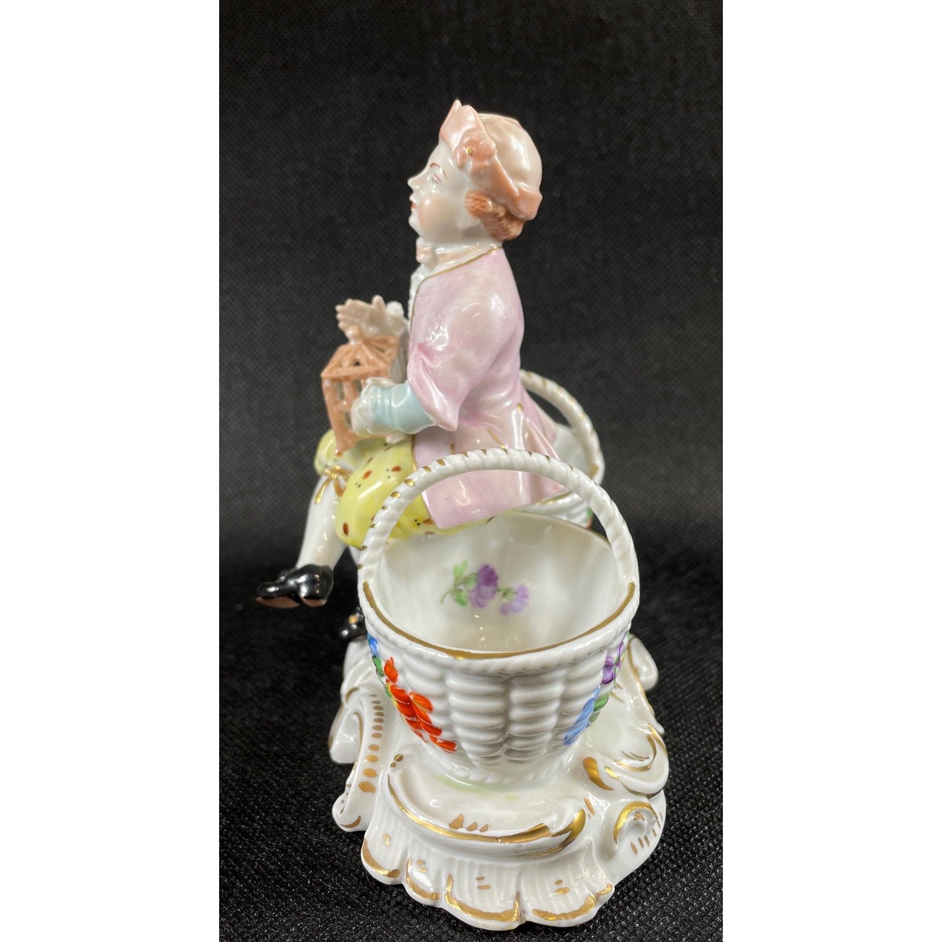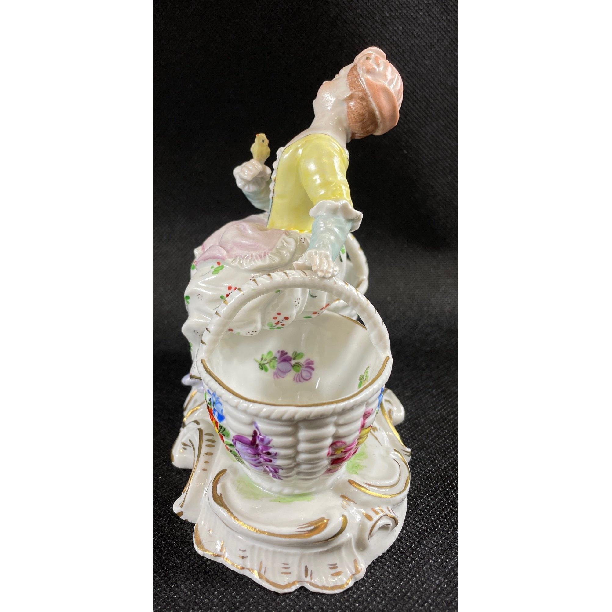 A pair of stamped-to-base DRESDEN figurines of a girl holding a bird and a boy with a bird cage, each piece with 2 baskets, 13cm long, 13cm high, no chips Approx 2 pieces
