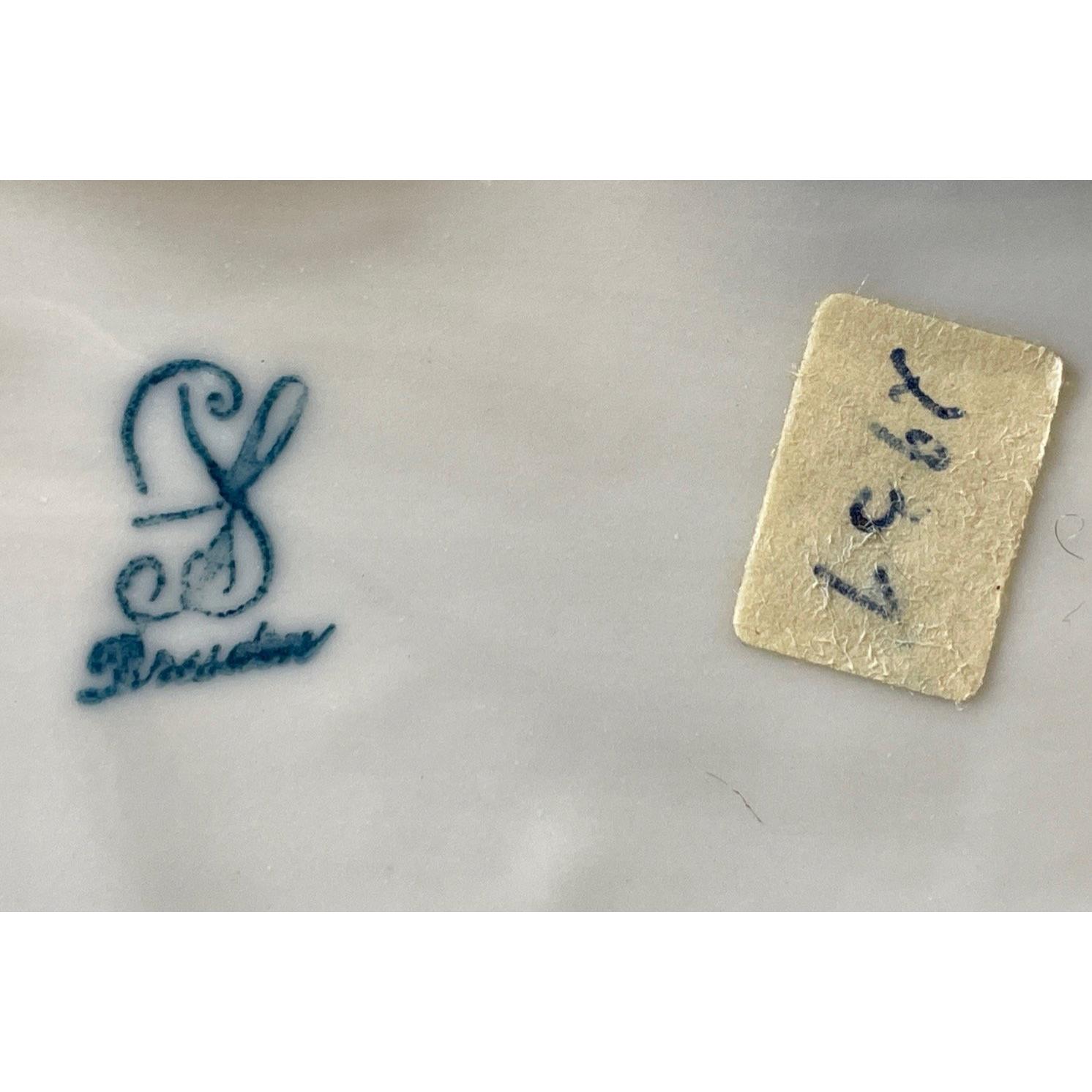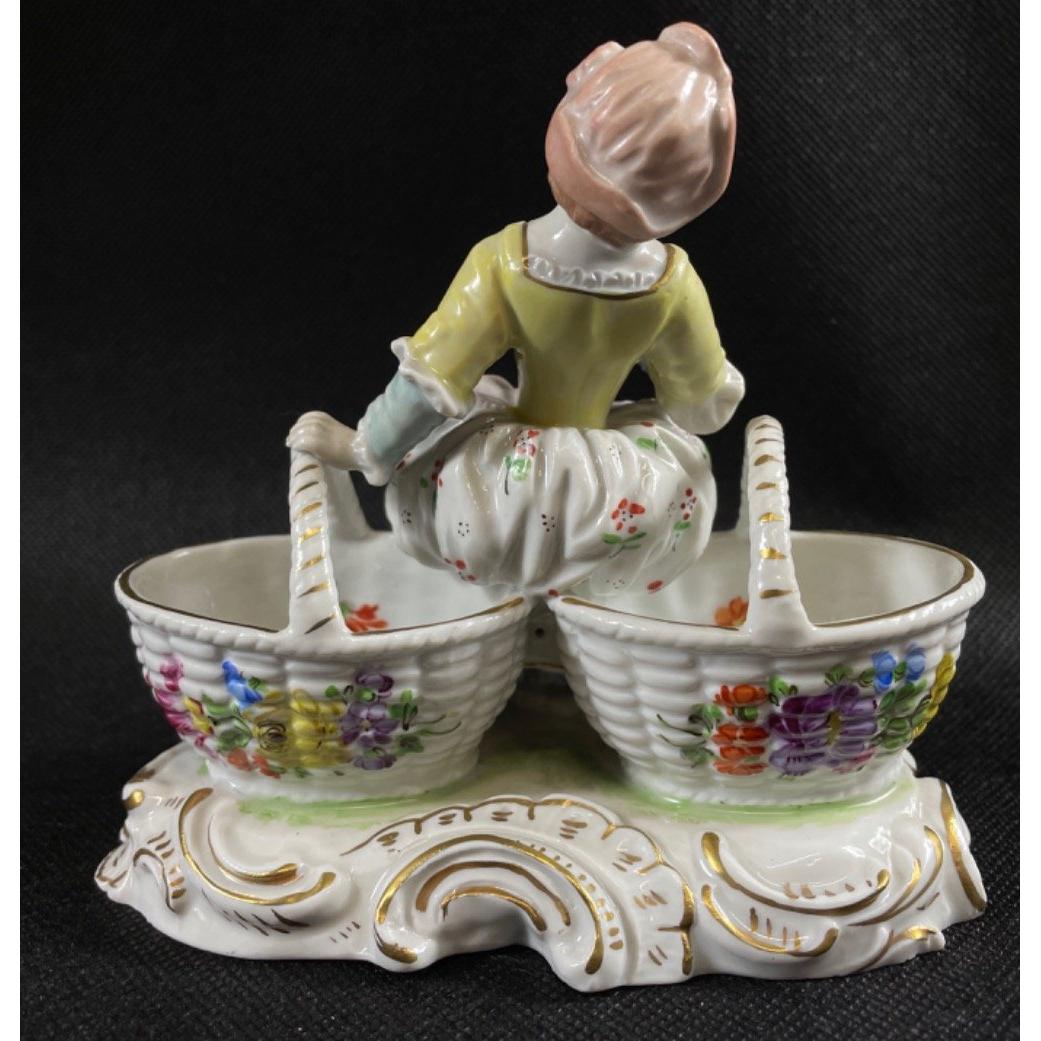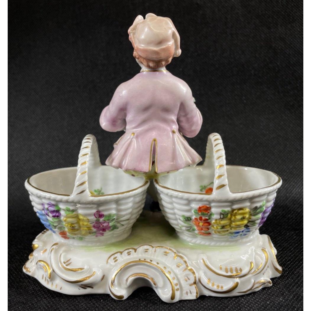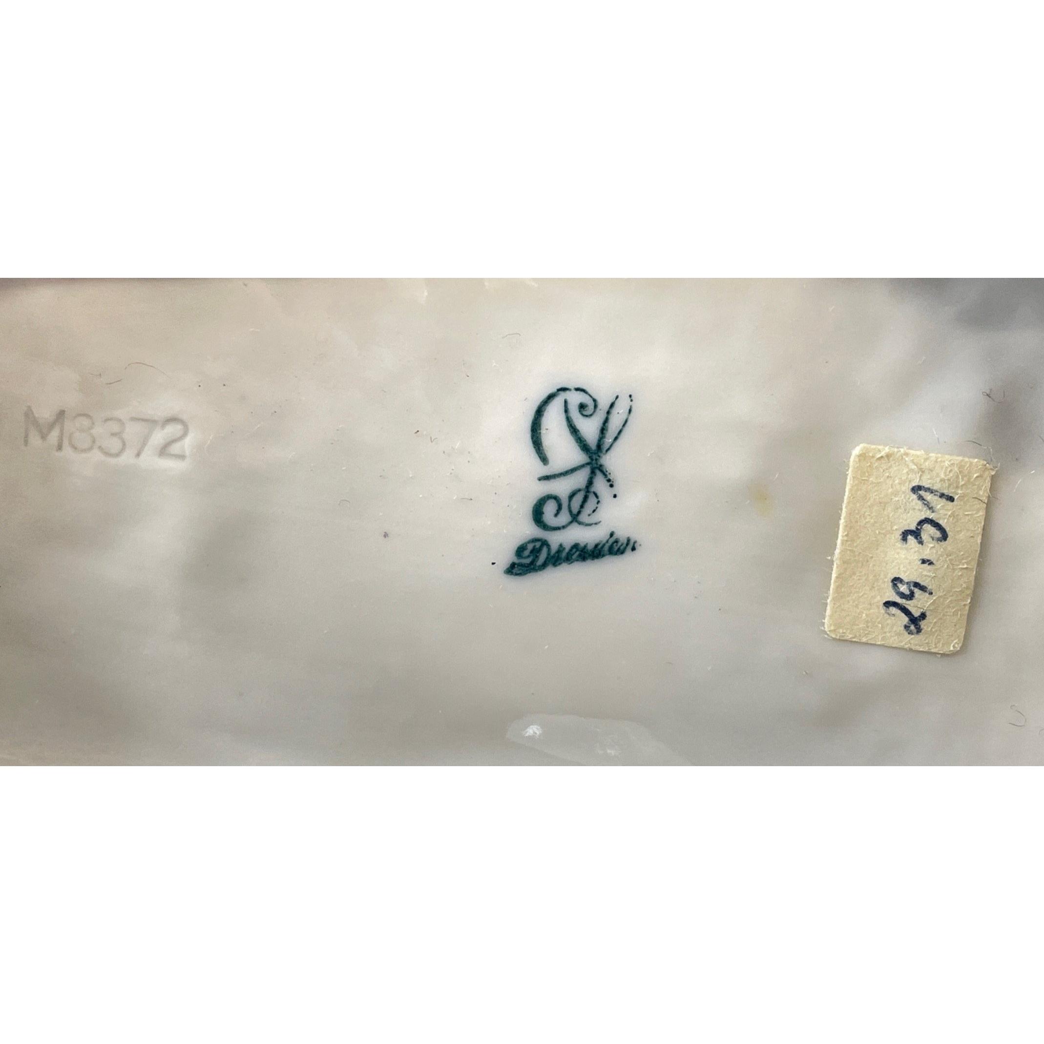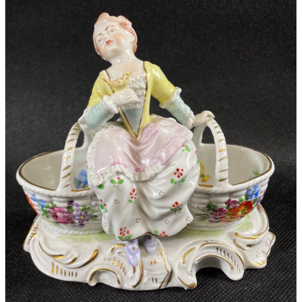 A pair of stamped-to-base DRESDEN figurines of a girl holding a bird and a boy with a bird cage, each piece with 2 baskets, 13cm long, 13cm high, no chips Approx 2 pieces