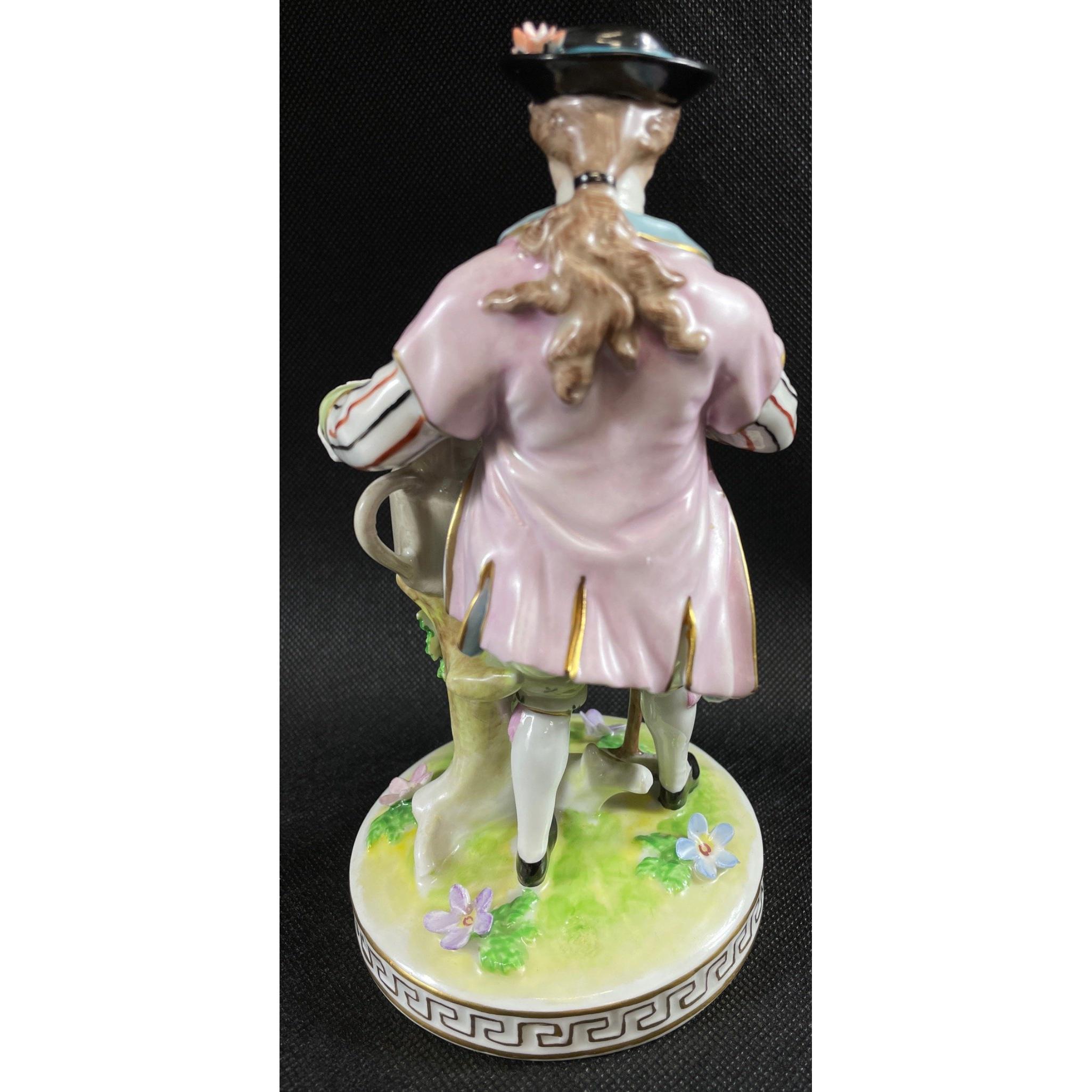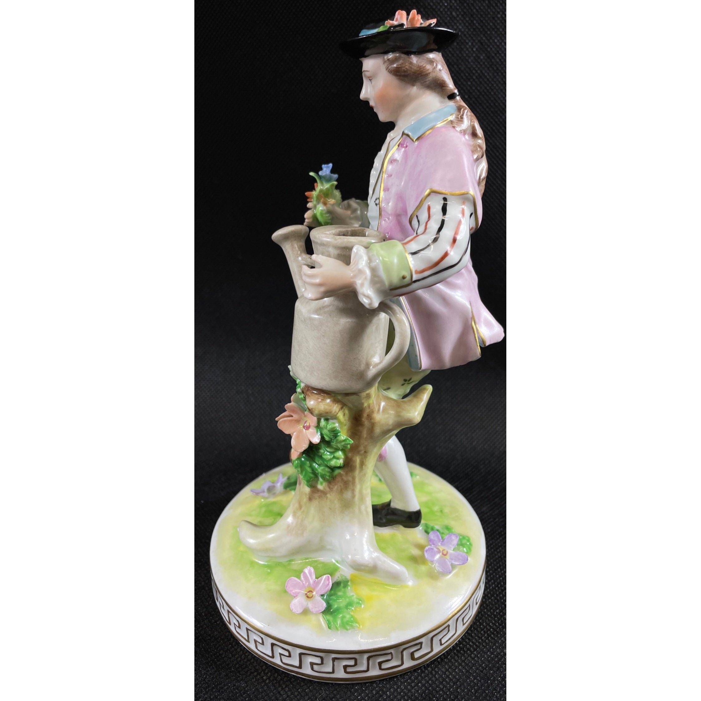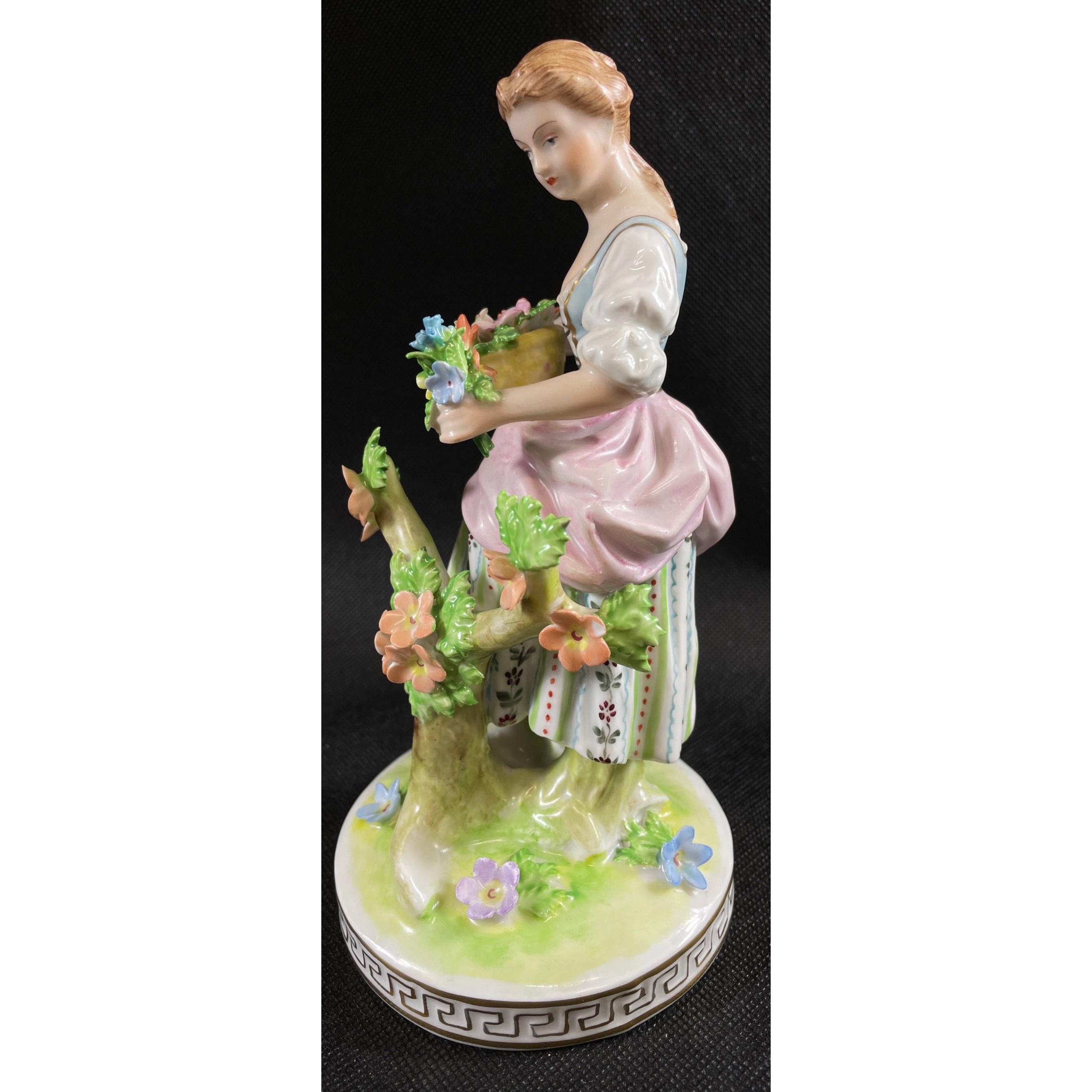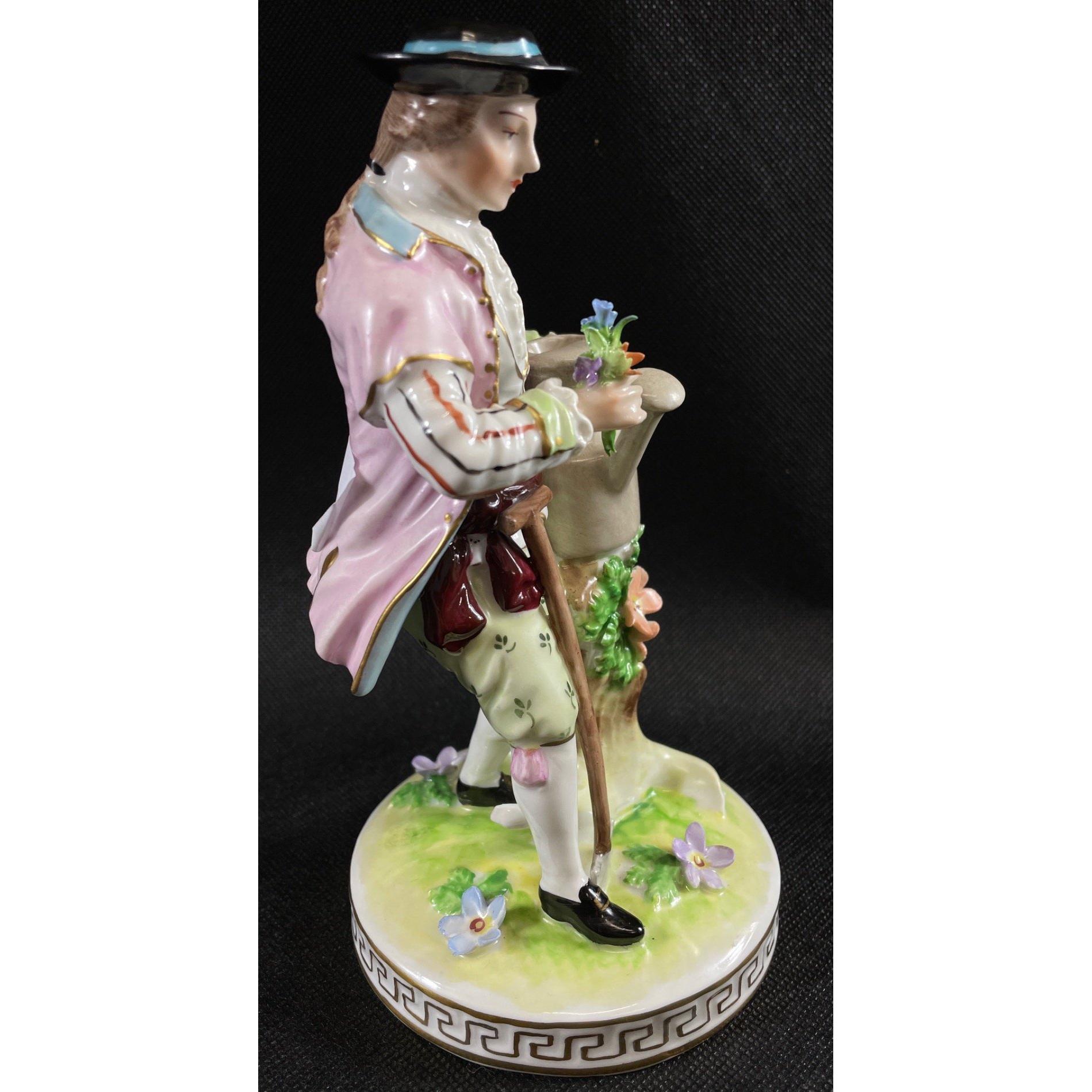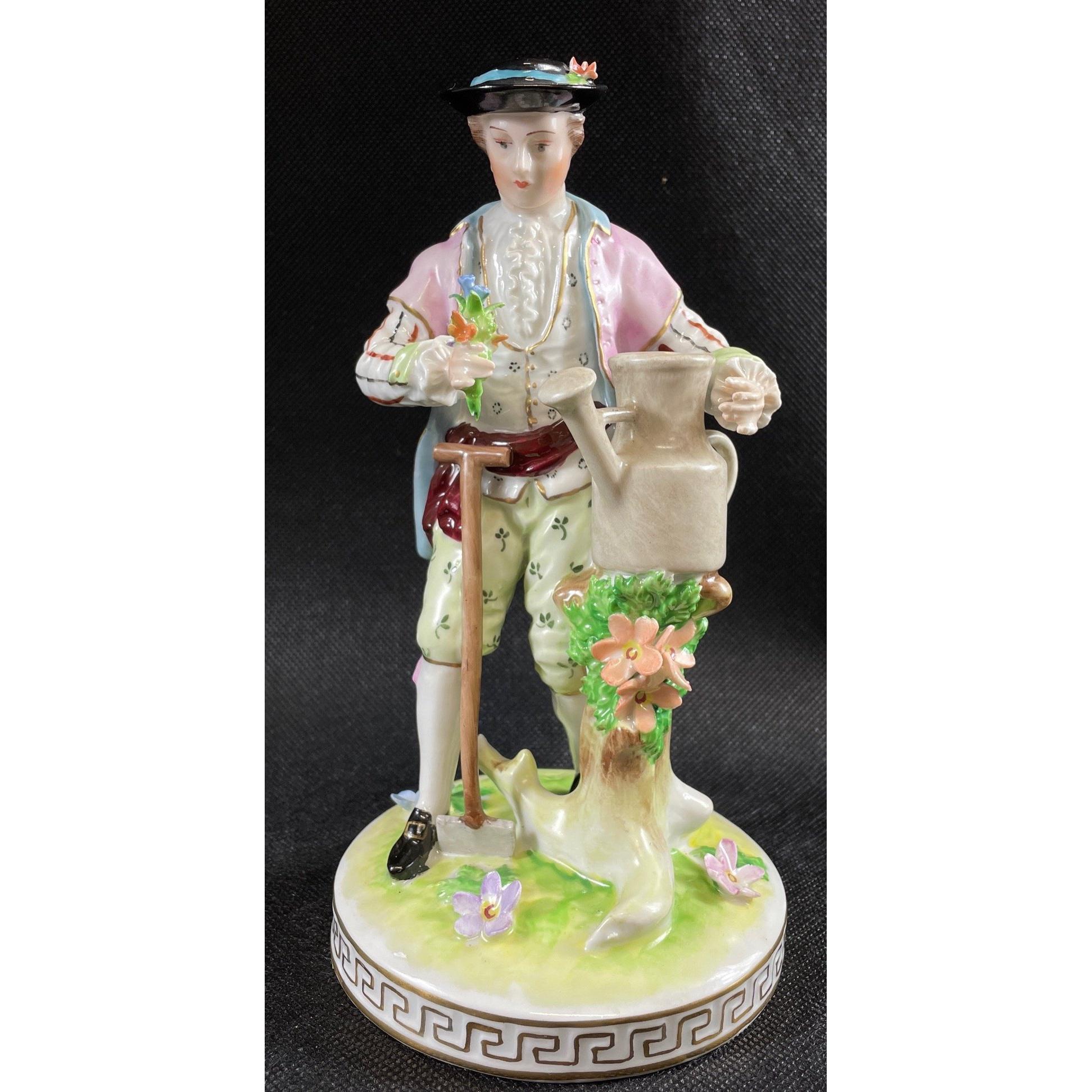 Two figurines labelled 'Original Dresden' and impressed 10890, of a man with a watering can, and a lady carrying a basket of flowers plus another bunch (a tiny chip missing from flower on man's hat) each stands approx 19cm tall