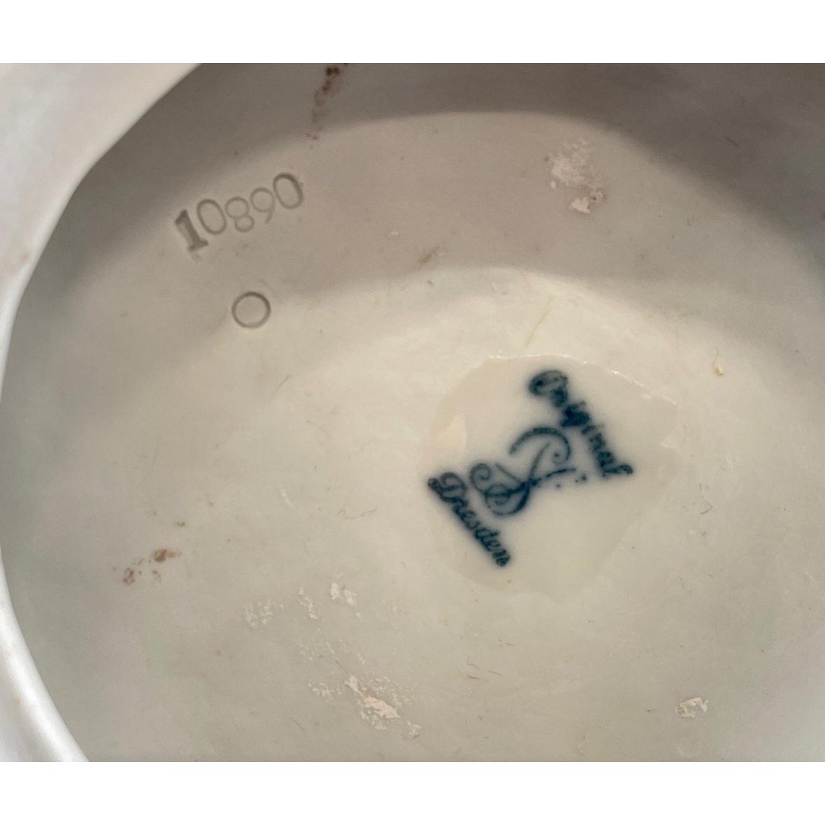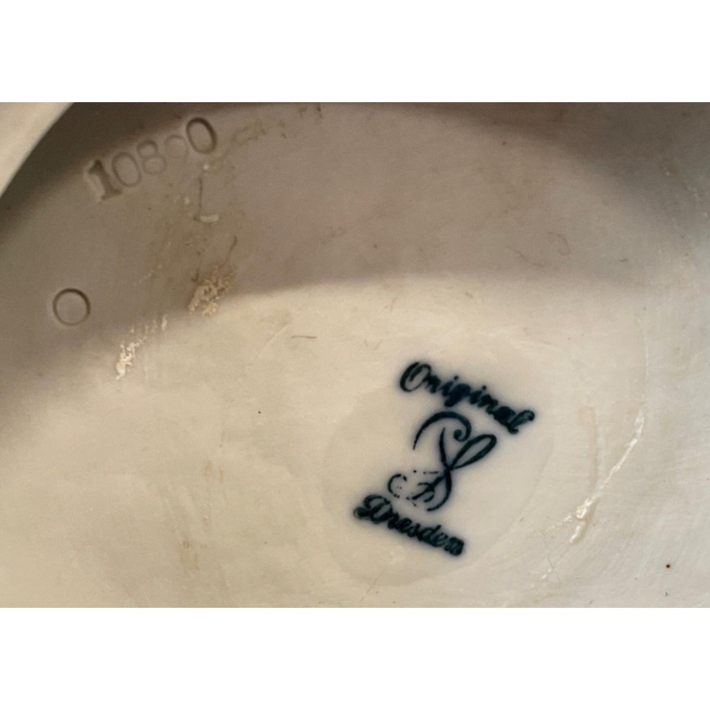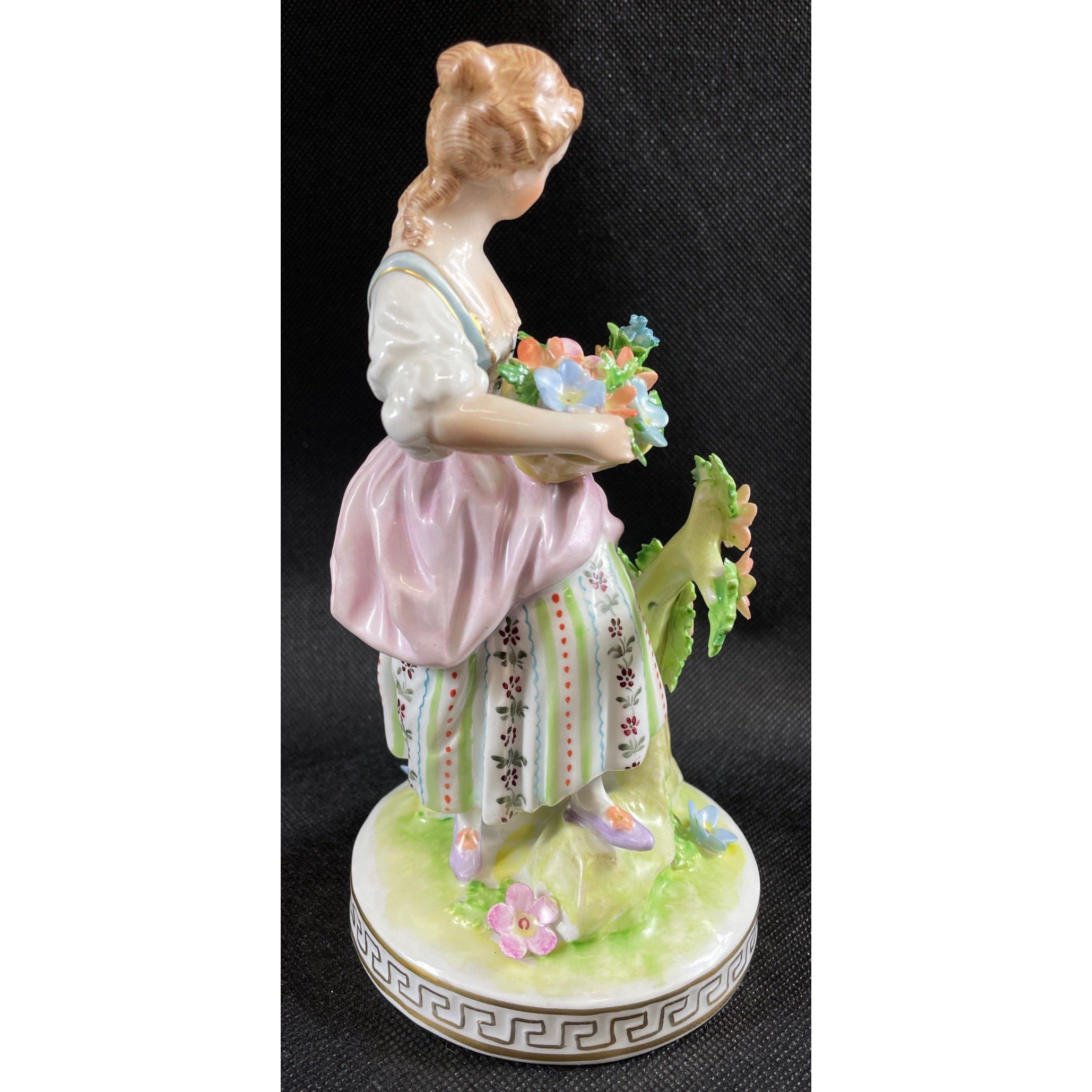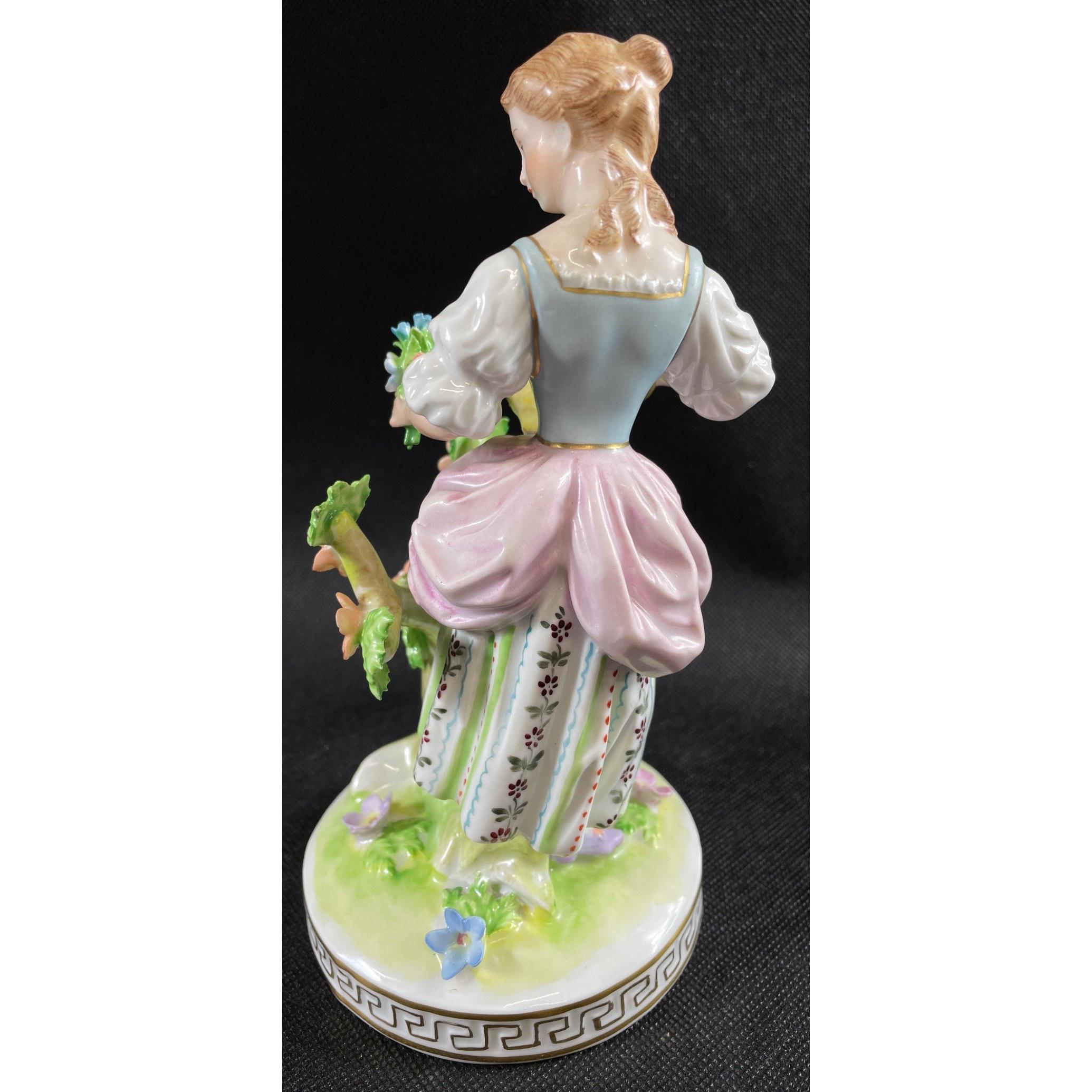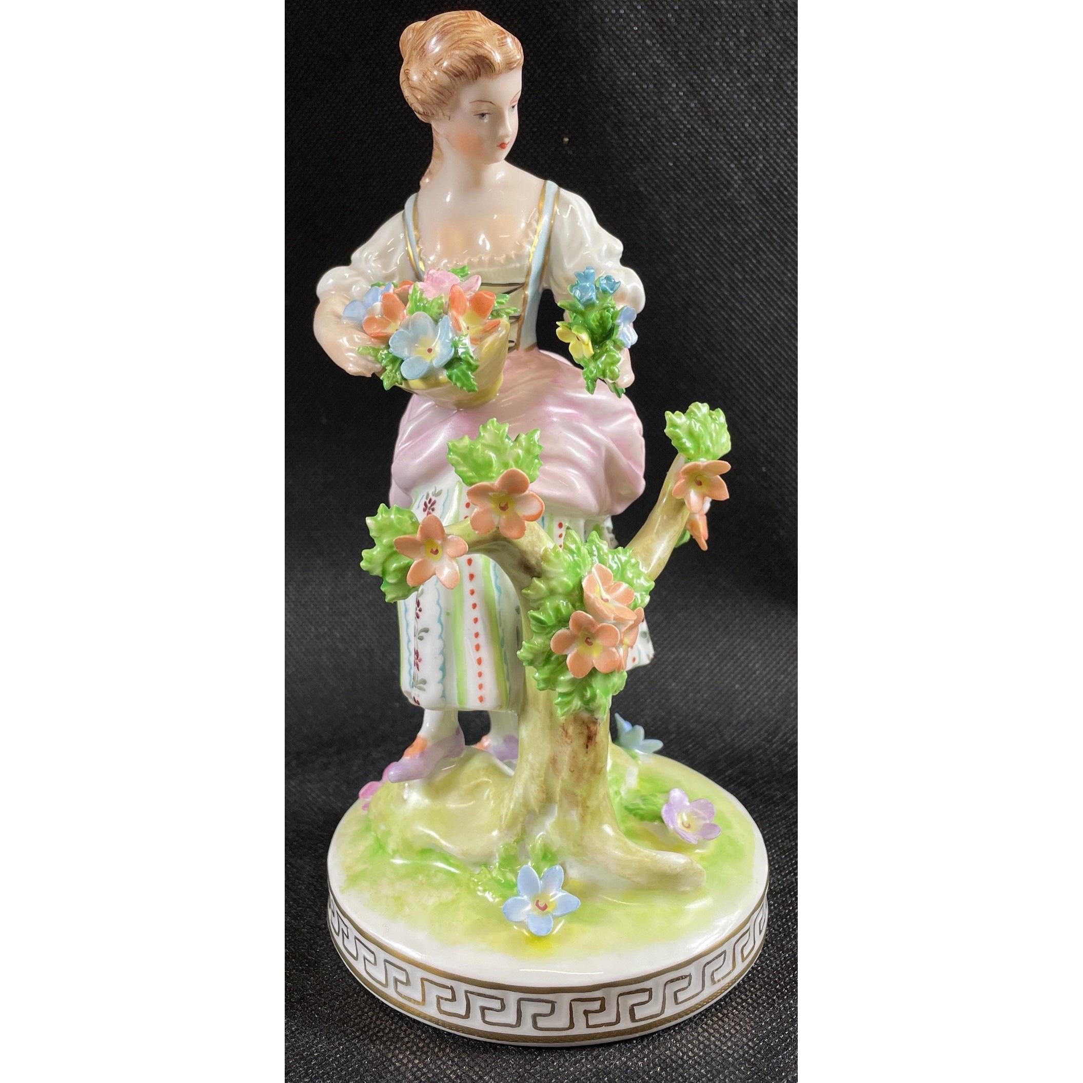 Two figurines labelled 'Original Dresden' and impressed 10890, of a man with a watering can, and a lady carrying a basket of flowers plus another bunch (a tiny chip missing from flower on man's hat) each stands approx 19cm tall