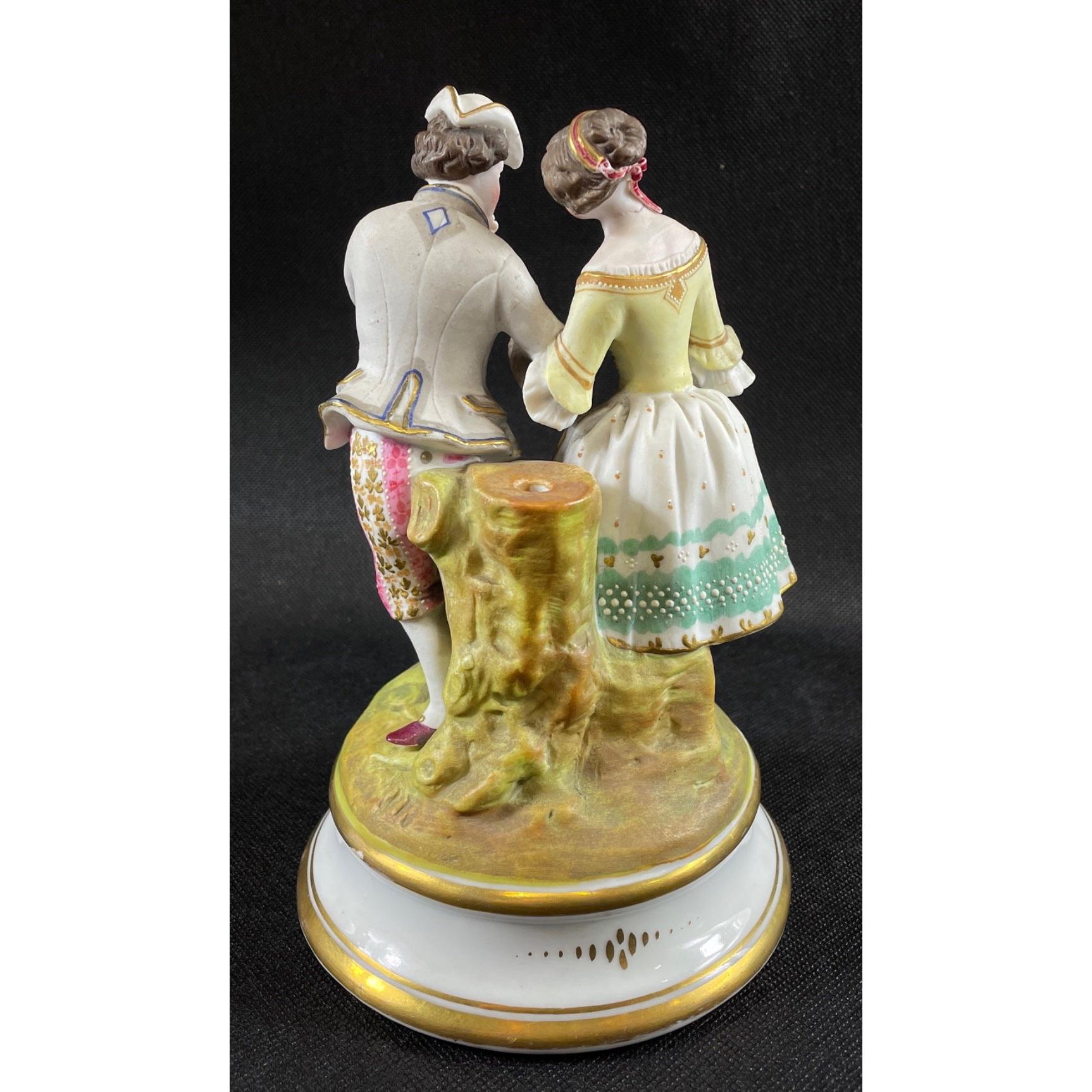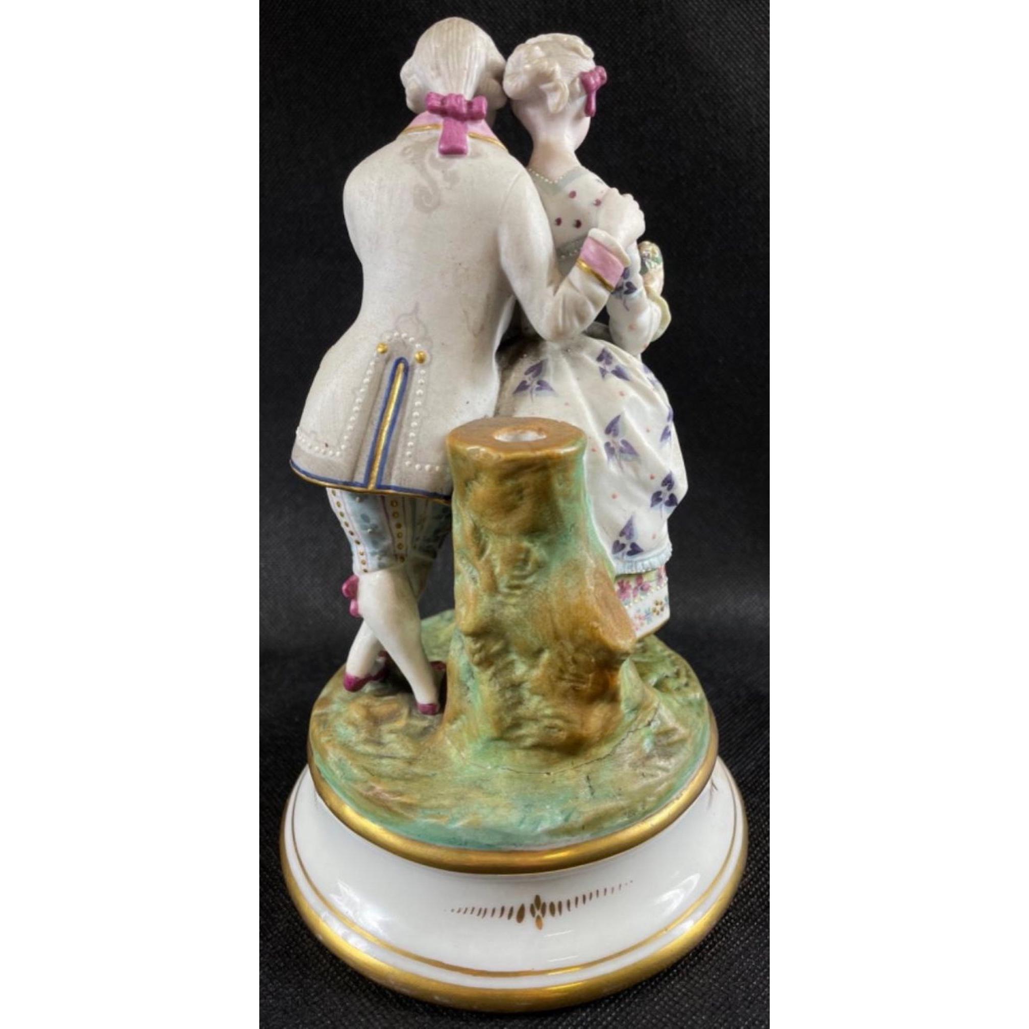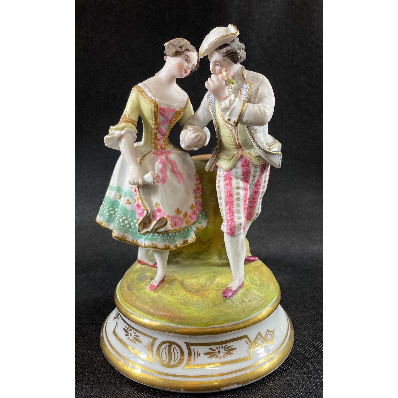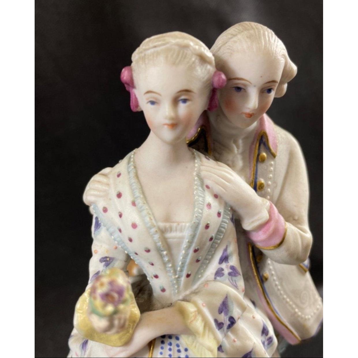 Two decorative figurines of loving couples, no maker's mark, the couple in pink is stamped 168 to base, the other, in blue, is stamped 242, each stands 20cmApprox 2 pieces