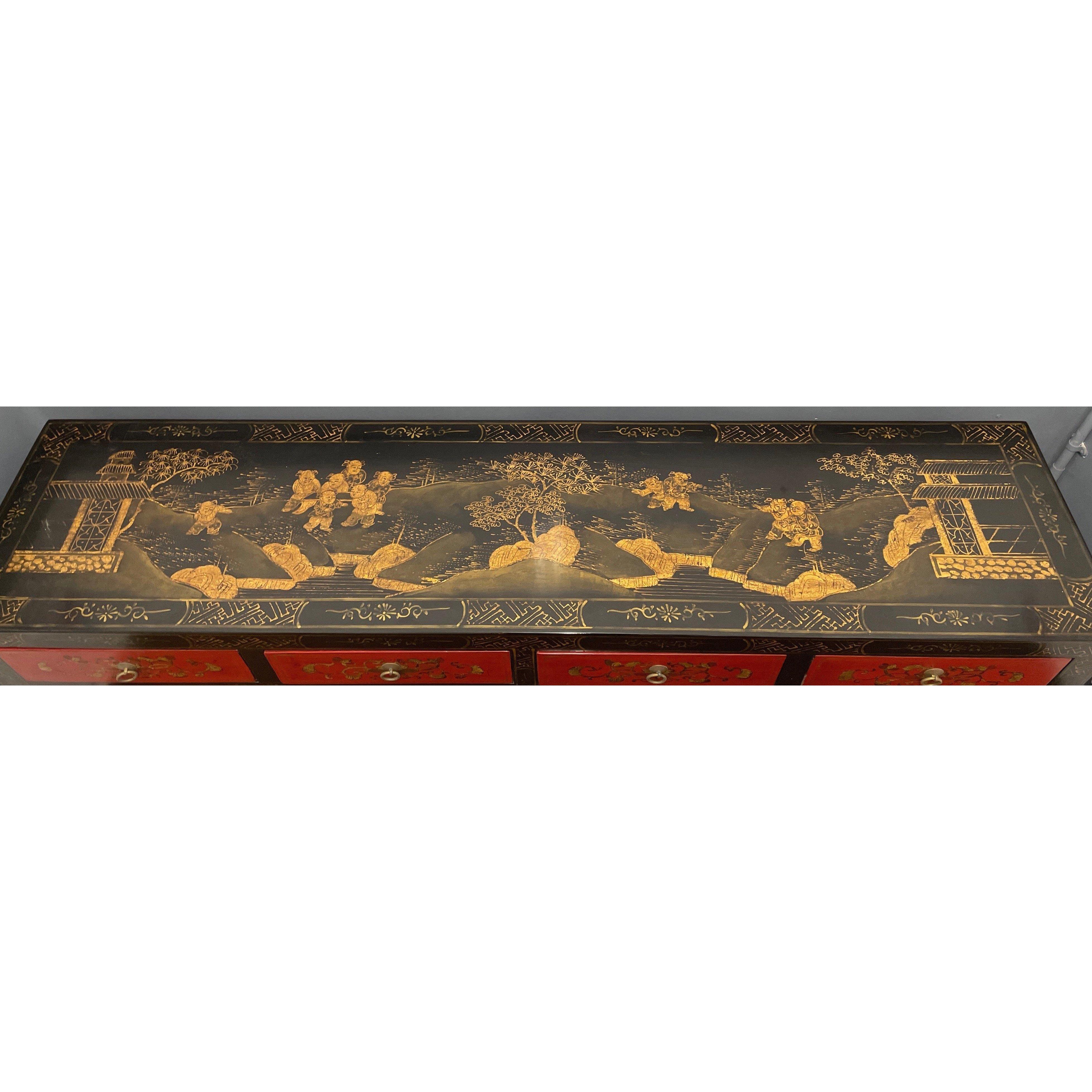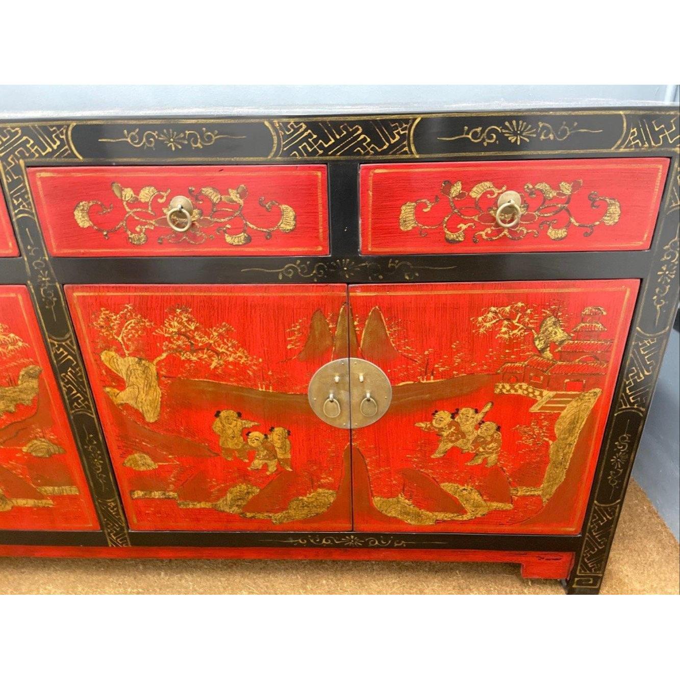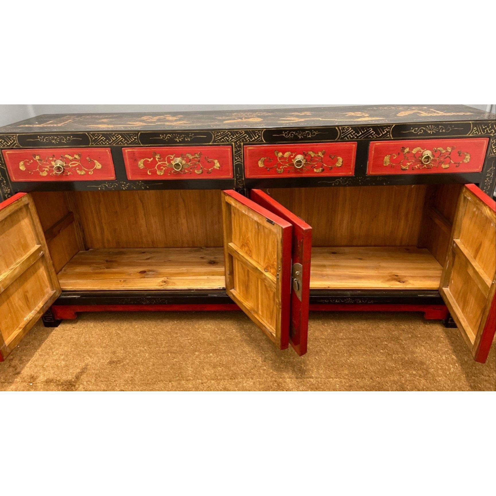 ORIENTAL decorative red gold and black lacquered based 4 drawer and 4 cupboard door sideboard - exceptional quality!W: 180cm approx H: 85cm approx D: 43cm approx