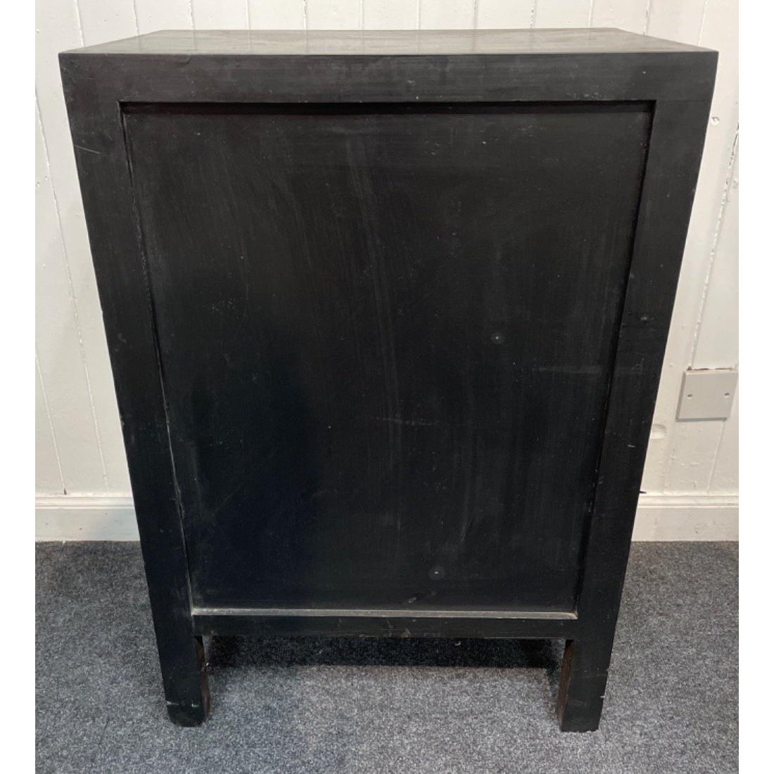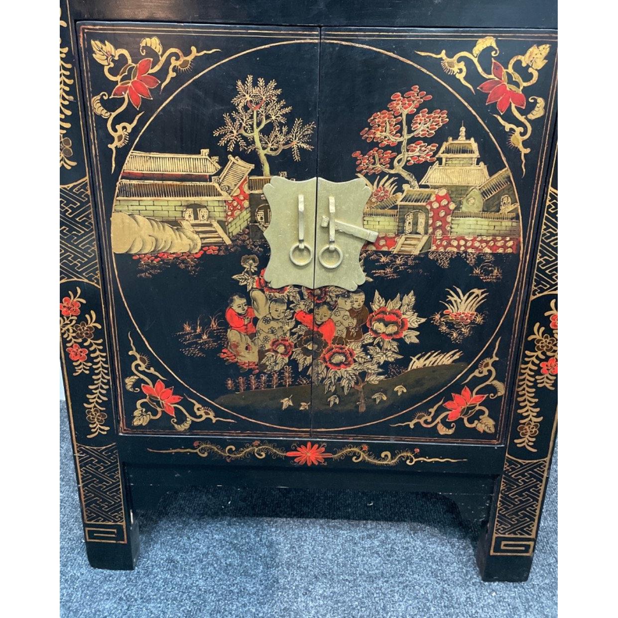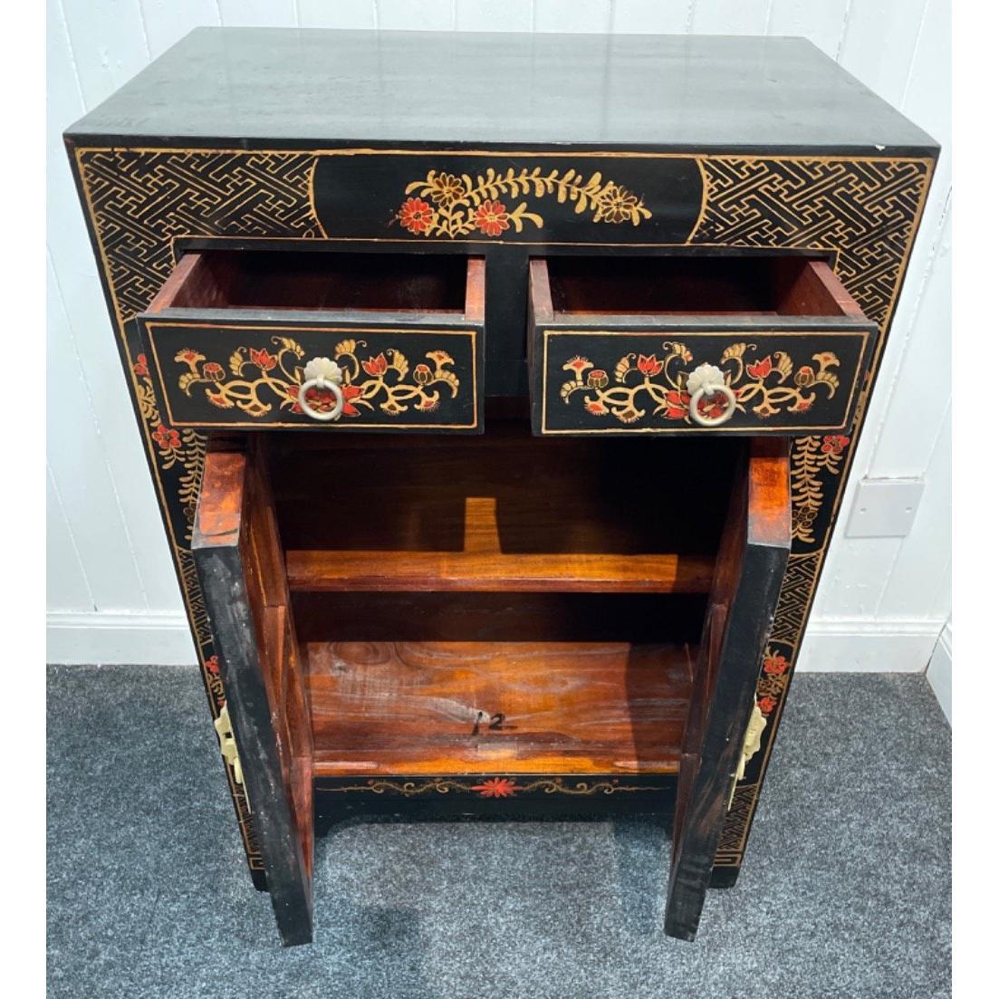 ORIENTAL decorative red and gold traditional design lacquered black based 2 door and two drawer side cabinet - unused item in storageW: 48cm approx H: 71cm approx D: 35cm approx