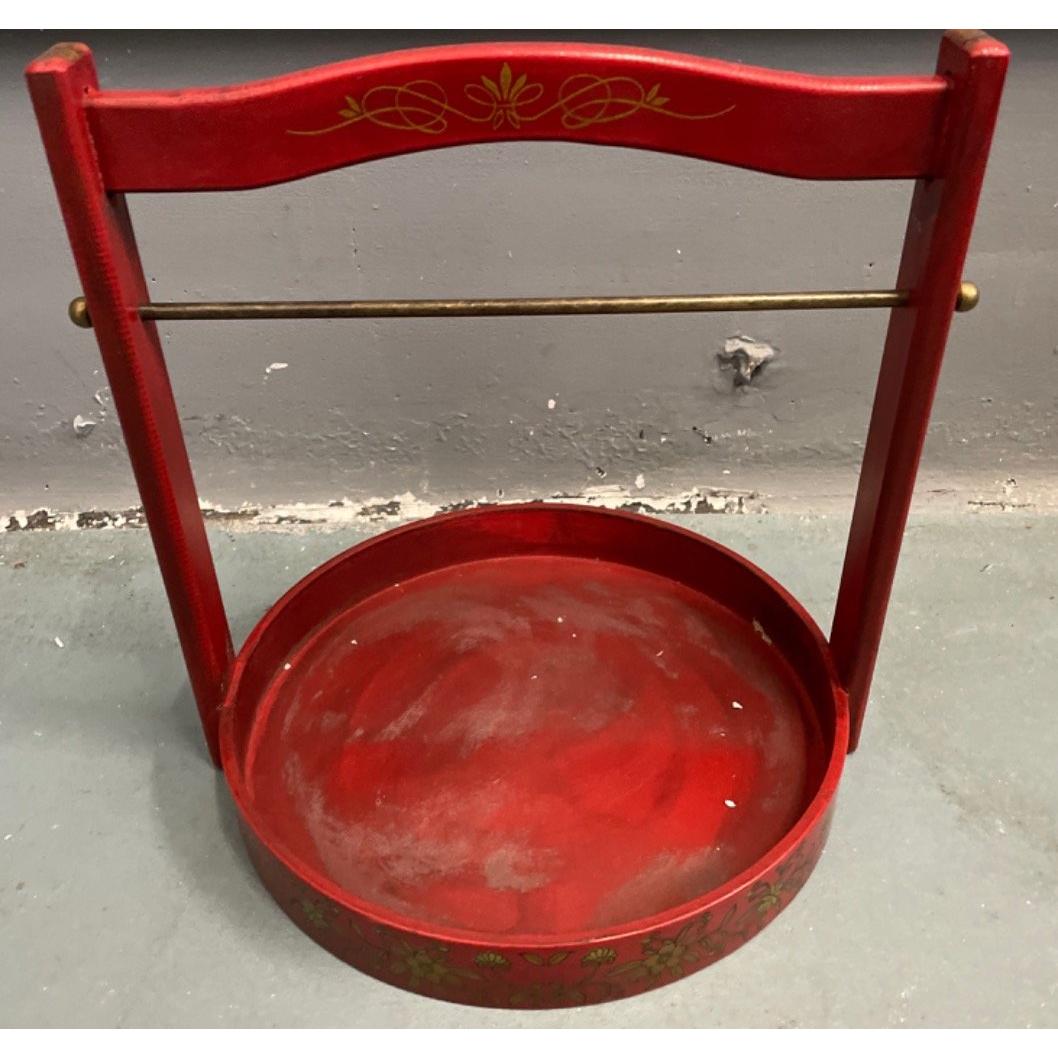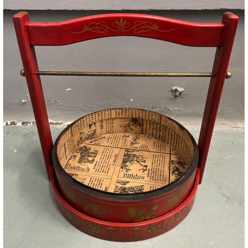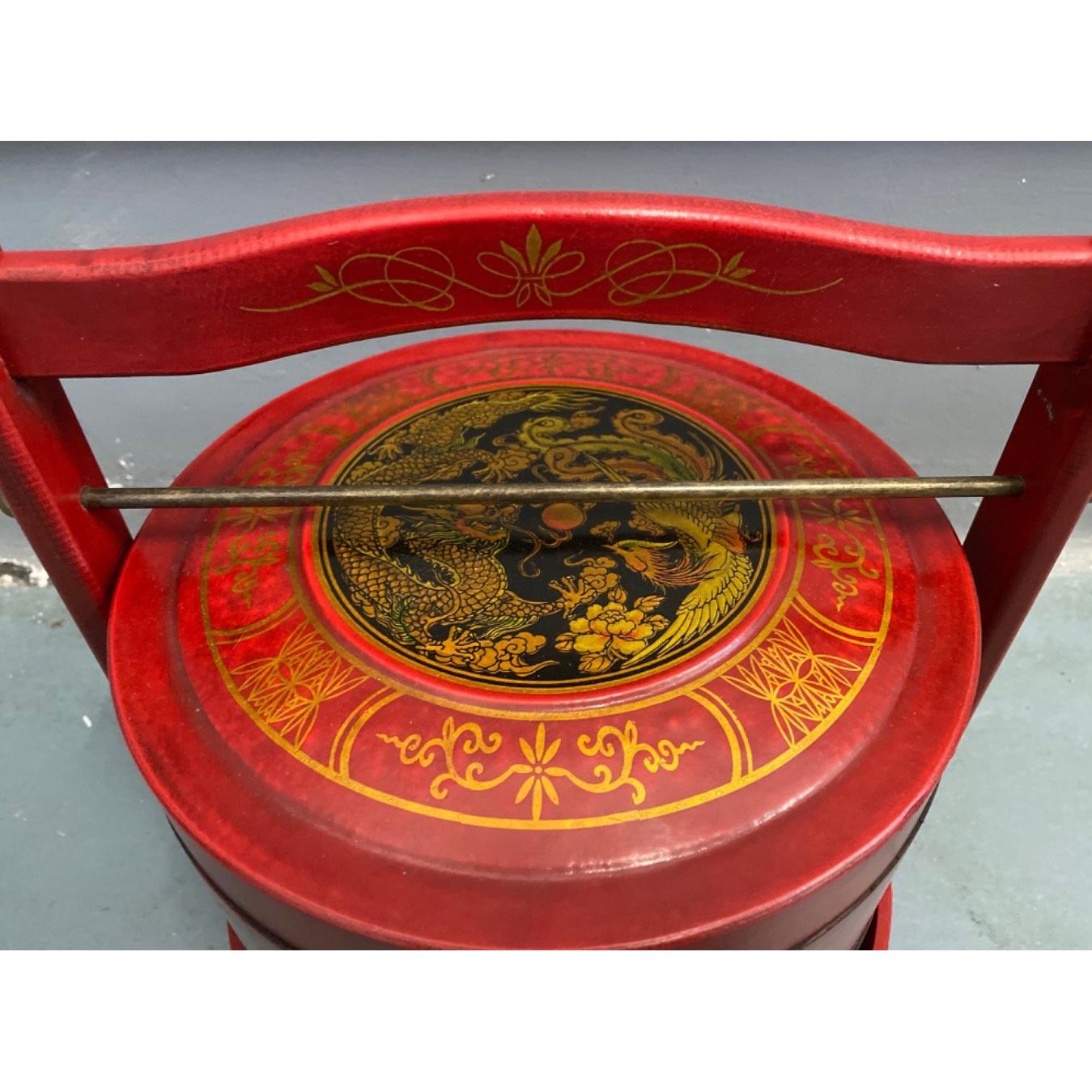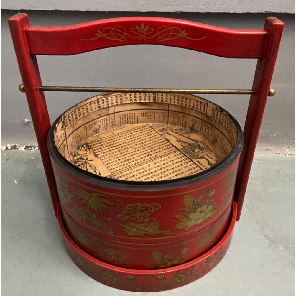 An ORIENTAL HIGHLY decorative red and gold painted lacquered layer with carry handle mock food carrier - new and unused item in storageW: 26cm approx H: 33cm approx D: 26cm approx
