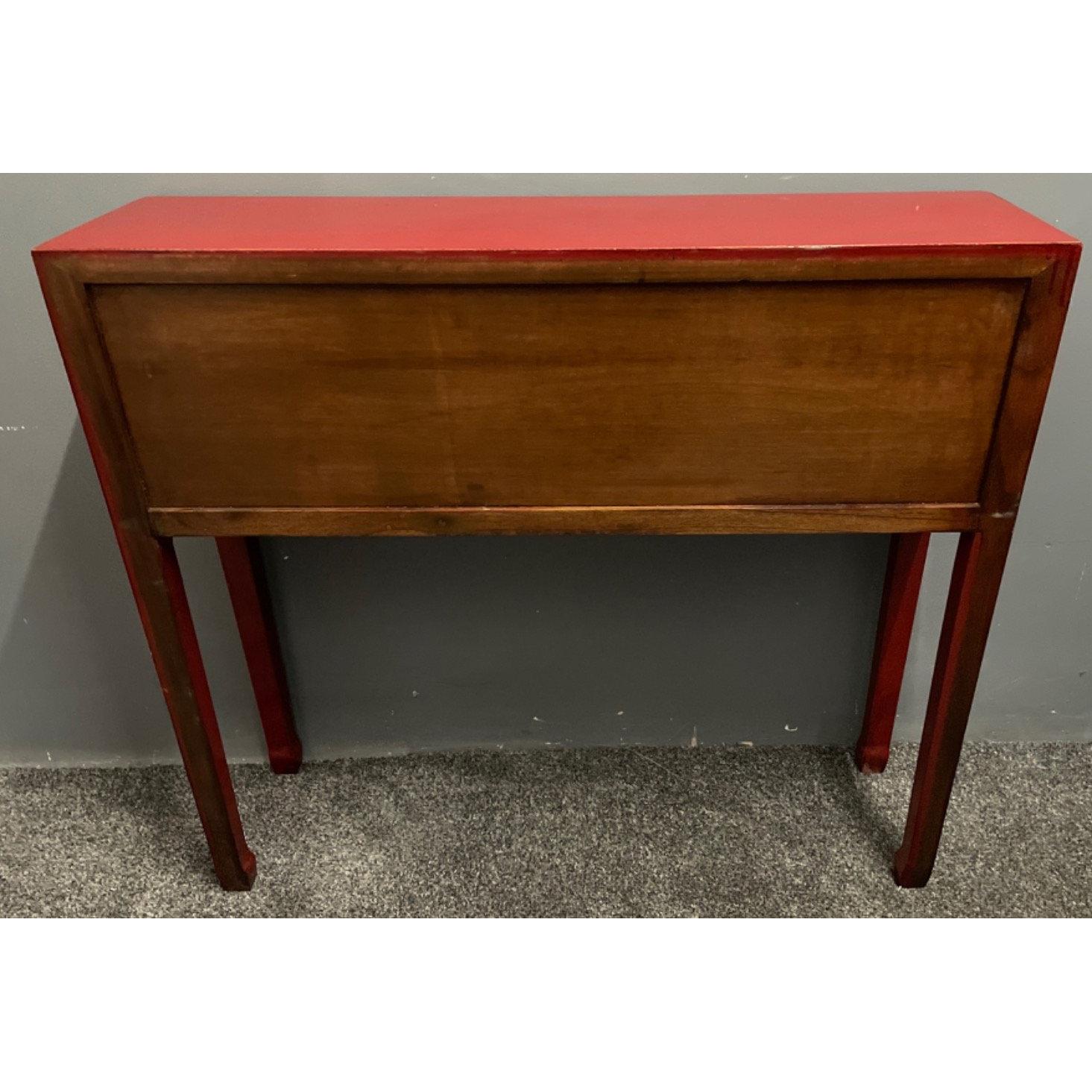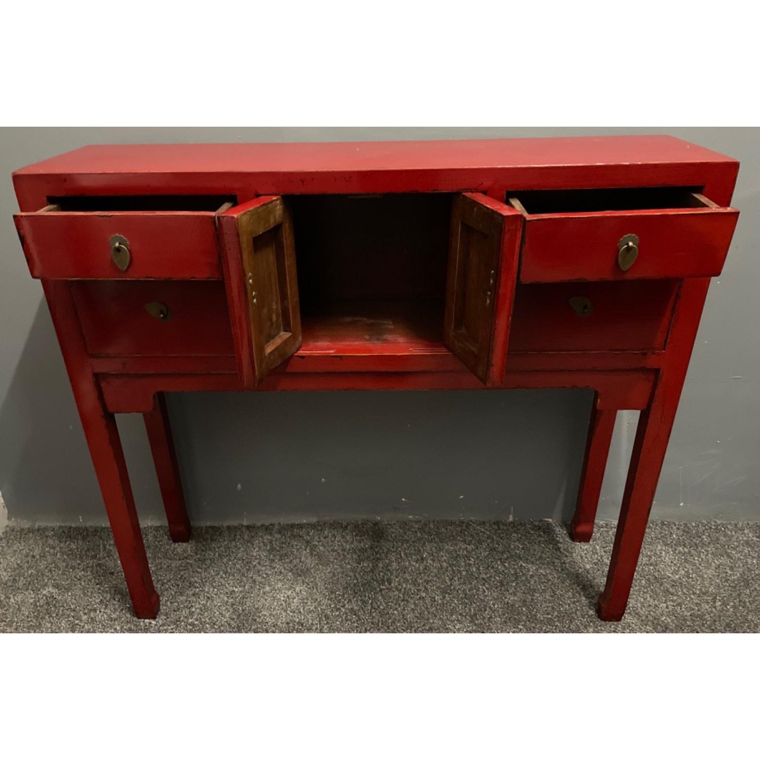 STATEMENT PIECE ! - An ORIENTAL HIGHLY decorative red based distressed-painted lacquered large four drawer and two door cupboard sideboard - new and unused item in storage - would make an ideal TV or media cabinet as well as great for storage!
