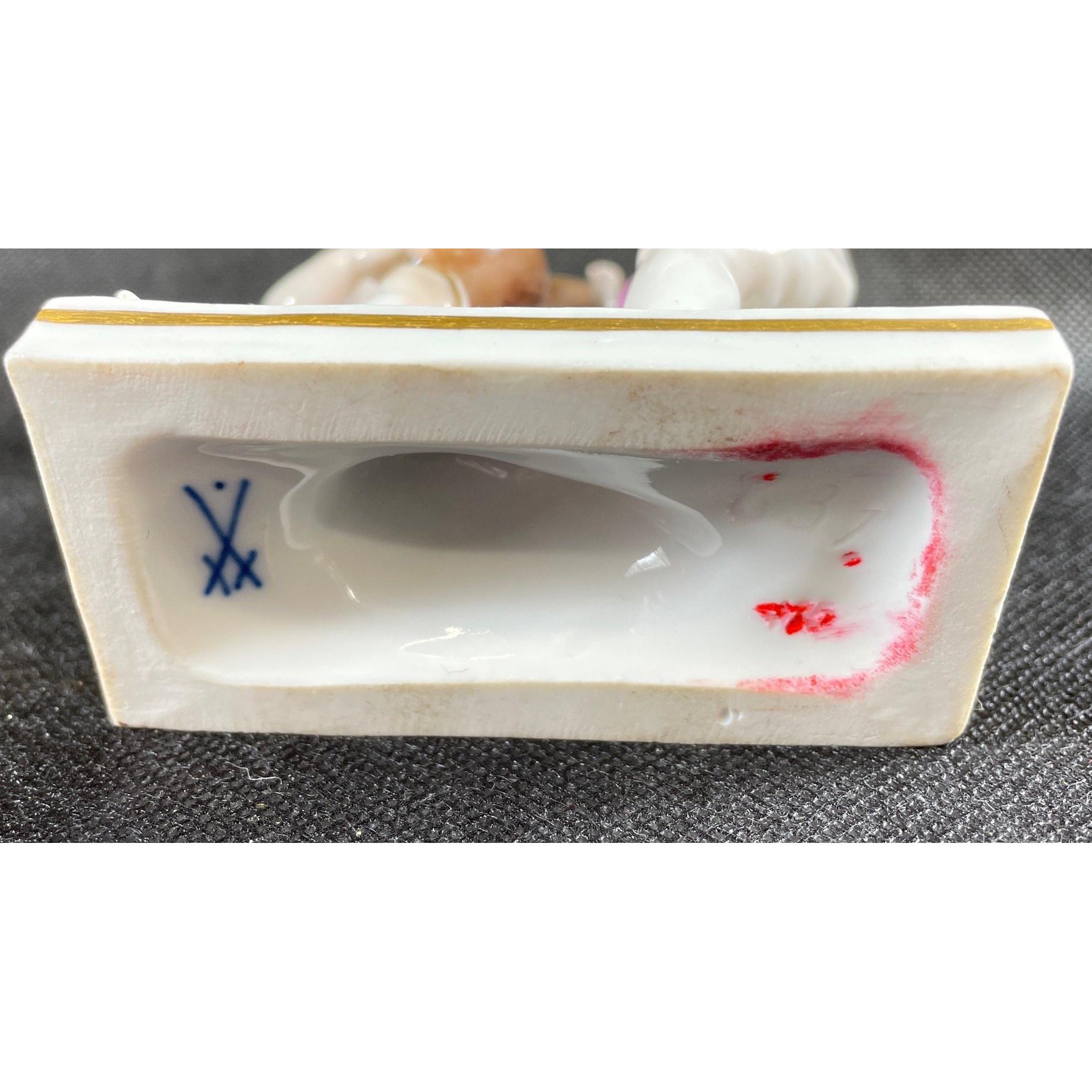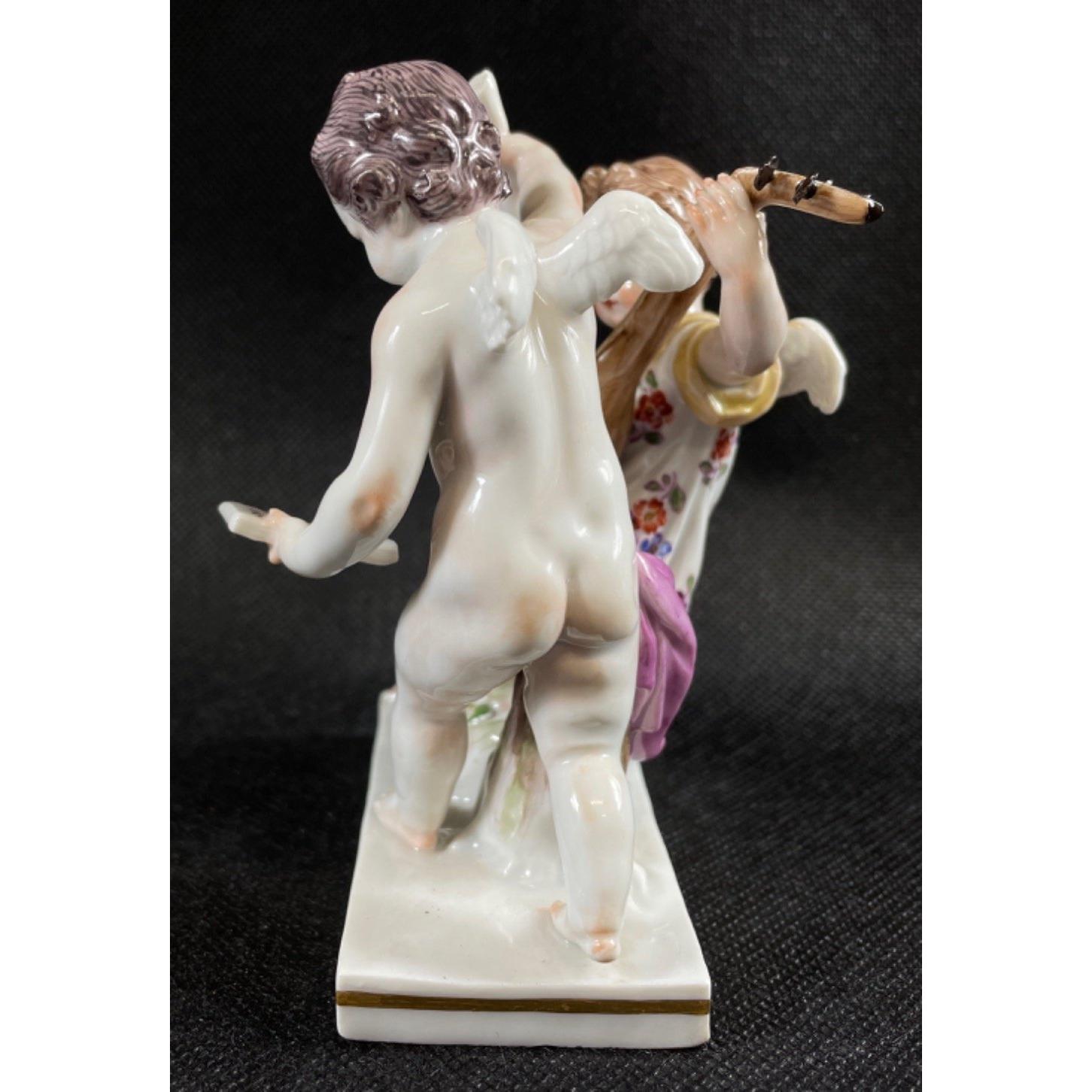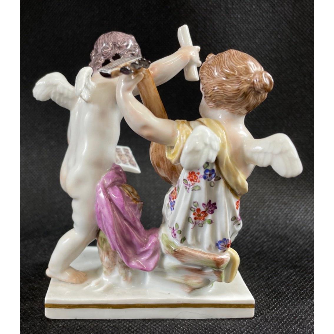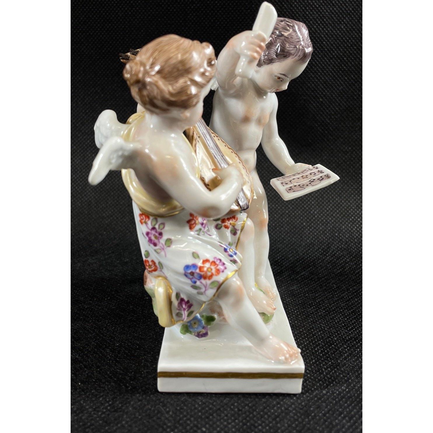 A grouping of two cherubs, possibly Meissen, with one playing the mandolin and the other holding a sheet of music, stands 11cm tall, no chipsApprox 1 pieces