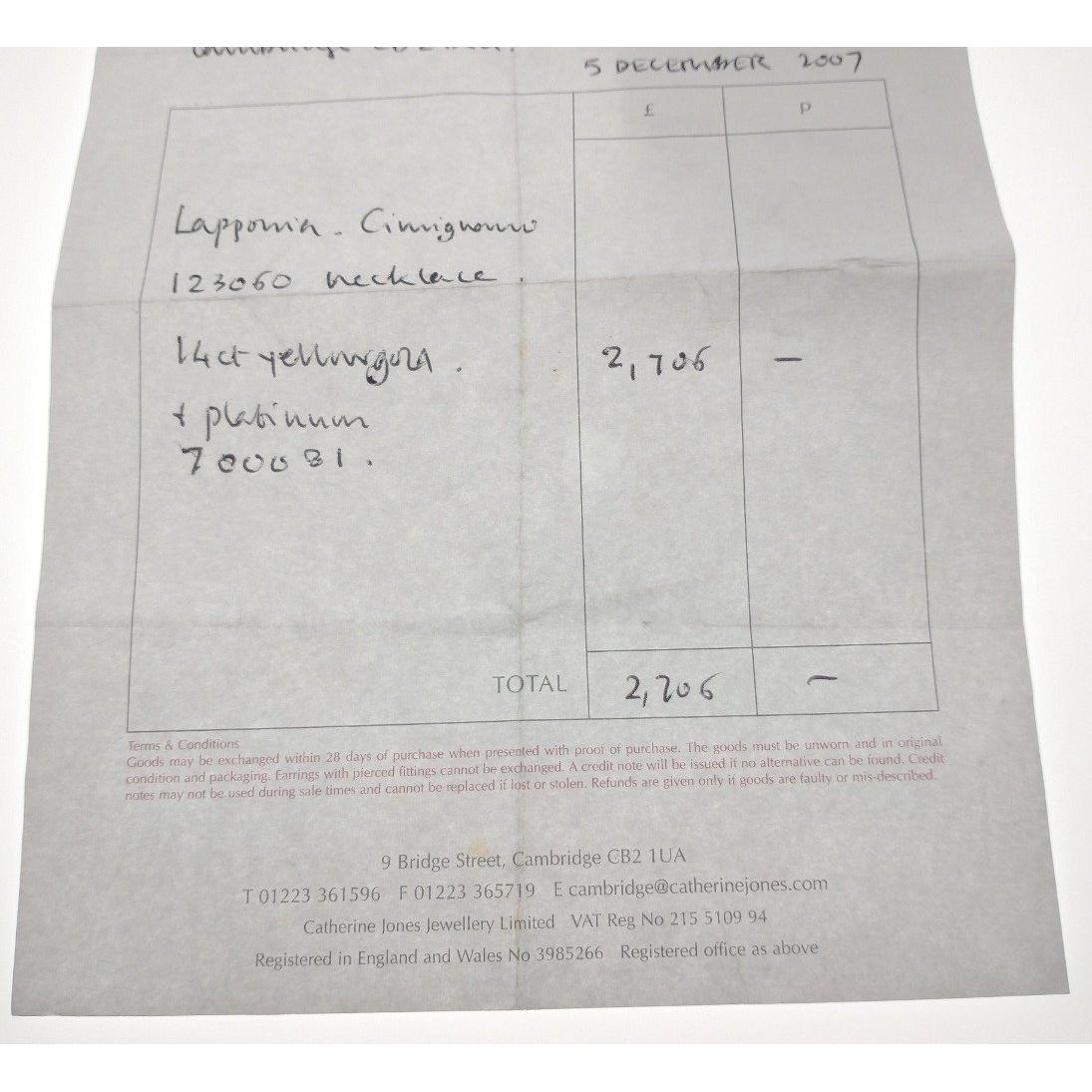 STUNNING! 14ct yellow gold and platinum LAPPONIA necklace - purchased in 2007 from a top class jewellers Catherine Jones of Cambridge for £2706 - original receipt attached in the pics