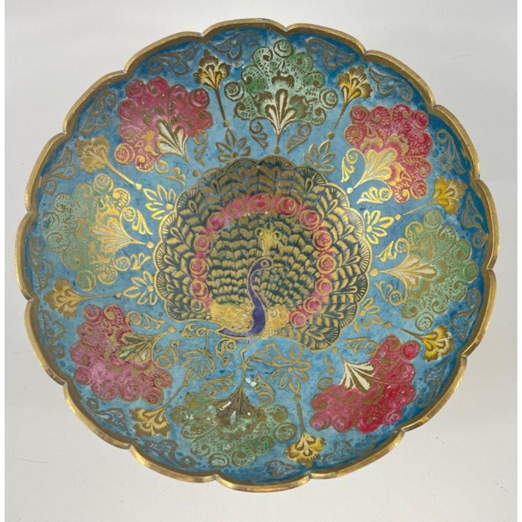 A pretty vintage CLOISSONE inspired pretty bowl depicting a peacock in full 'fan-tail' showing off! etc - dimensions 16cm diameter x 6cm approx.Approx 1 pieces