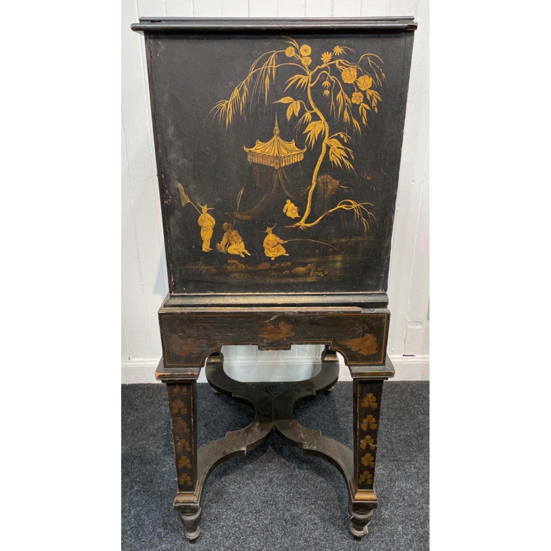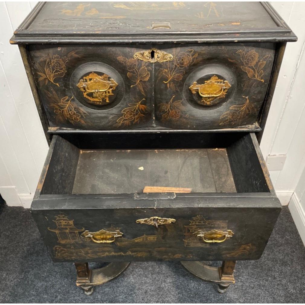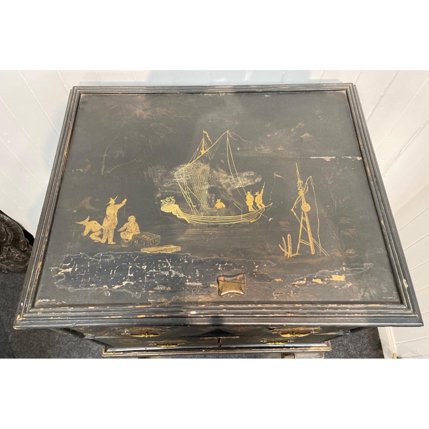 FABULOUS PATINA! A CHINESE c18th century antique lacquer two drawer cabinet raised on four leg supports- beautiful feature bulbous double top drawer with original brass handles and brass scroll-work locks - possibly original key in bottom lock, top lock is missing from the inside - label verso 'T Coulson ornamental furniture painter' depicting typical rural country scenes with Pagodas and fishermen and traditional fishing boats - dimensions height 110cm x length 55cm x depth 43cm approx - the cabinet condition is described as used, naturally distressed - the top surface has had part of the veneer missing/damaged a long time ago, but this does not detract from this wonderful piece - a nice proportioned cabinet!