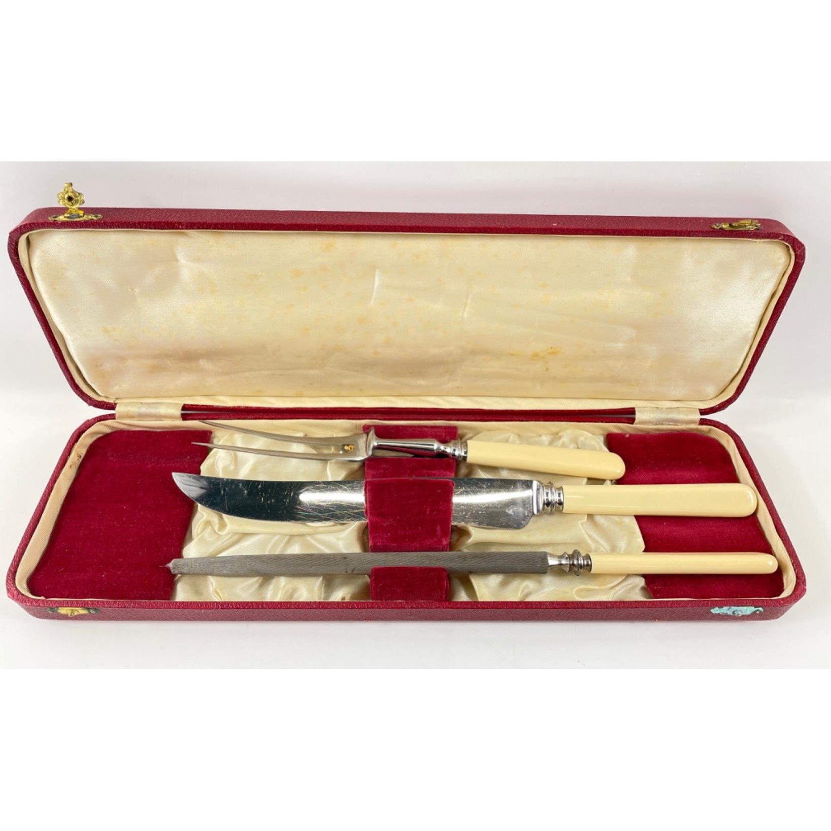A TURTON and Co Ltd Sheffield circa 1950's carving set within its original jeweller's presentation case - nice quality! with also a set of six vintage cased teaspoonsApprox 2 pieces