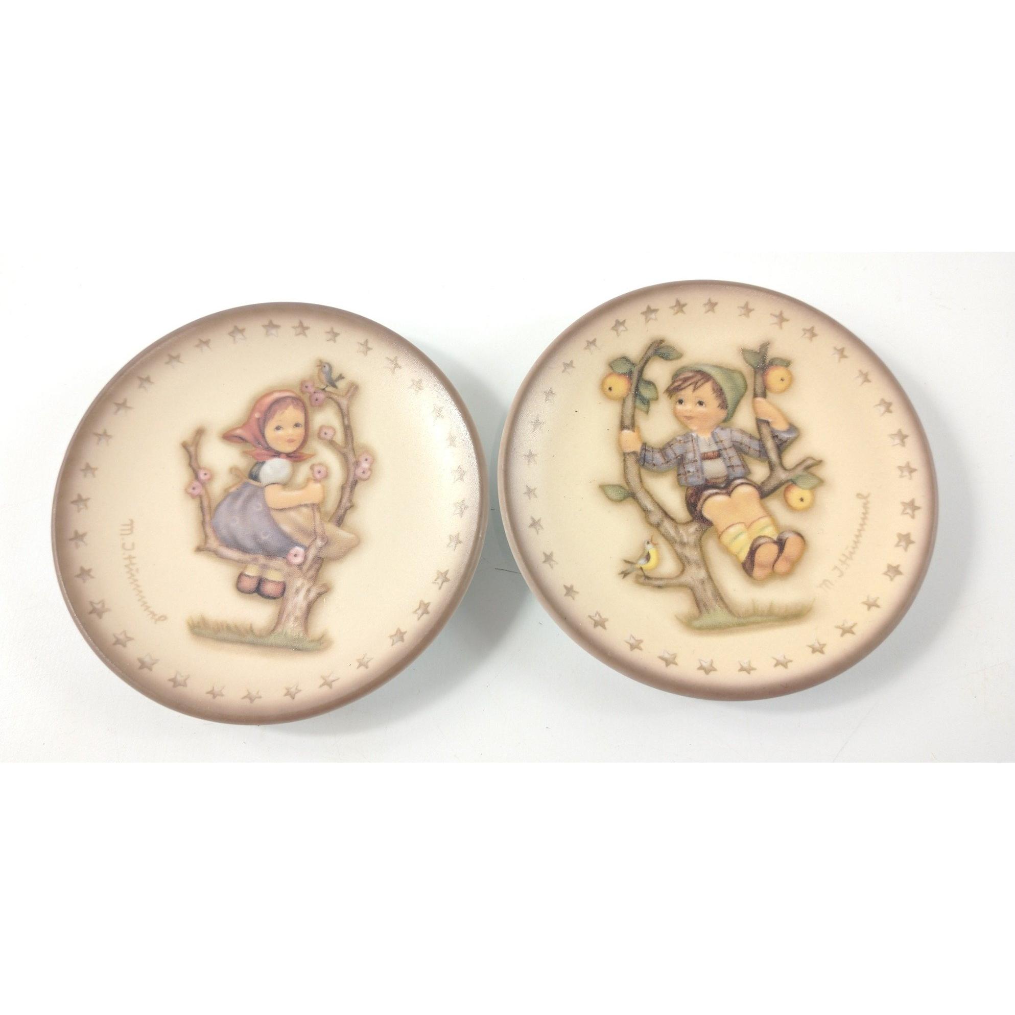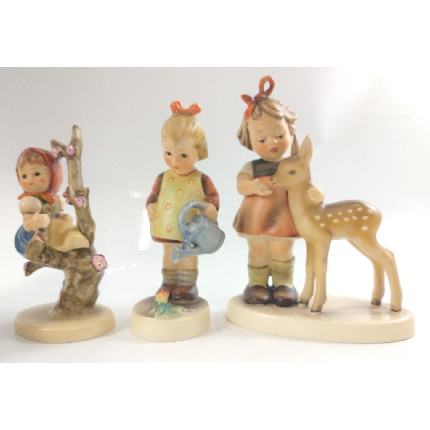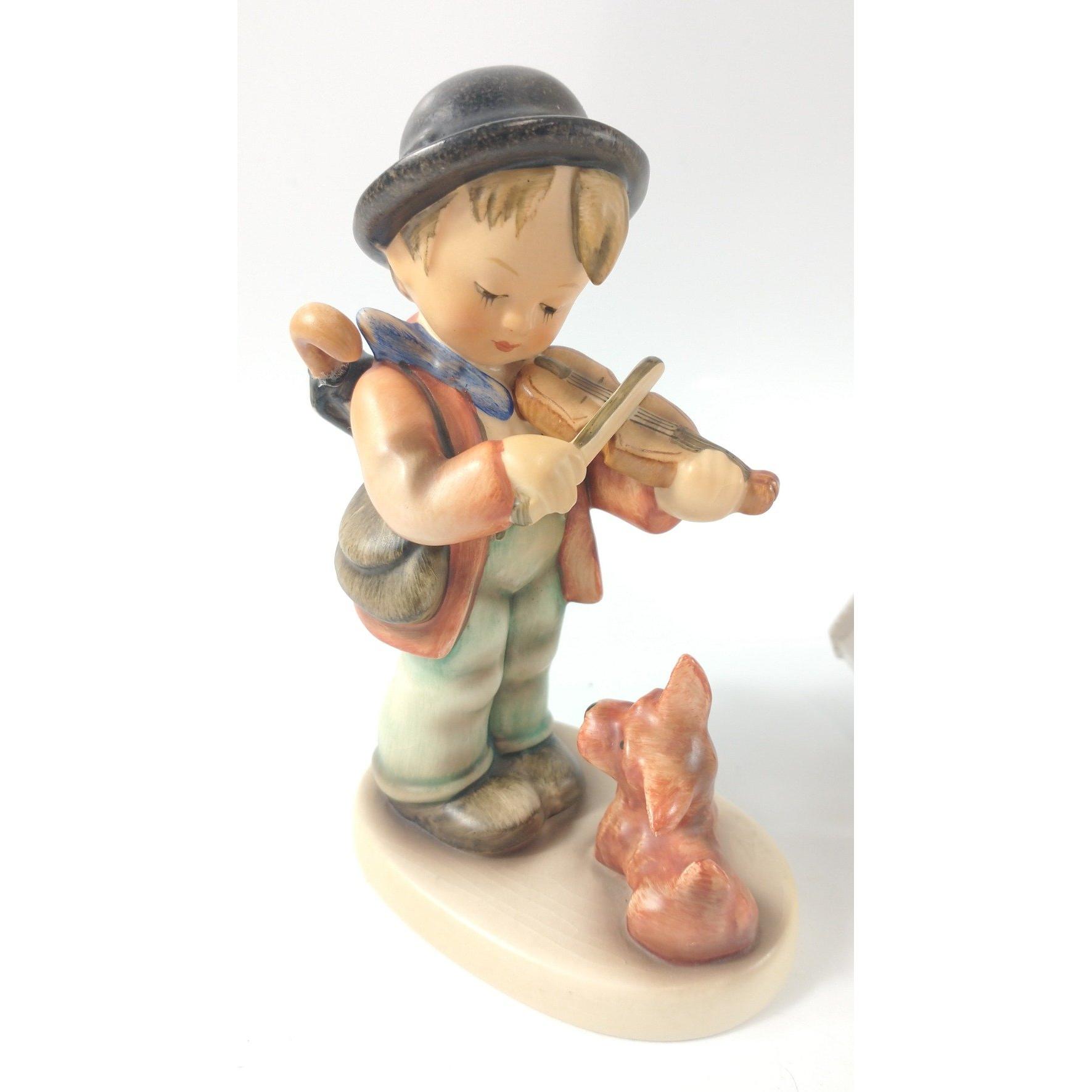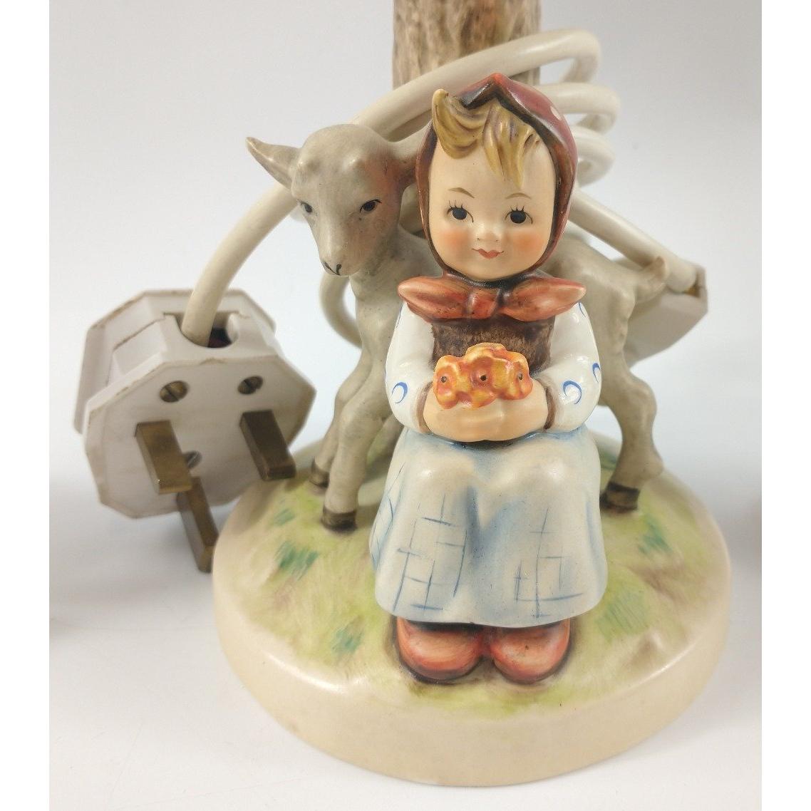 A collection of GOEBBEL HUMMEL figurines to include a 'Good Friends' table lamp (model 228) with shade standing 40cm high also 'Friends' (136/1), 'Little Gardener (74), plus a boy playing a fiddle and a girl in a tree, sizes range from 10cm - 13.5cm and 2 small plates 8 cm dia