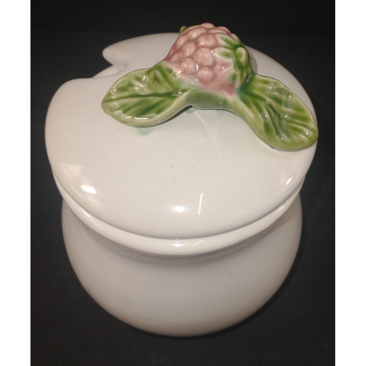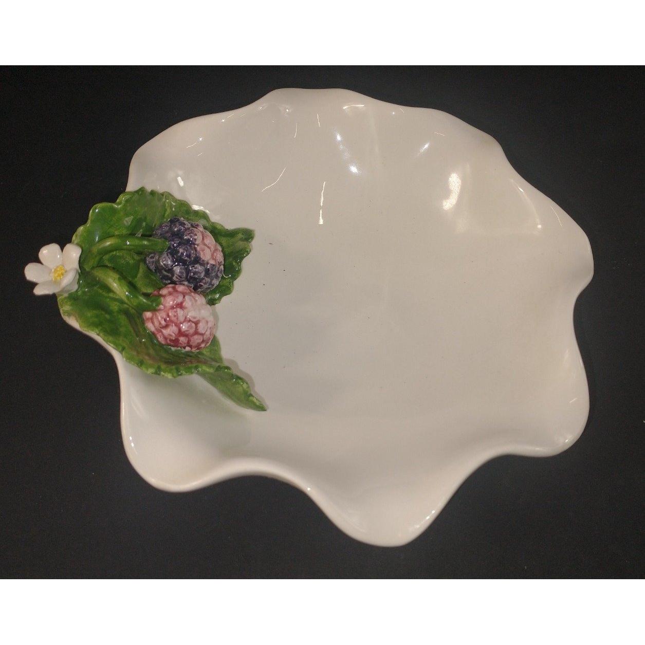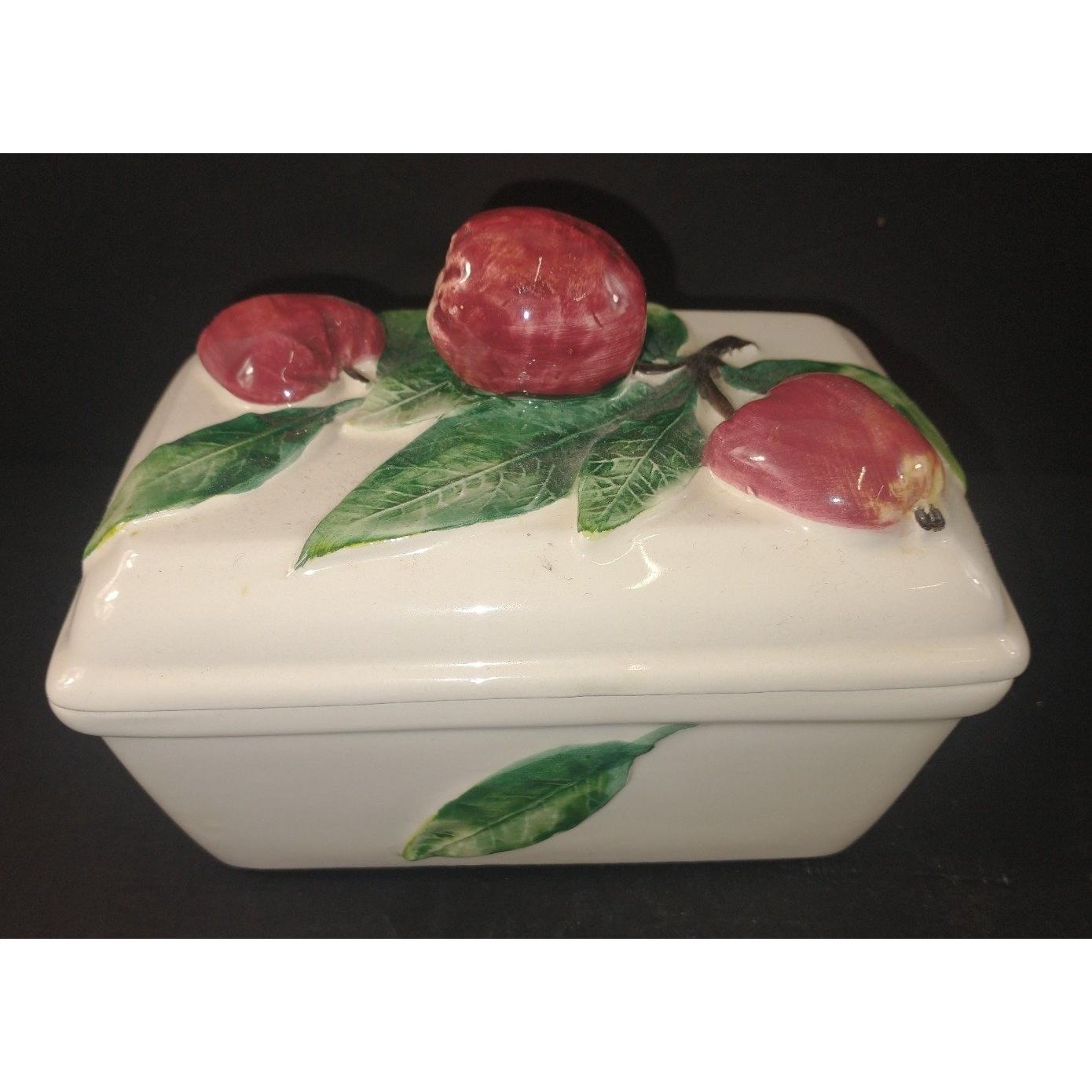 A mixed collection of tableware to include a lidded jampot (13cm) from Portugal, a single-handled bonbon dish (17cm), a scalloped-edged bowl (20 cm) and a lidded butter dish (15.5cm) from Italy