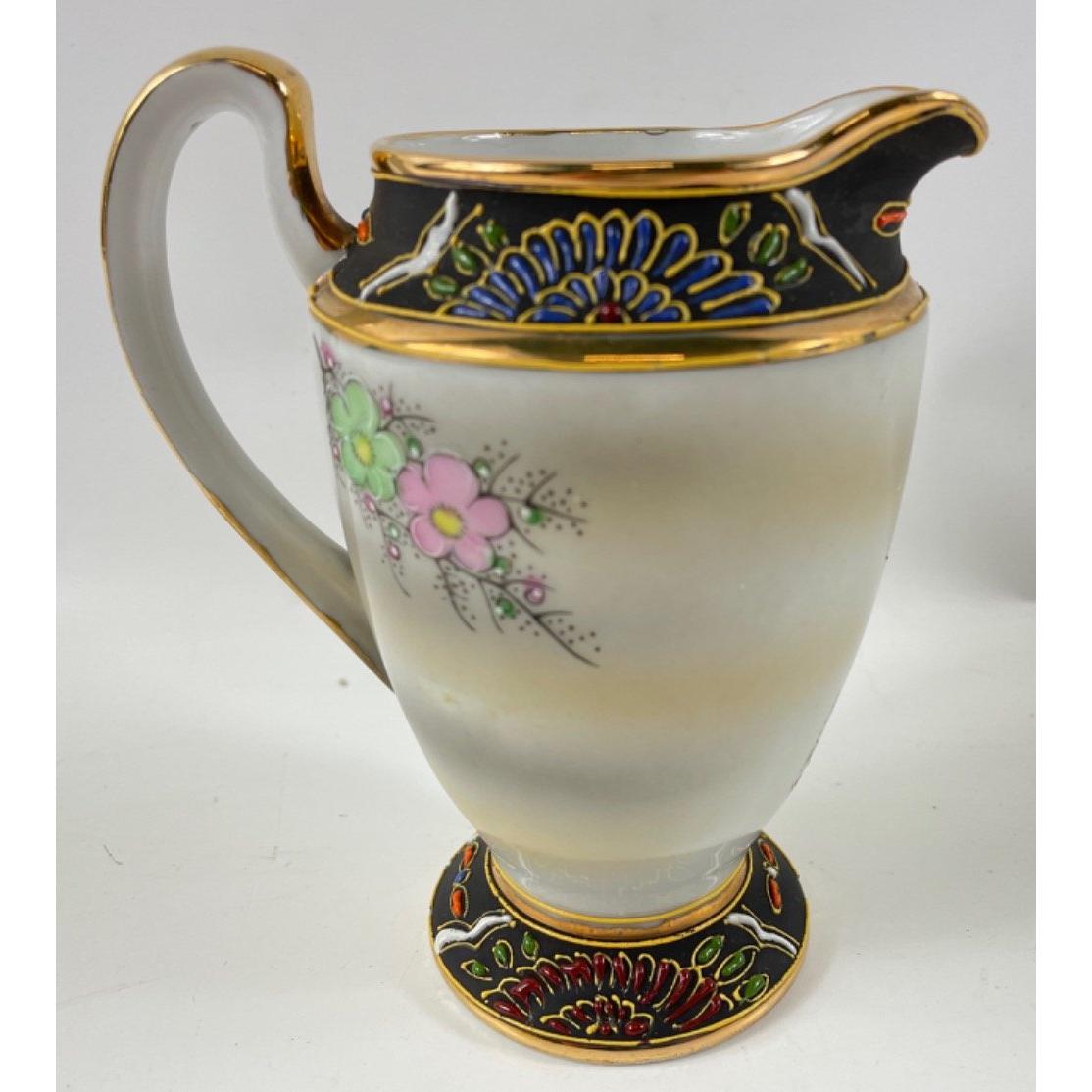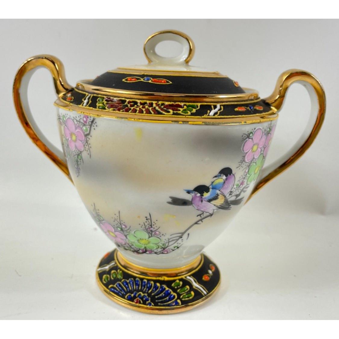 An ORIENTAL MIKONI coffee service with pink and green blossoms and heavy gilt trim comprising 1 coffee pot, 1 lidded sugar bowl, 1 milk jug, 6 demi-tasse cups, 6 saucers plus a single-handed NORITAKE tray with 2 lidded conserve jars with a Middle Eastern scene with a dhow and a man on a camel