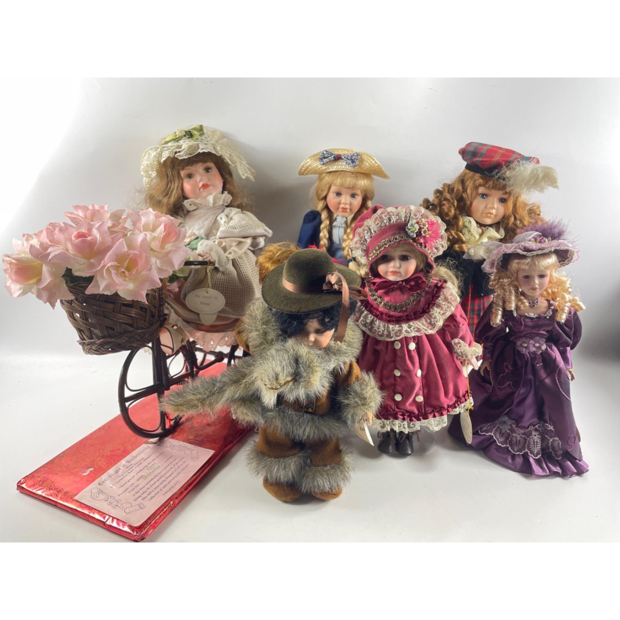 A collection of LEONARDO COLLECTOR'S PORCELAIN dolls to include BONNIE (on stand), FIONA (complete with trike and certificate of authenticity), HELEN, EMILY, ESKIMO BOY, ROBERT, a schoolgirl in uniform,Approx 6 pieces