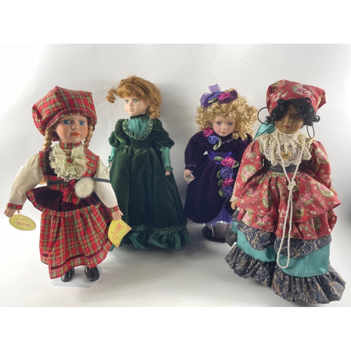 A collection of PORCELAIN DOLLS to include a VICTORIAN COLLECTION doll in purple, two REGENCY FINE ARTS dolls called MORAG and SNOW WHITE, PAULINE, MOLLY, plus a doll in a floral print dress, a gypsy girl