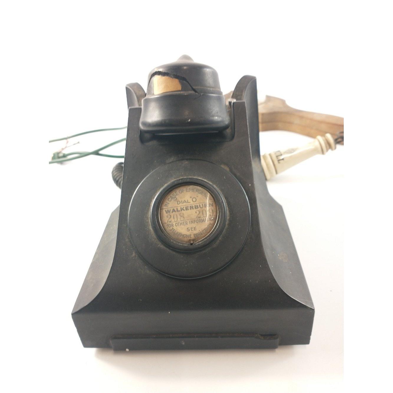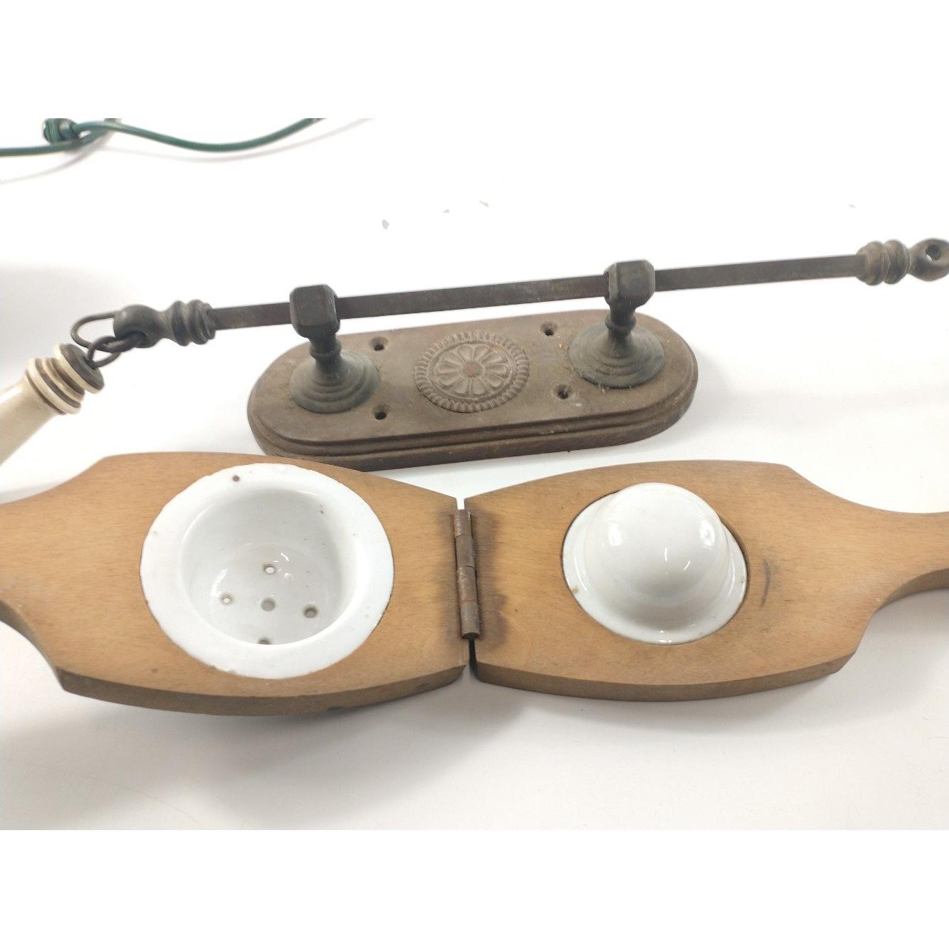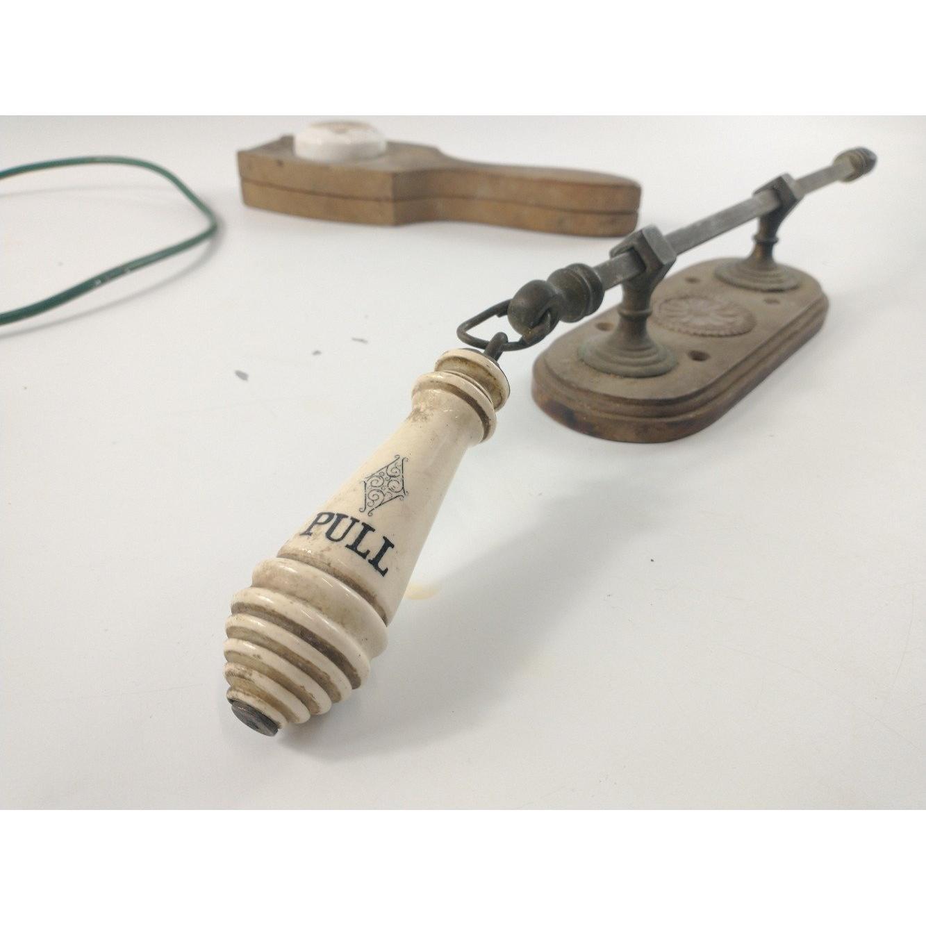 A vintage wooden GARLIC PRESS with ceramic press (24cm long), a bakelite telephone, a bell pull, Approx 3 pieces