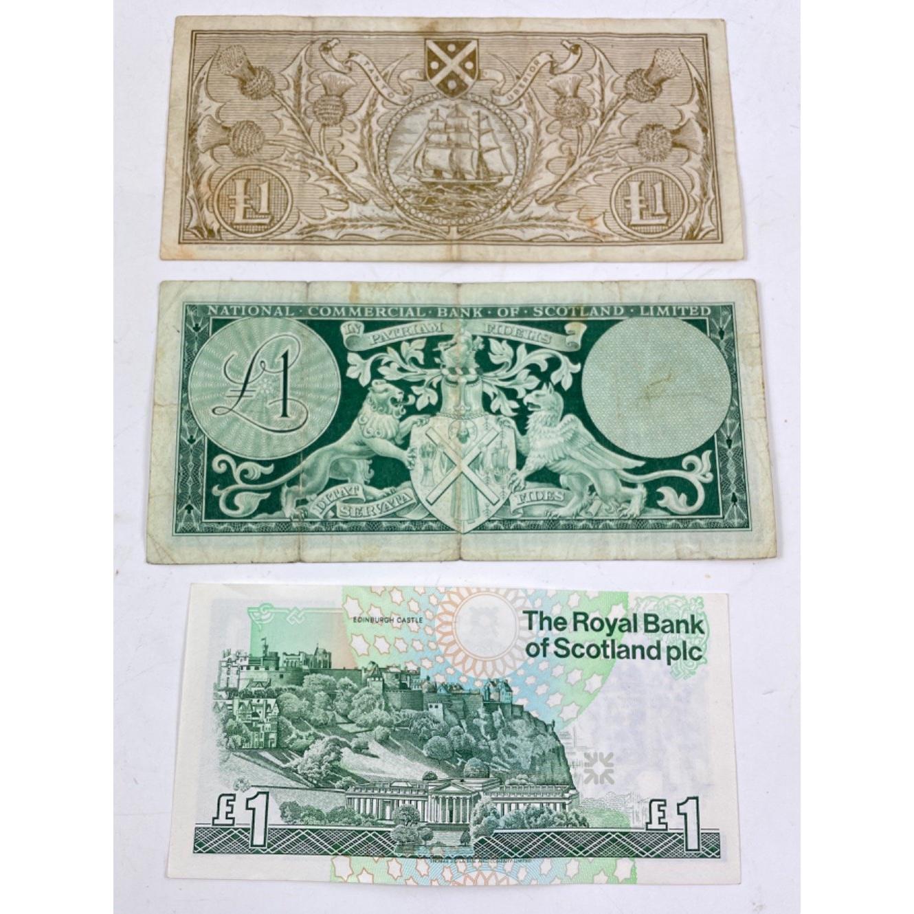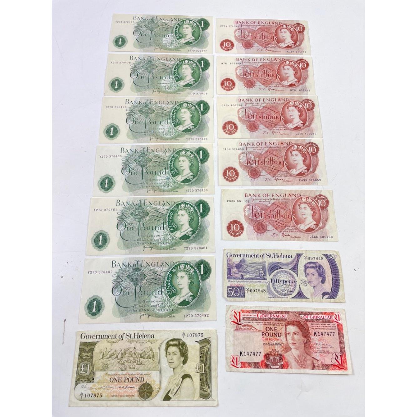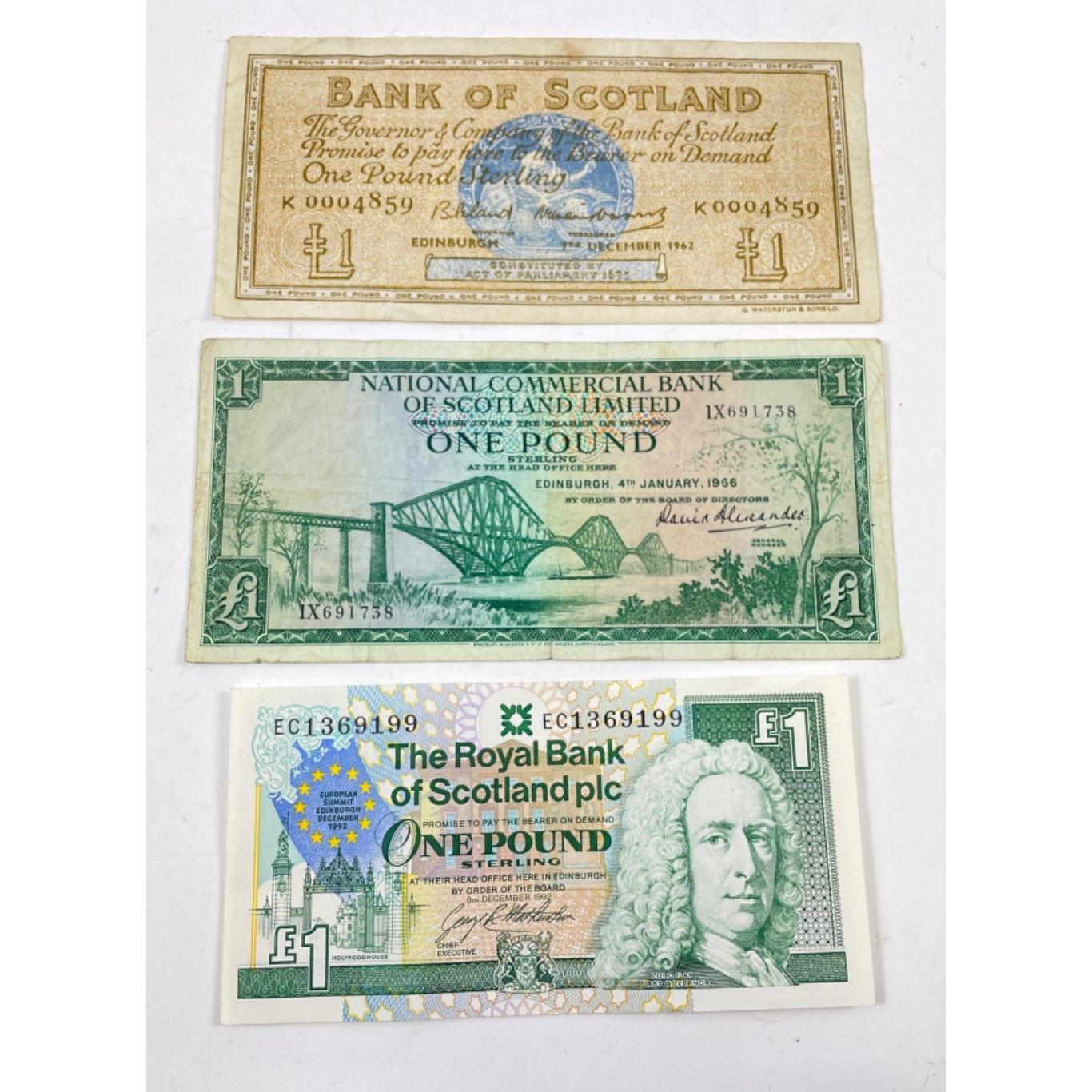 A collection of bank notes to include six sequential Bank of England £1.00 notes, a 1939/44 2 Reichsmark note, a c 1940 20 Reichsmark note, £1.00 notes from the NATIONAL COMMERCIAL BANK OF SCOTLAND LTD 1966 and 1962 BANK OF SCOTLAND, notes from Gibraltar and St Helena, 1993 Bulgarian notes in 20, 100 and 500 Leva denominations and 2000 Leva note from 1996, a presentation sheet of Falkland Islands, First Anniversary of the Liberation stamps, etc