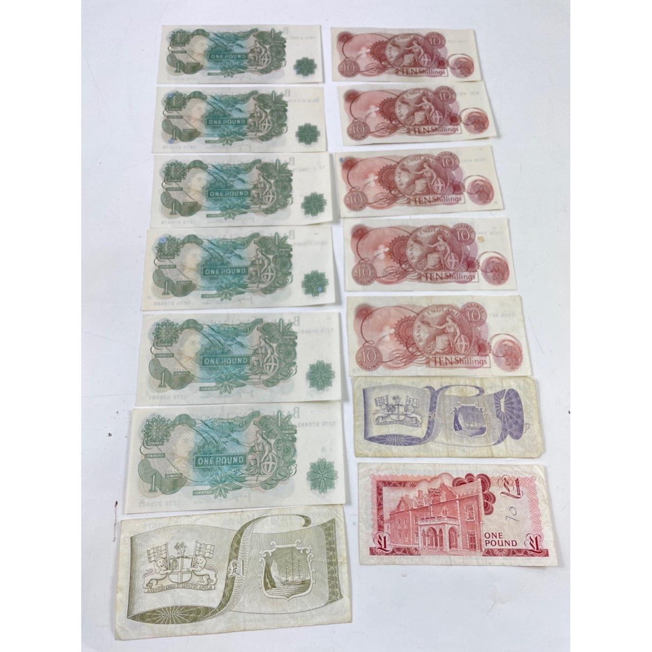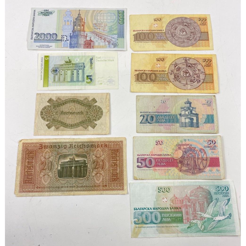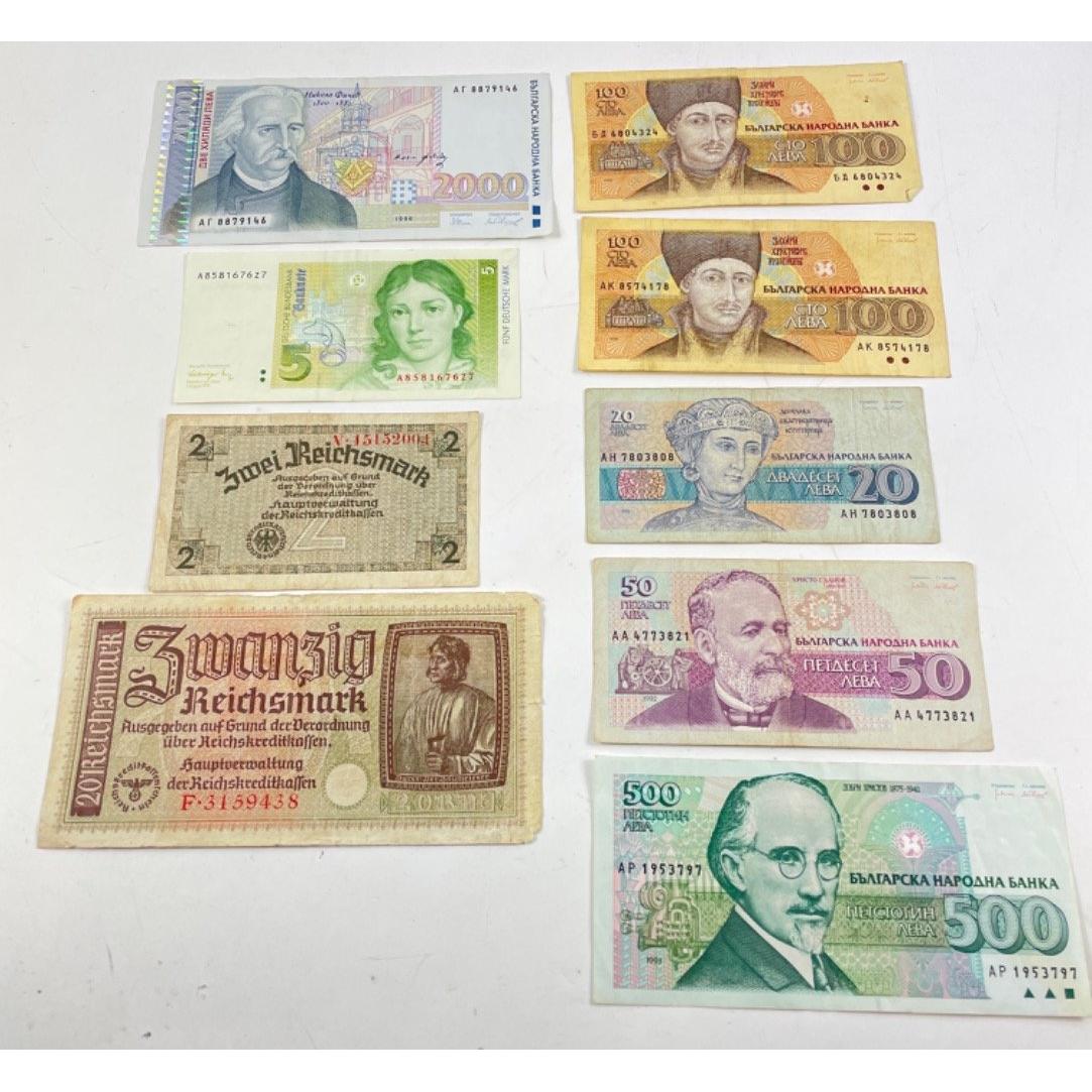 A collection of bank notes to include six sequential Bank of England £1.00 notes, a 1939/44 2 Reichsmark note, a c 1940 20 Reichsmark note, £1.00 notes from the NATIONAL COMMERCIAL BANK OF SCOTLAND LTD 1966 and 1962 BANK OF SCOTLAND, notes from Gibraltar and St Helena, 1993 Bulgarian notes in 20, 100 and 500 Leva denominations and 2000 Leva note from 1996, a presentation sheet of Falkland Islands, First Anniversary of the Liberation stamps, etc