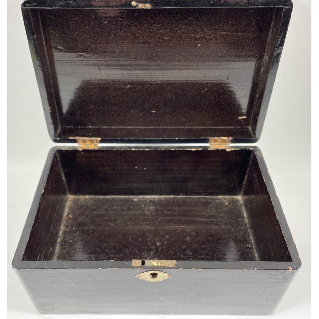 A wooden box painted black with a design of a bird and flowers on the lid 20x13x10cm, key missingApprox 1 pieces