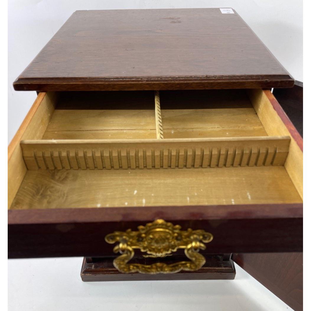 A medium table-top Edwardian mahogany drawer set cabinet with lockable door with key, and six similar sized drawers with a larger seventh bottom drawer, all with nice brass handles. - dimensions of the outer cabinet 13" Depth x 11.5" Width x 15" Height