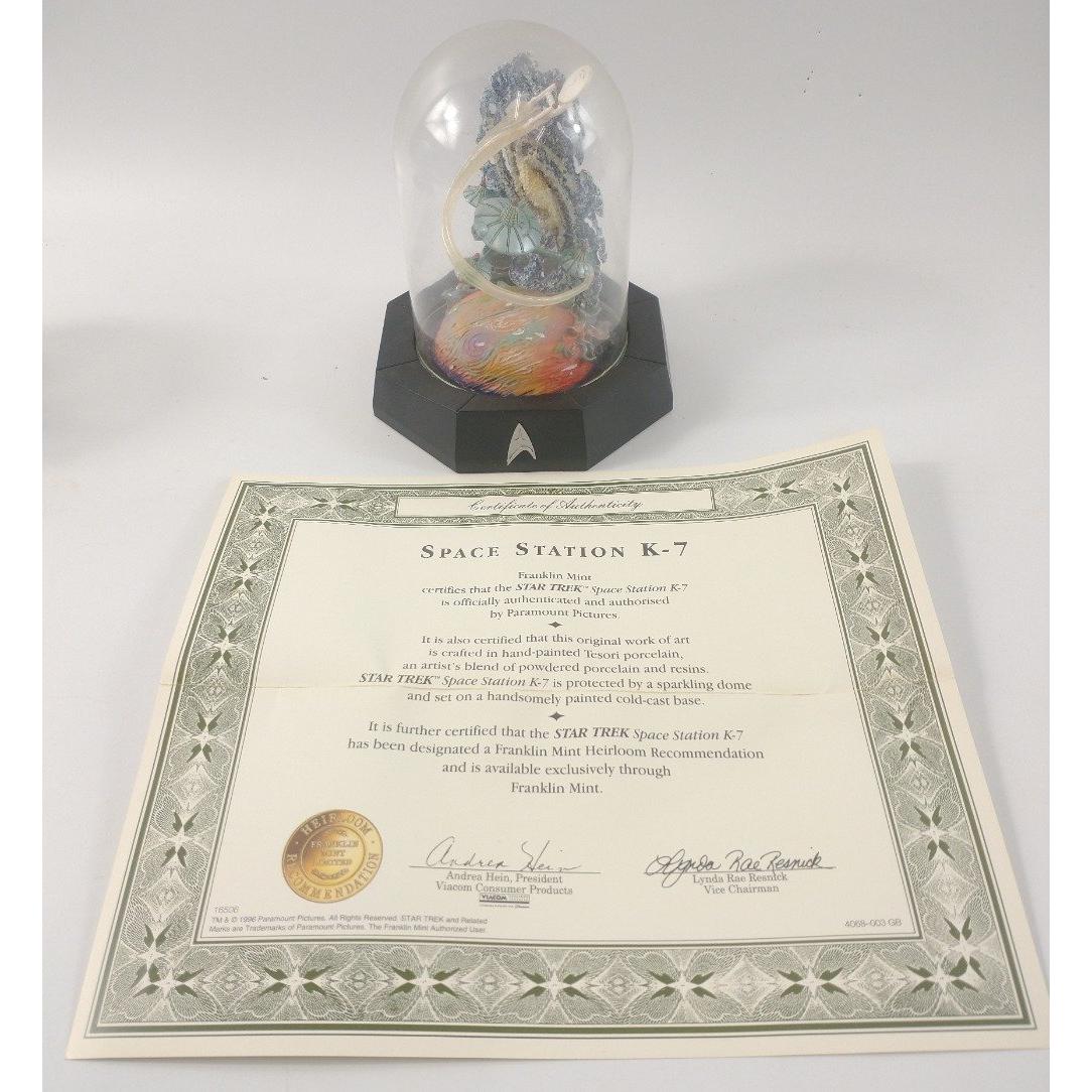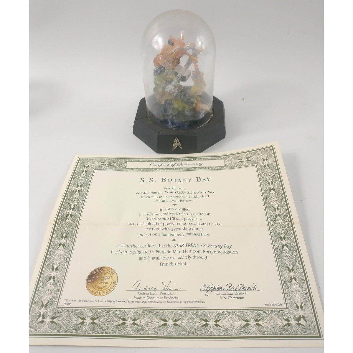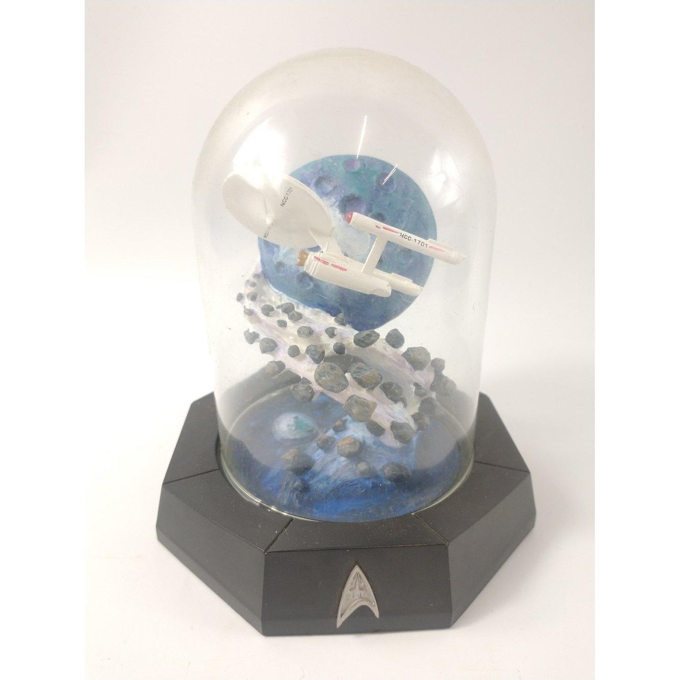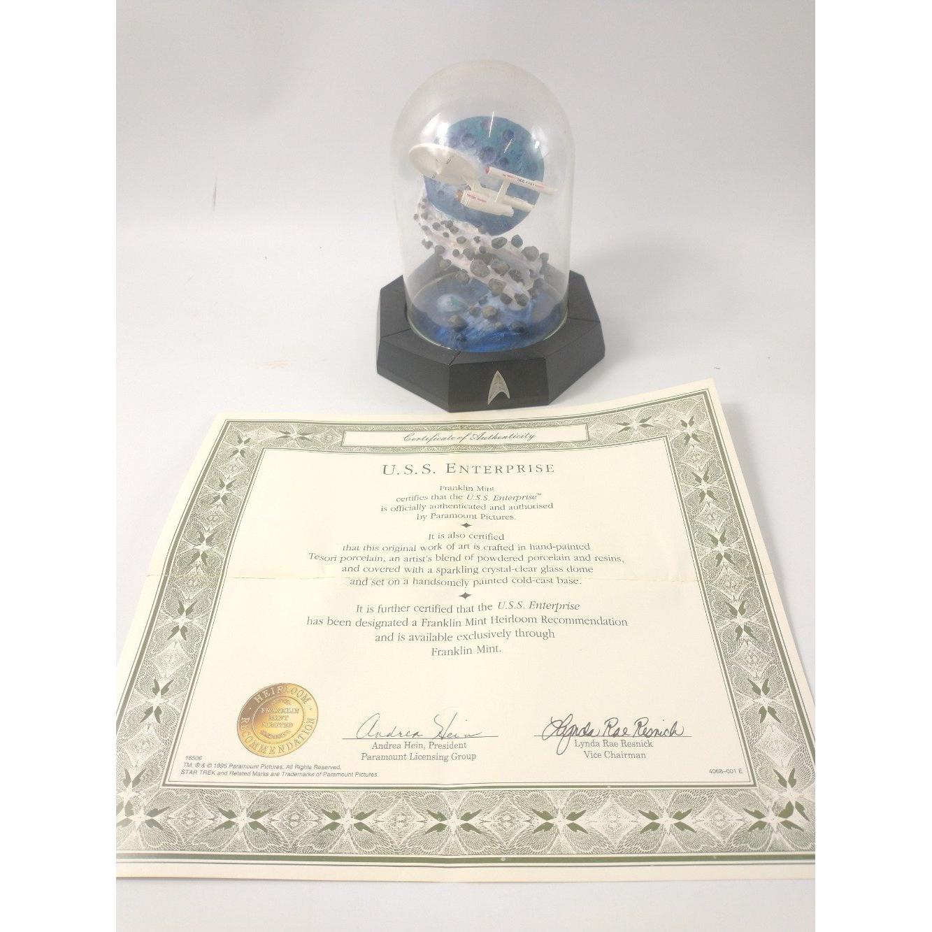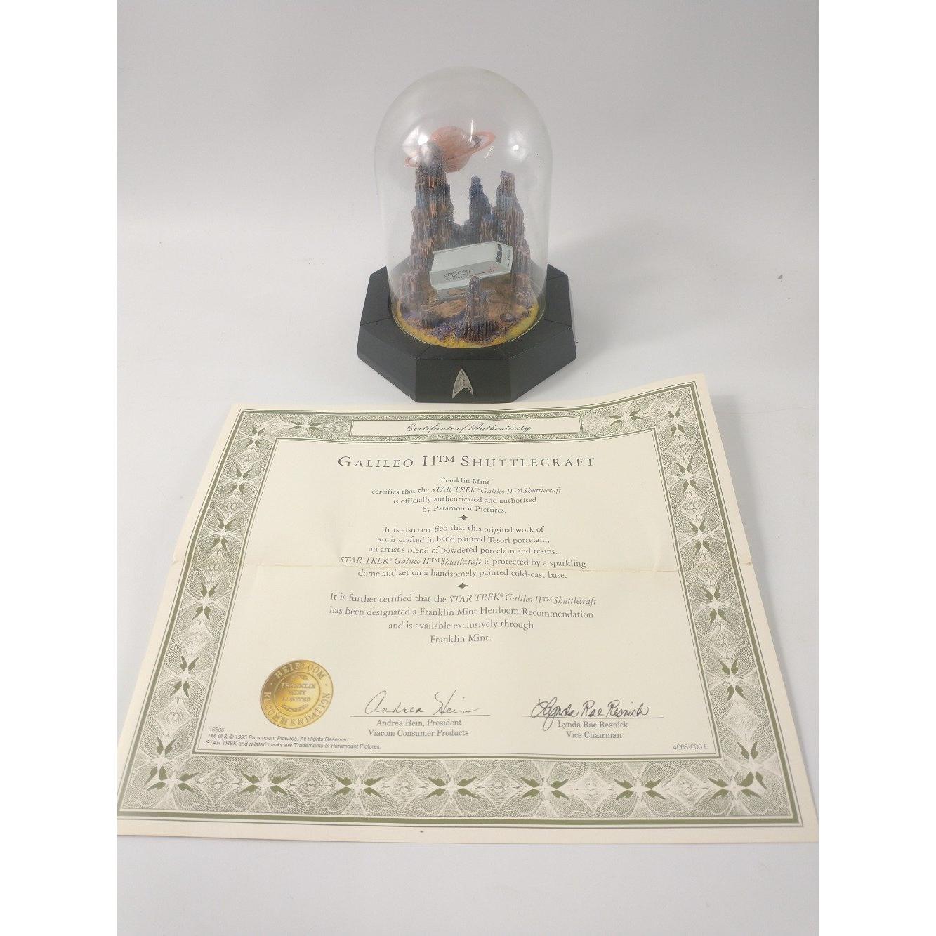 Six STAR TREK sculptures in glass domes produced by the Franklin Mint to include ' USS Enterprise', 'Romulan Bird of Prey' (some damage, 'Space station K-7', 'Klingon Encounter', 'SS Botany Bay', 'Galileo ll shuttlecraft', each model comes with its certificate of authenticity