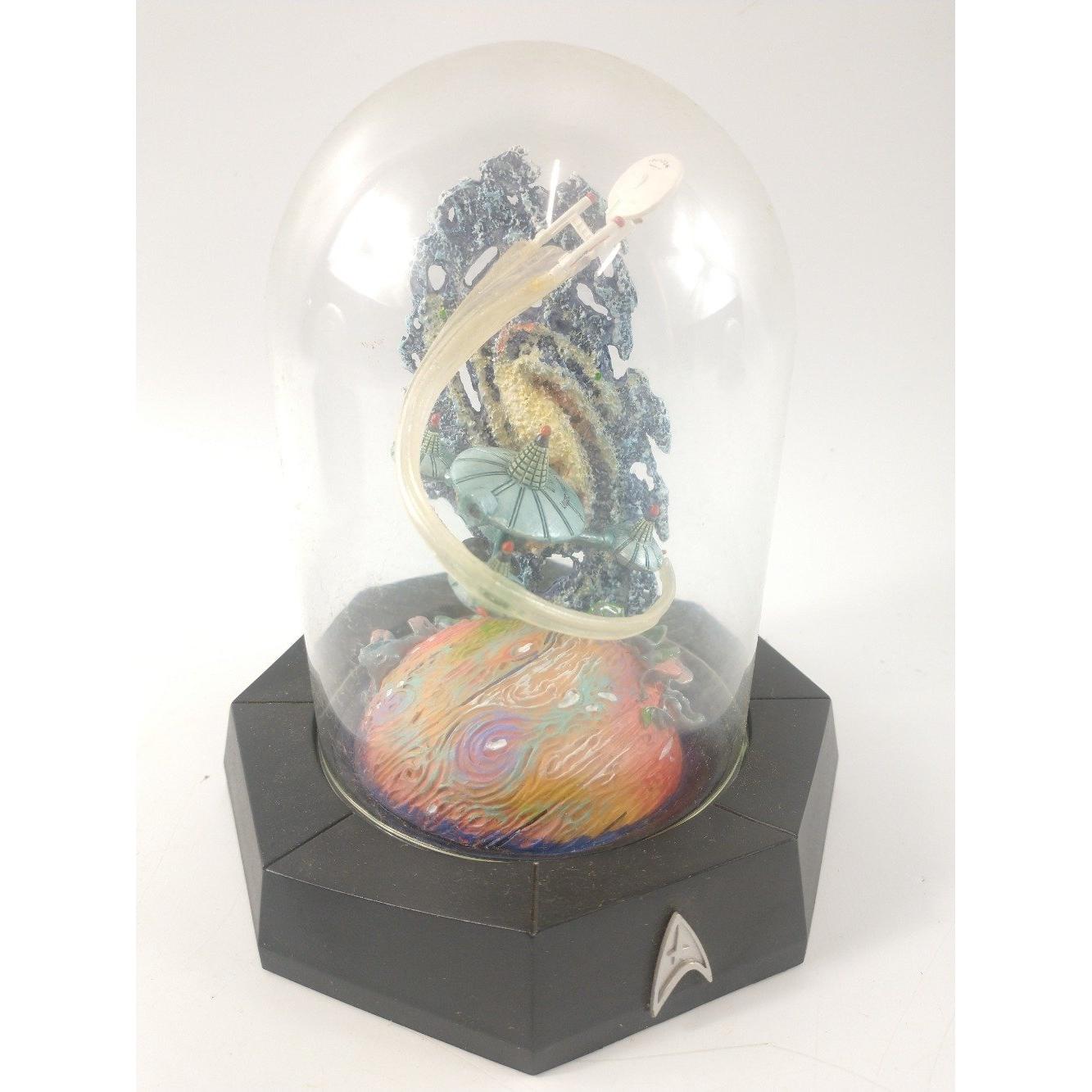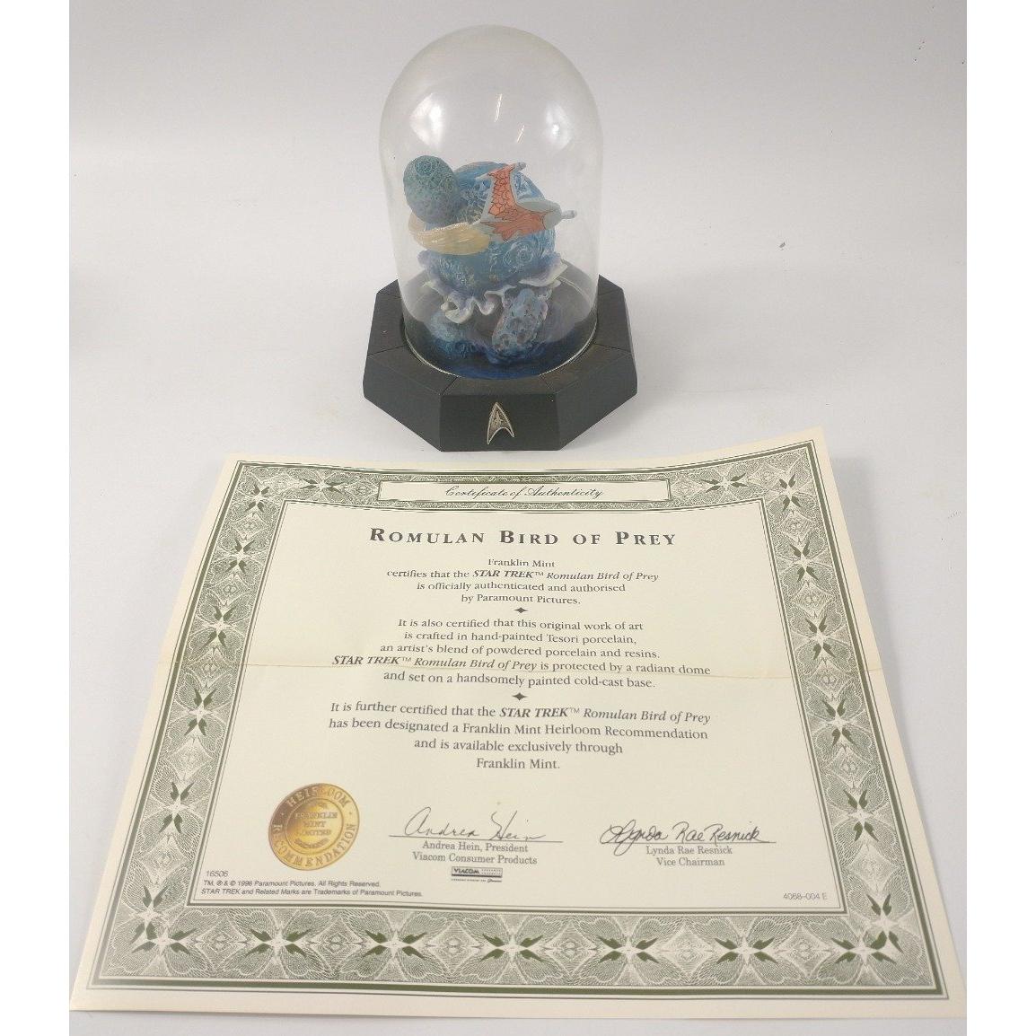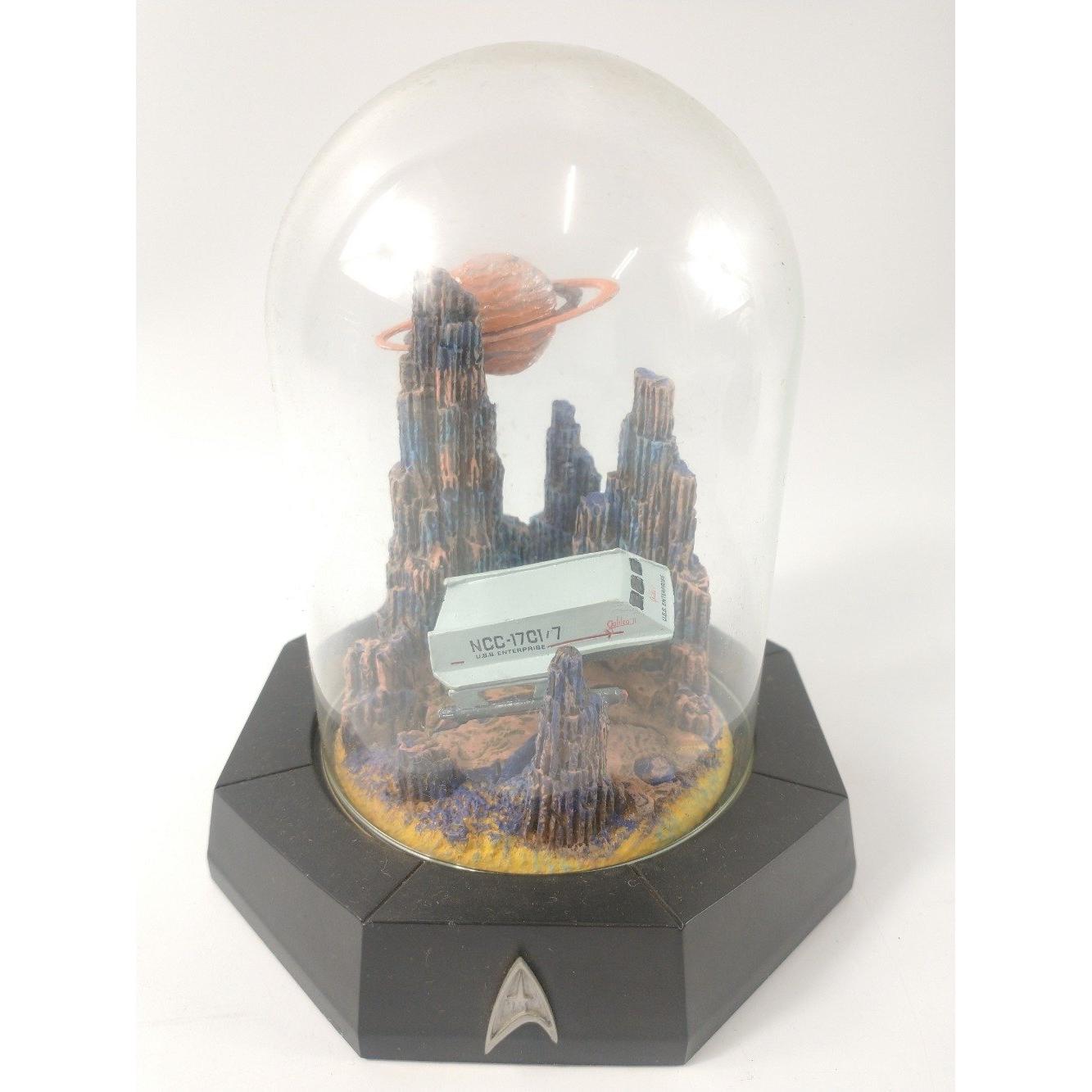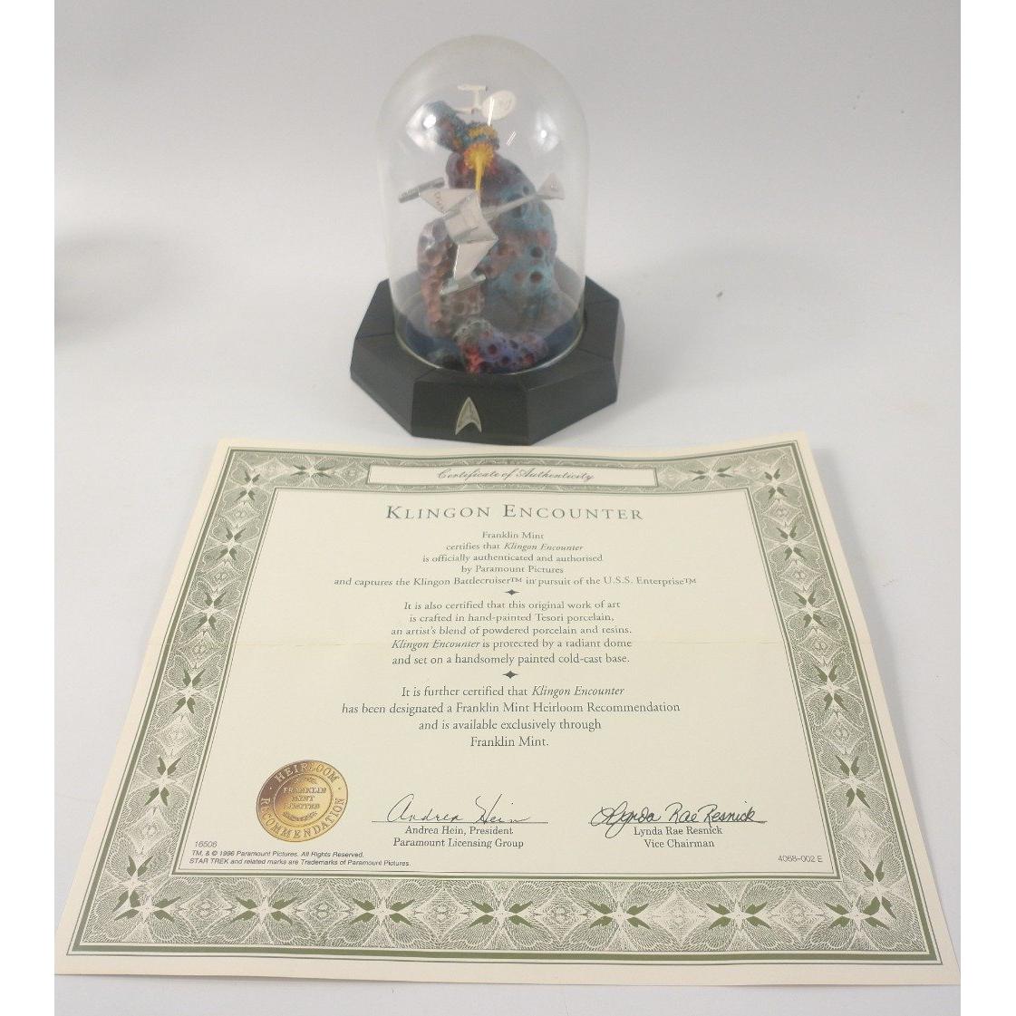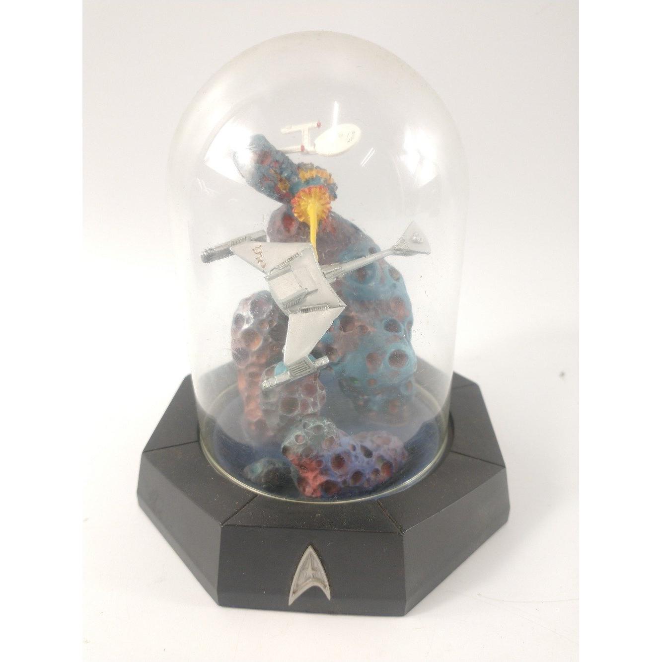 Six STAR TREK sculptures in glass domes produced by the Franklin Mint to include ' USS Enterprise', 'Romulan Bird of Prey' (some damage, 'Space station K-7', 'Klingon Encounter', 'SS Botany Bay', 'Galileo ll shuttlecraft', each model comes with its certificate of authenticity