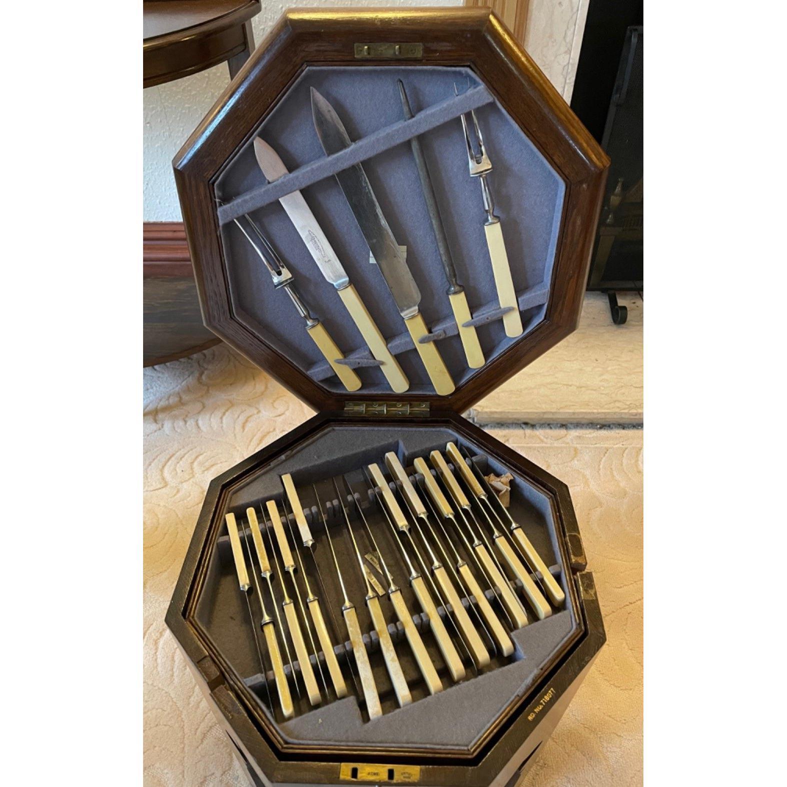 A circa 1920's OCTAGONAL CUTLERY table canteen by MARTIN HALL AND Co Sheffield, to include meat carving set and cleaver, total count 60 pieces approxApprox 60 pieces