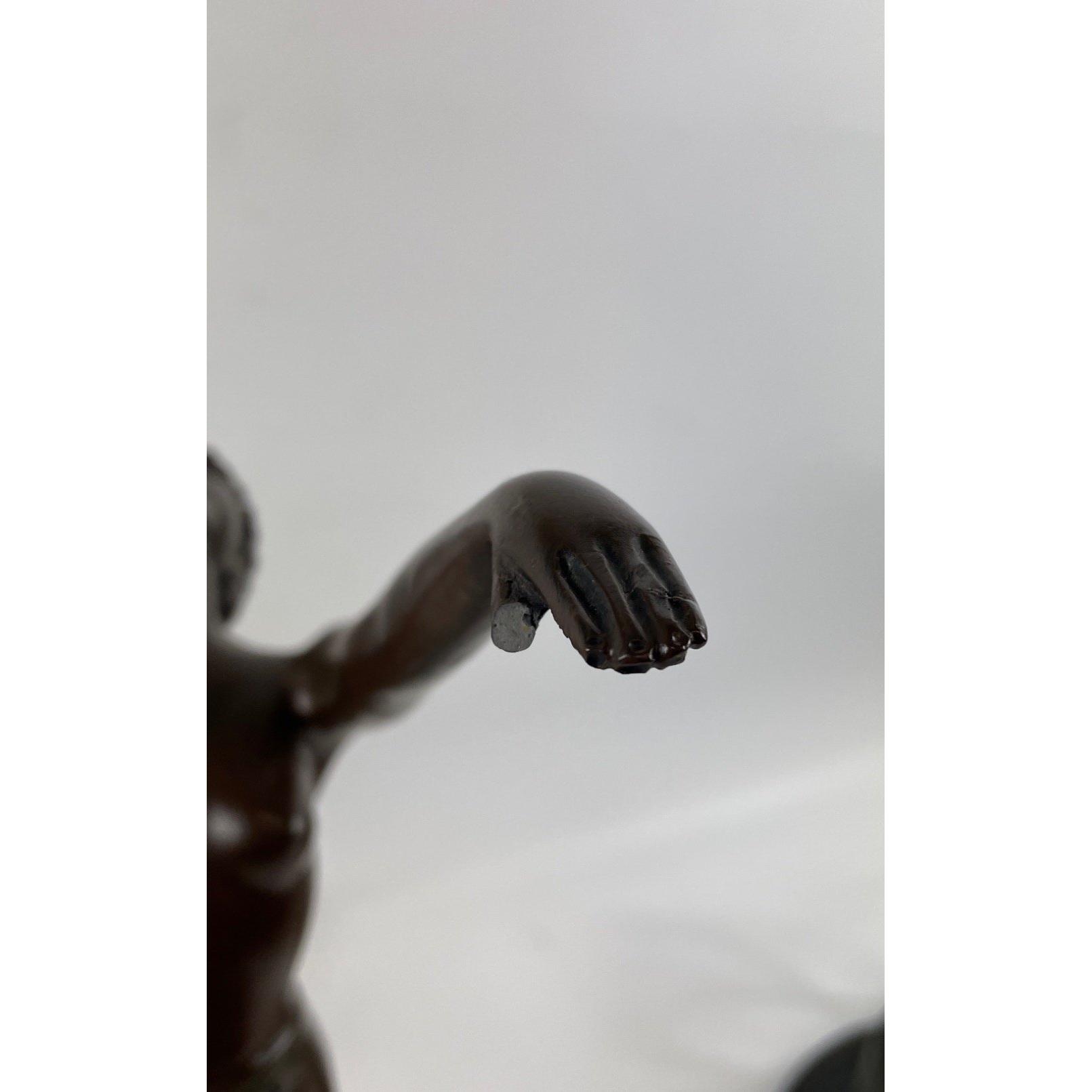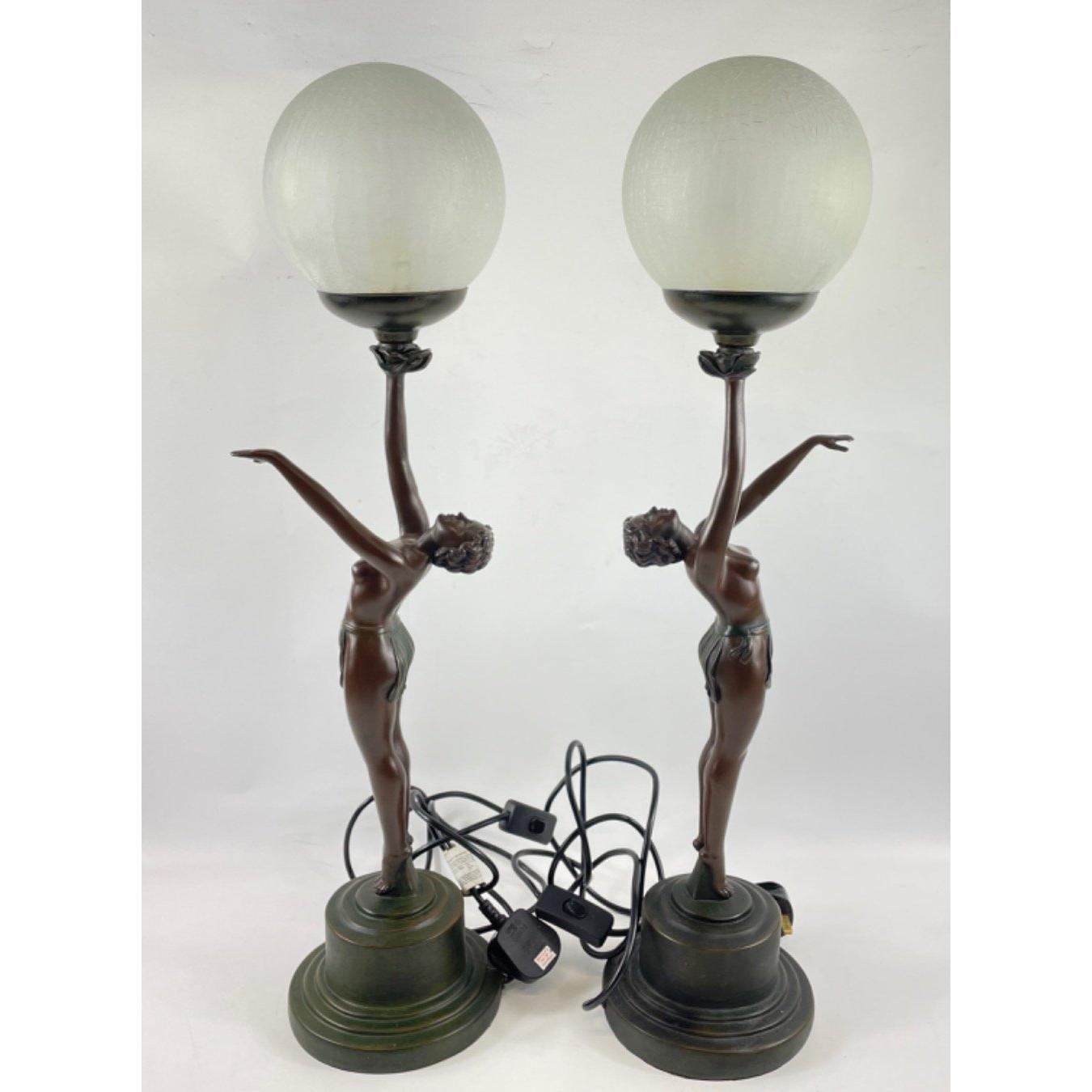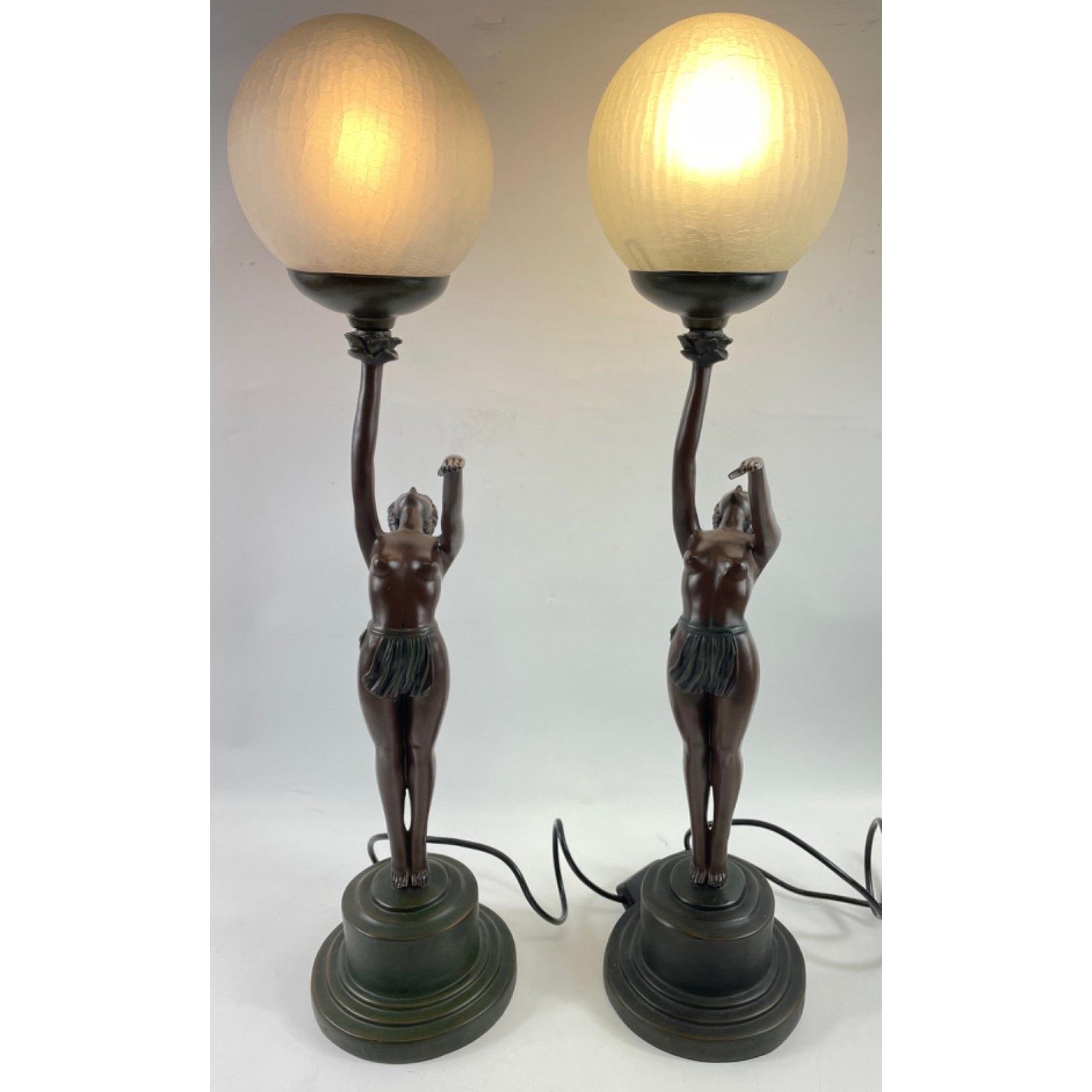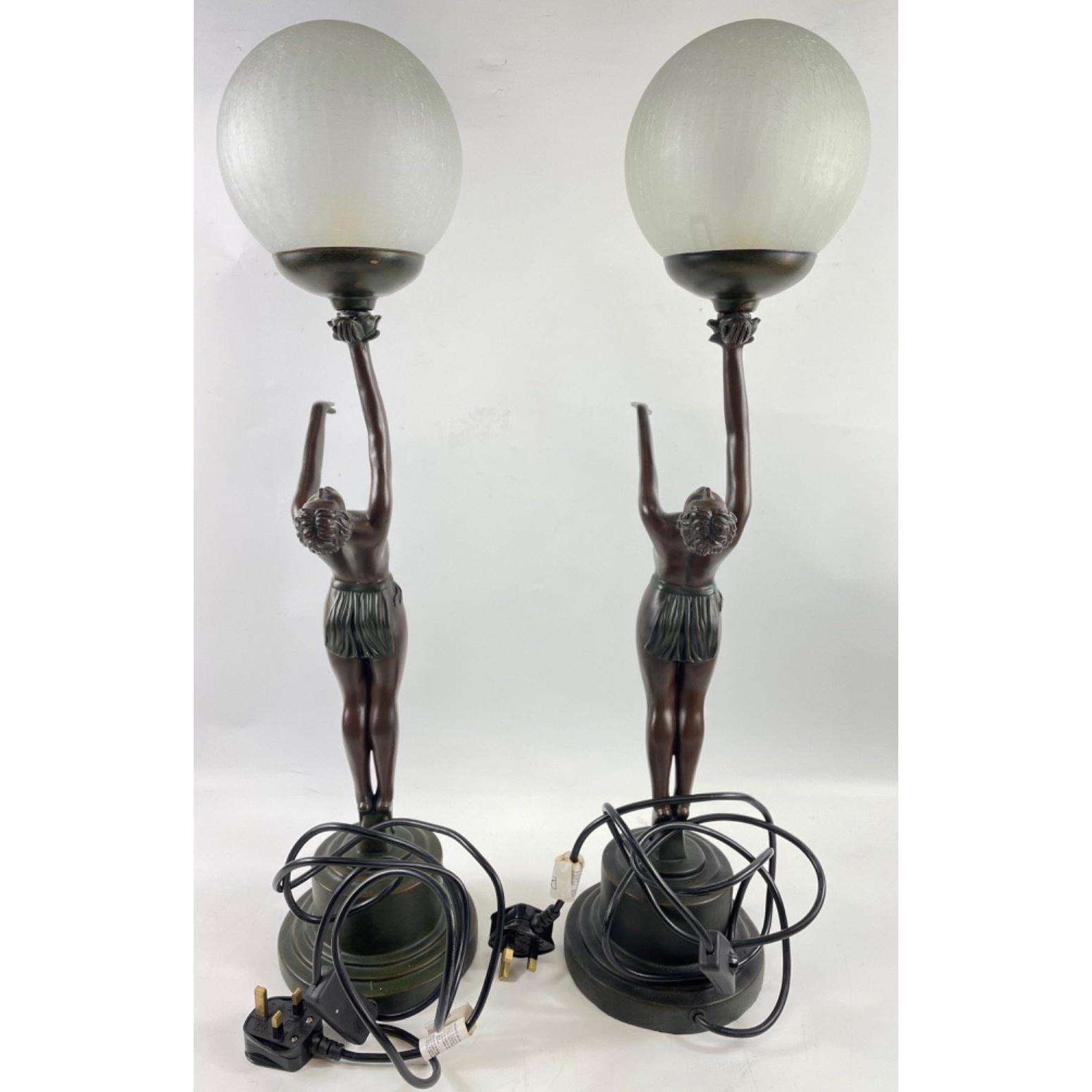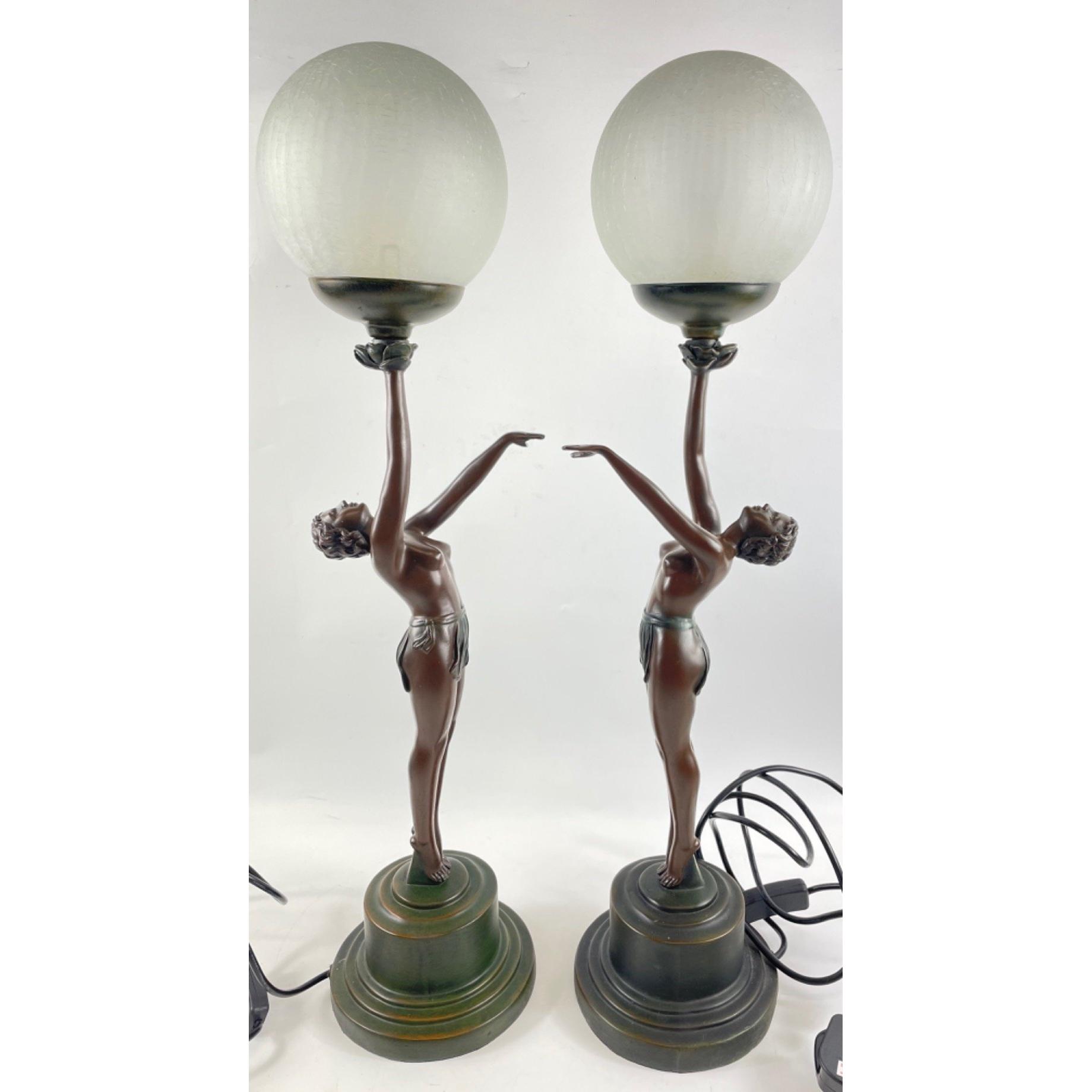 A pair of modern bronze classical figurine electric table lamps with opaline style glass ball shades - dimension 26†tallApprox 2 pieces