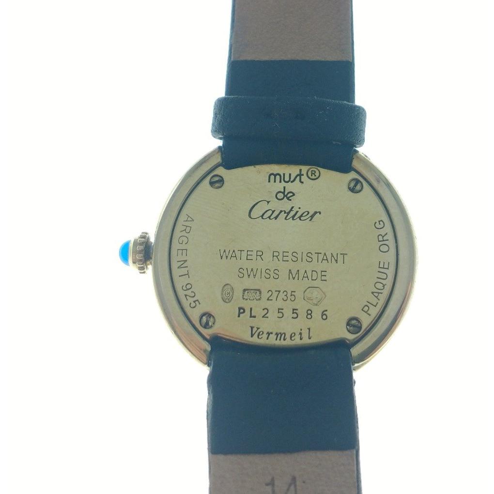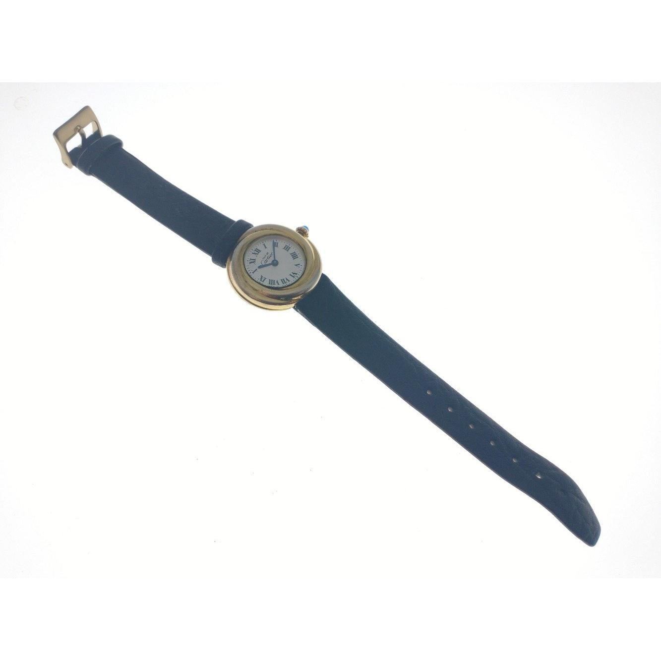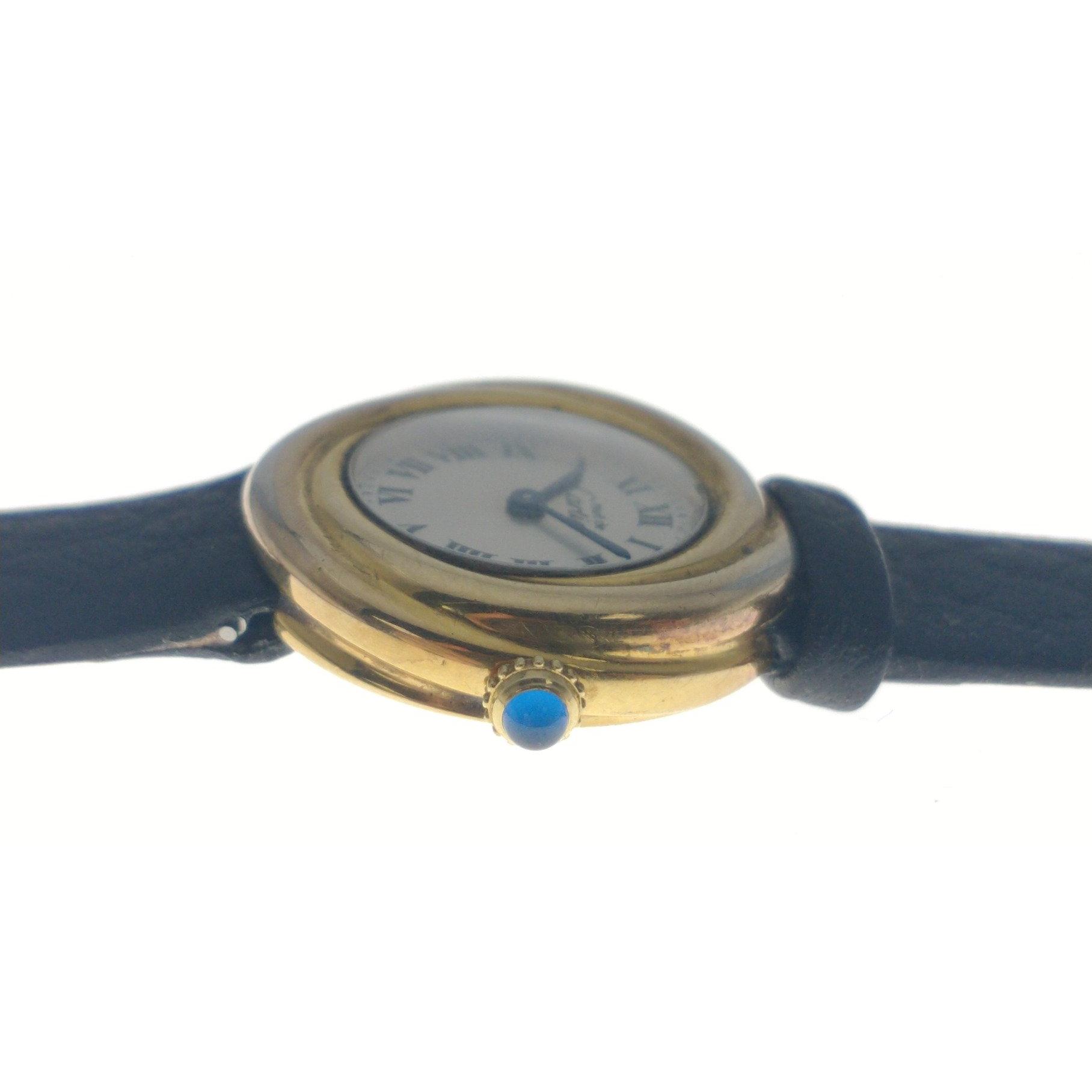 FABULOUS Must de Cartier PL 25586 Vermeil gold plated ladies wrist watch - QUARTZ movement - ARGENT 925 CARTIER 1970's Must De Trinity Quartz 2735 - with black leather strap - slight wear on the gold plate top and bottom of the surface of the watch front, requires a new strap pin, no scratches on the watch glass face or the body of the watch - 2.7cm diameter approx - no paperwork or box -
