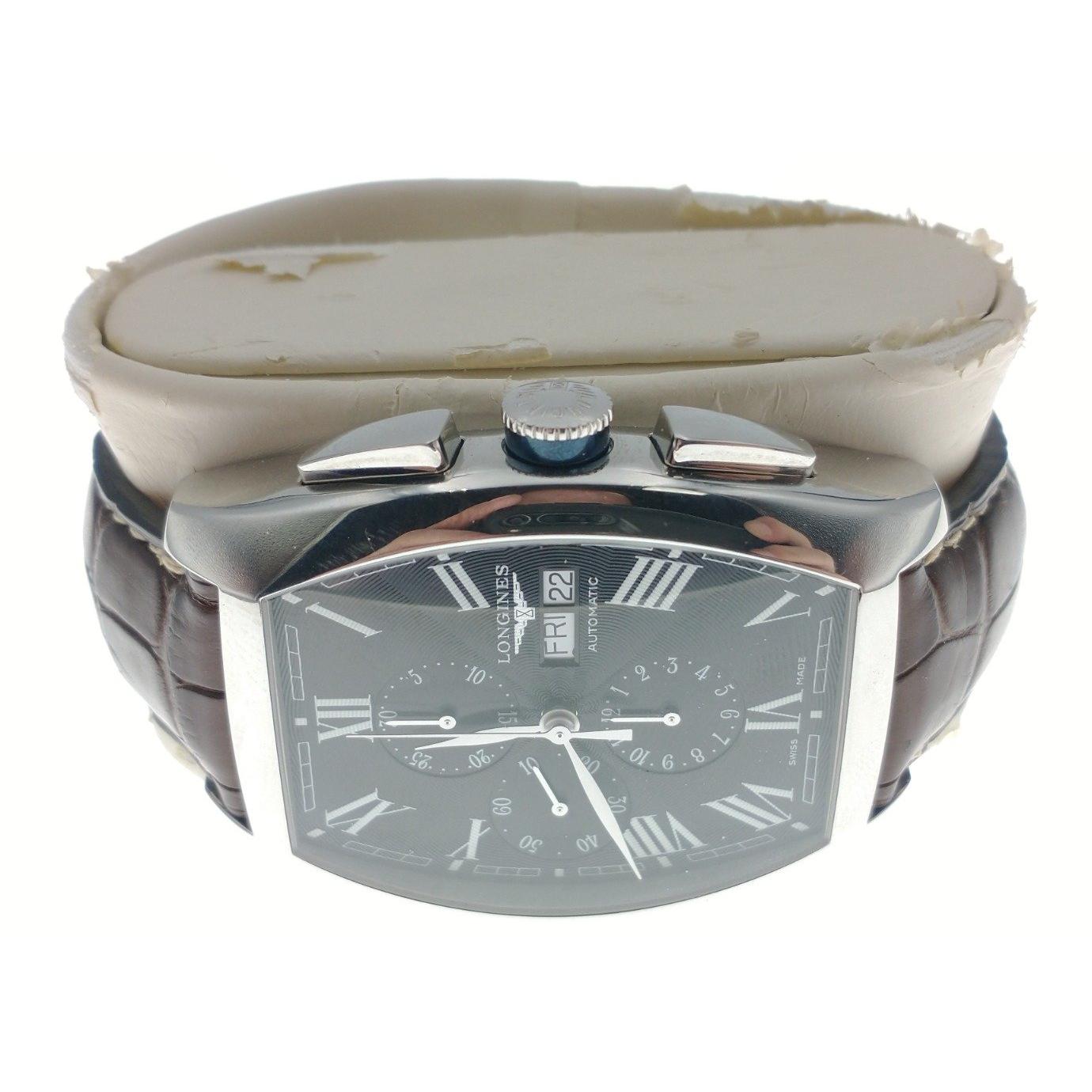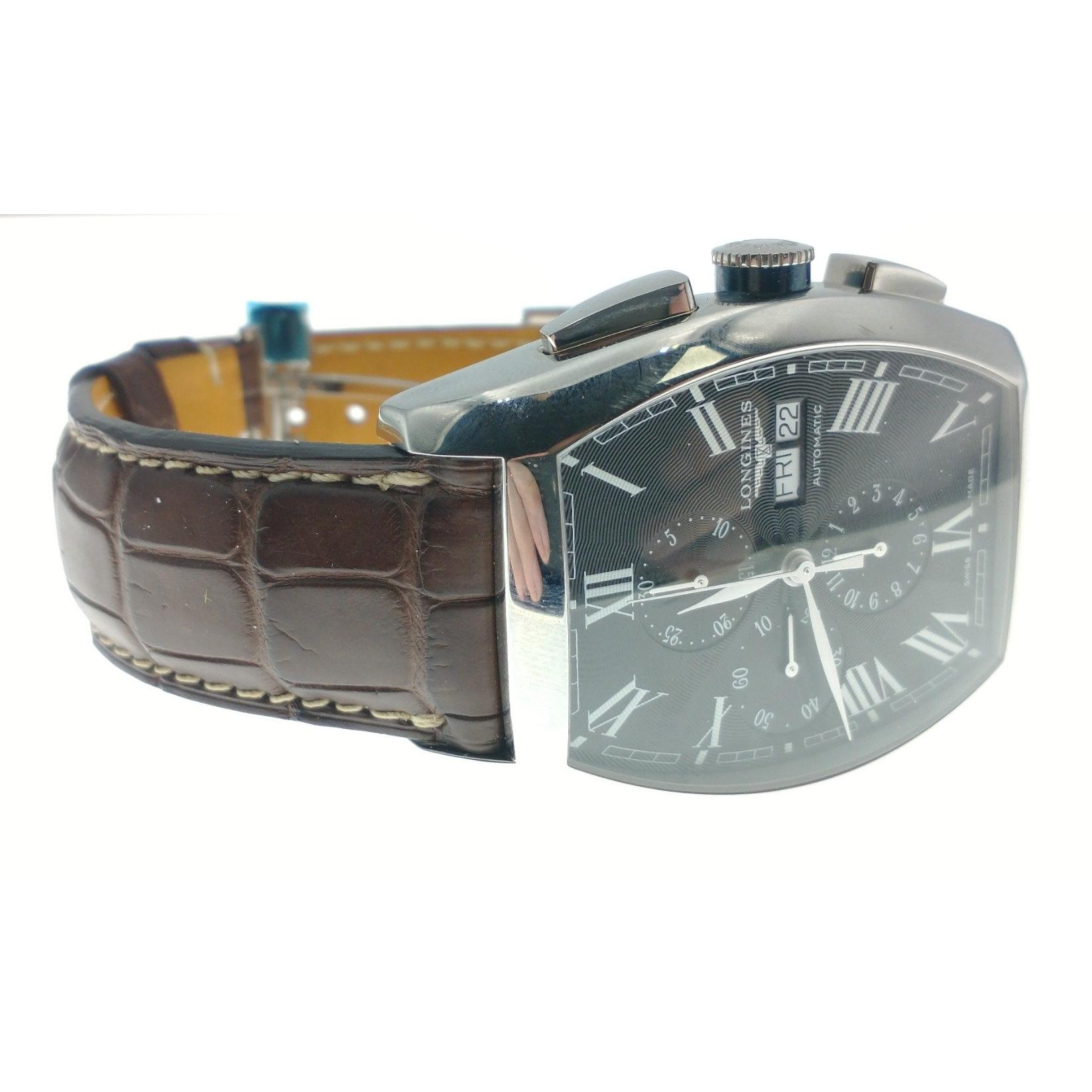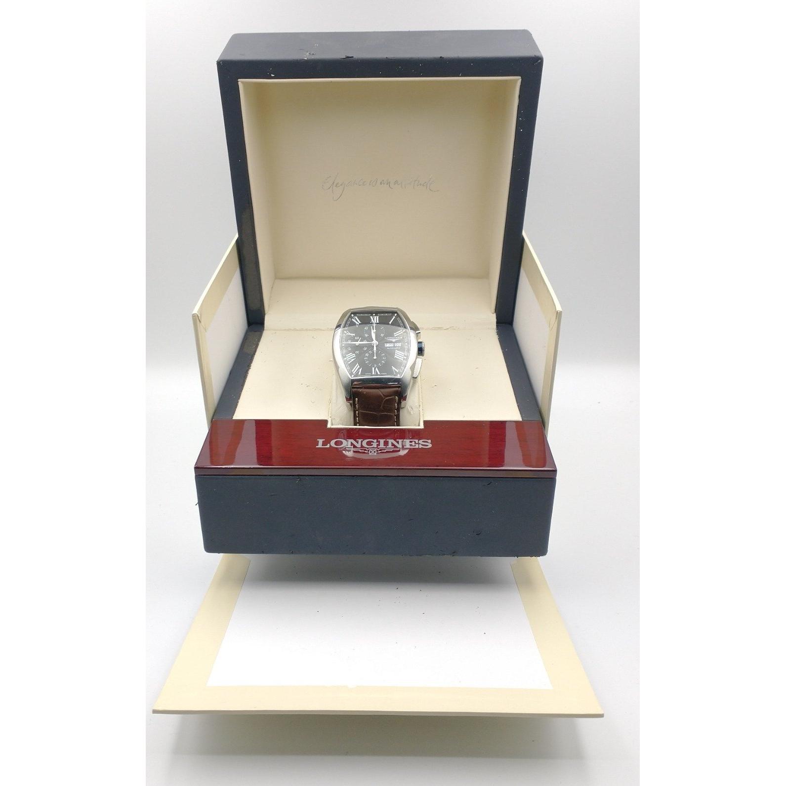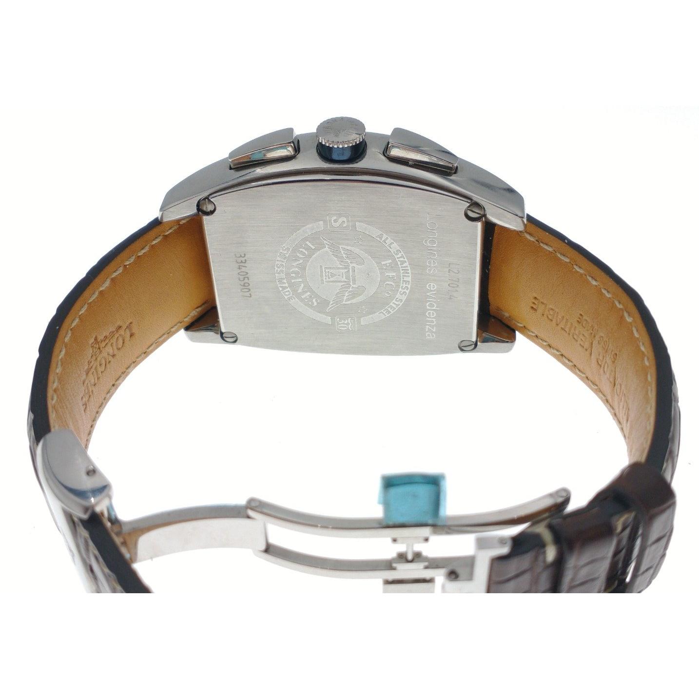 Longines Evidenza L27014 Automatic", case No. 33405907. Made in the early 2000s. Fine, tonneau shaped, large (40x35mm dial), water resistant, self-winding, stainless steel wristwatch with shaped three button chronograph, registers, day/date and three sub dials. The watch is in immaculate condition and unworn, still carrying the original strap clasp plastic protectors. Box has wear inside and out and the instruction manual is not present. ''Elegance is an Attitude''