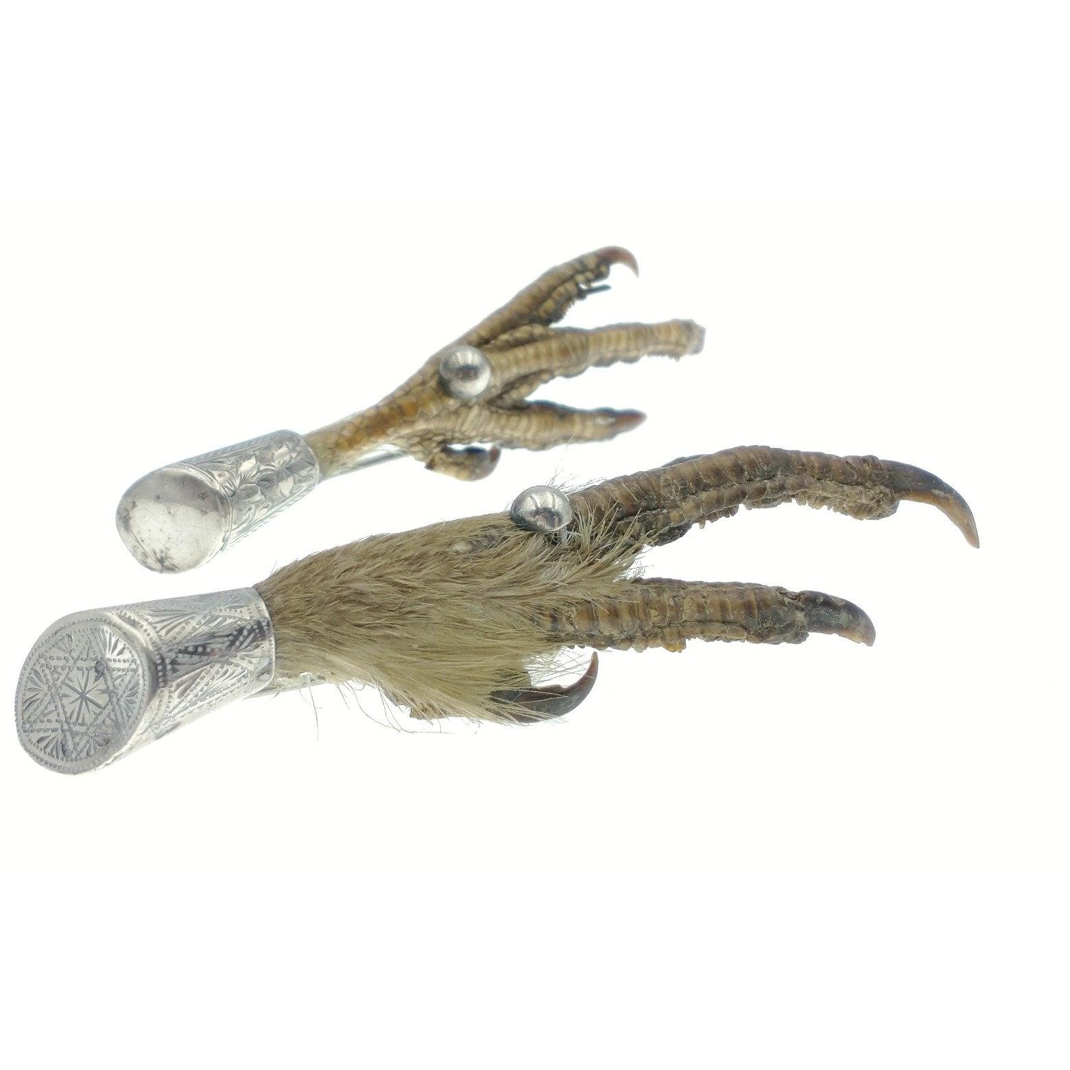 Two white metal mounted VICTORIAN Grouse claw kilt pins, largest 9cm, smaller 7cm. In generally good order with working pins Approx 2 pieces