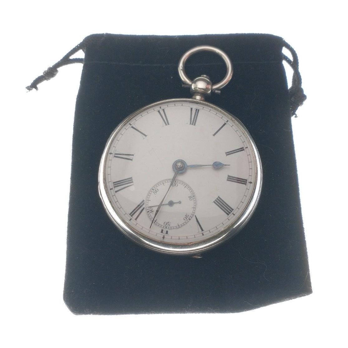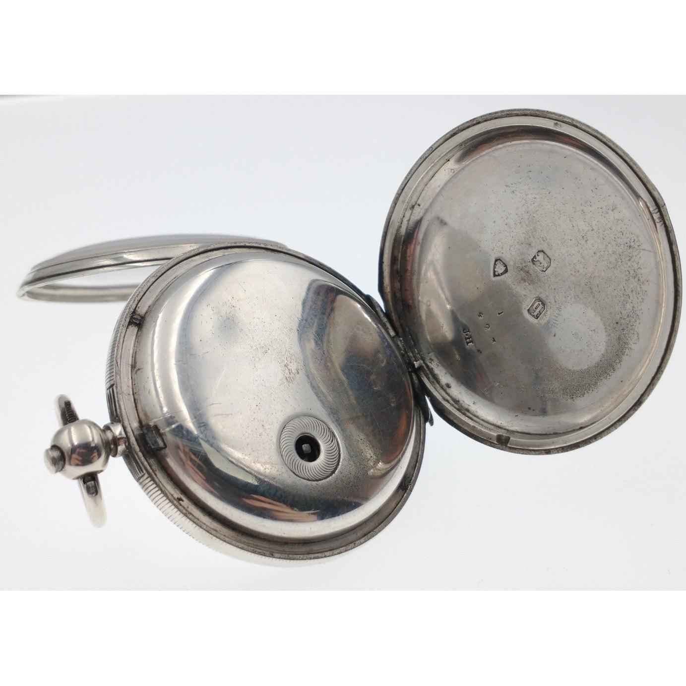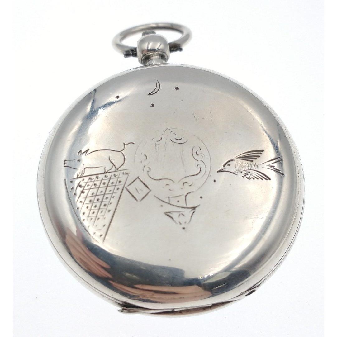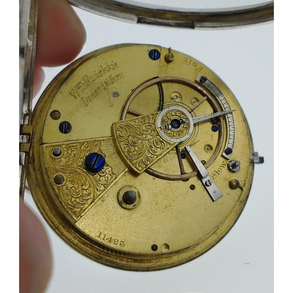 Unusual Silver Pocket watch with local interest. Hallmarks on case for 1931. Inscribed on the movement for Wm Ruickbie of Innerleithen. Key wound, not currently running. - 5cm diameter approx