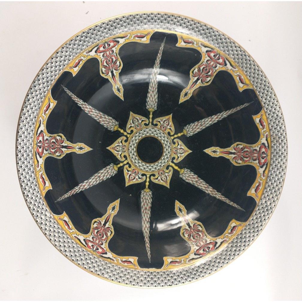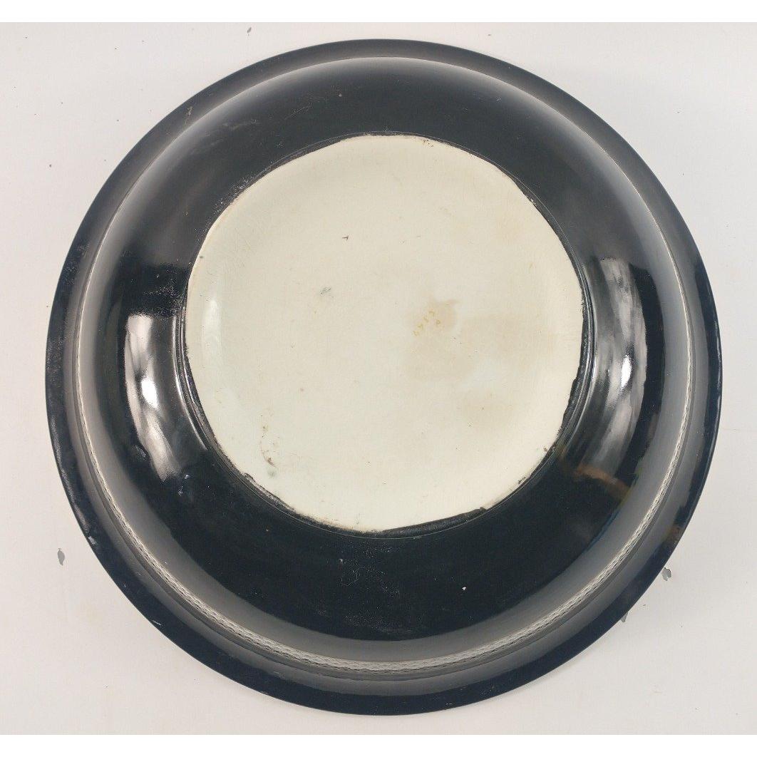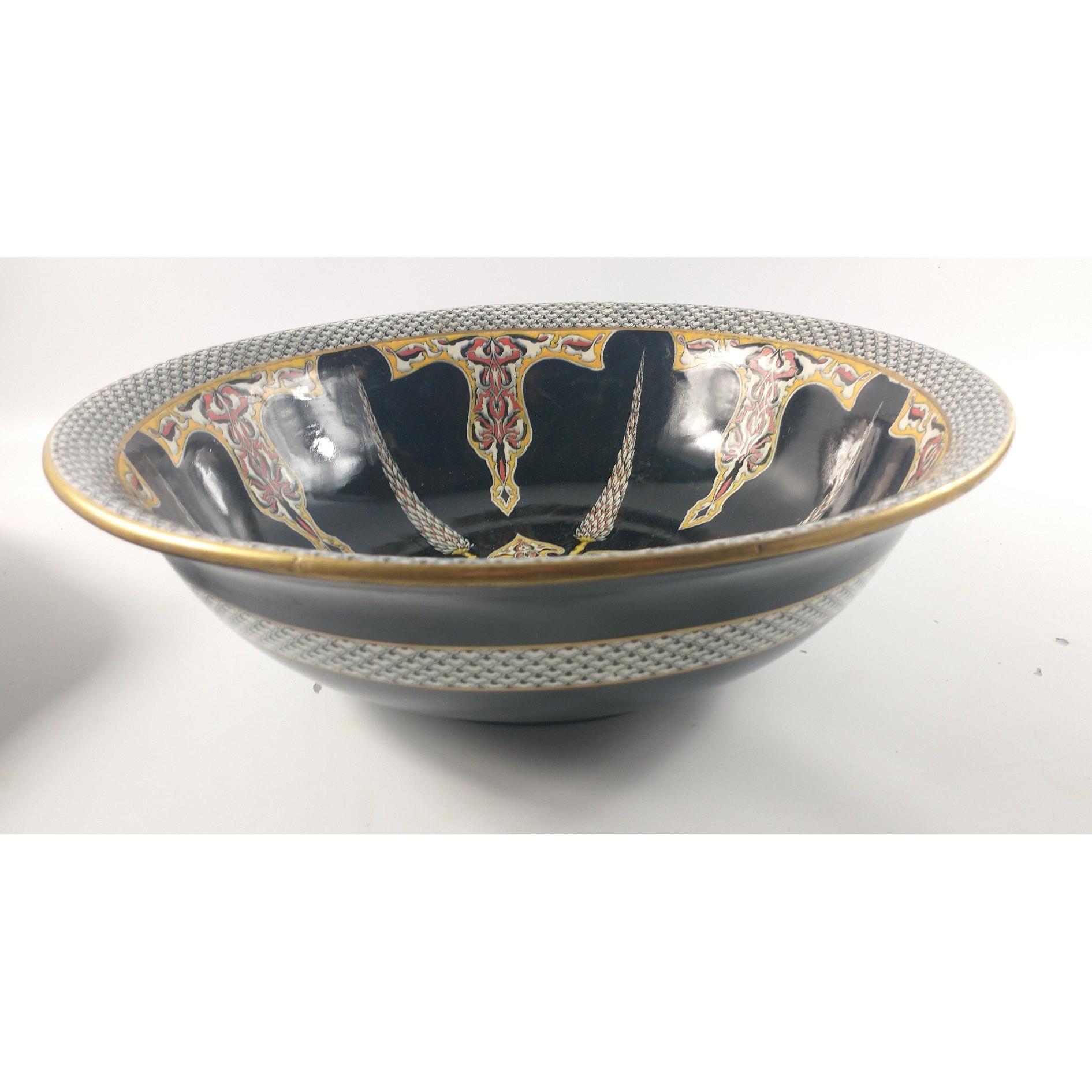 TWO very large antique ceramic basins, one cream based with with a roses floral pattern - dimensions 45cm diameter x 13cm height approx, the second one a 'striking' black based pattern with gold painted rim, - dimensions 41cm diameter x 13cm approx, no makers mark on either