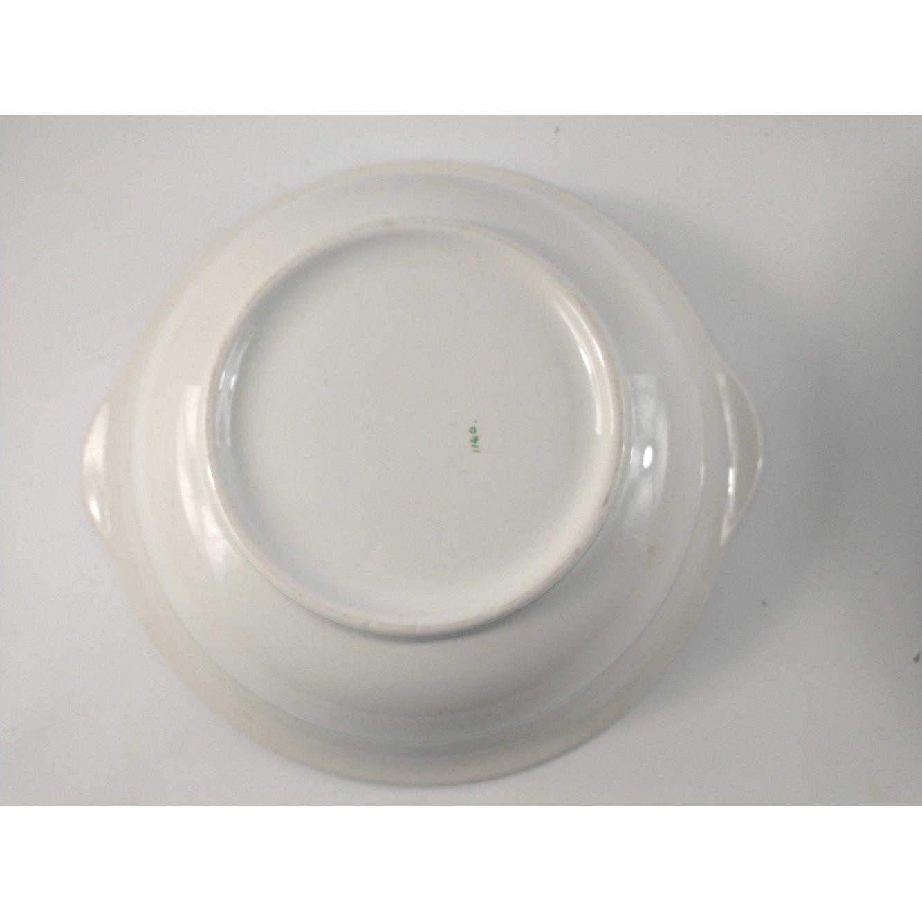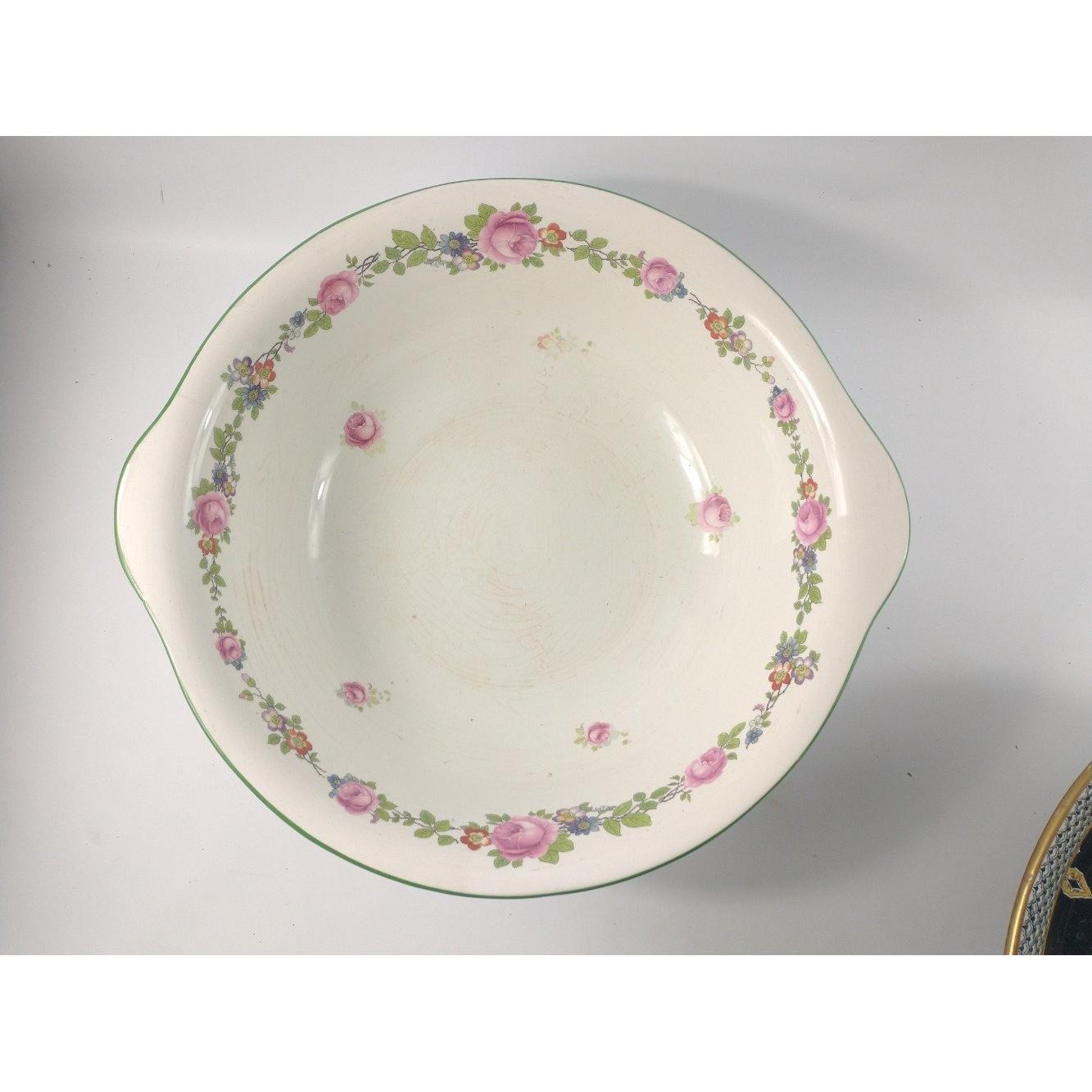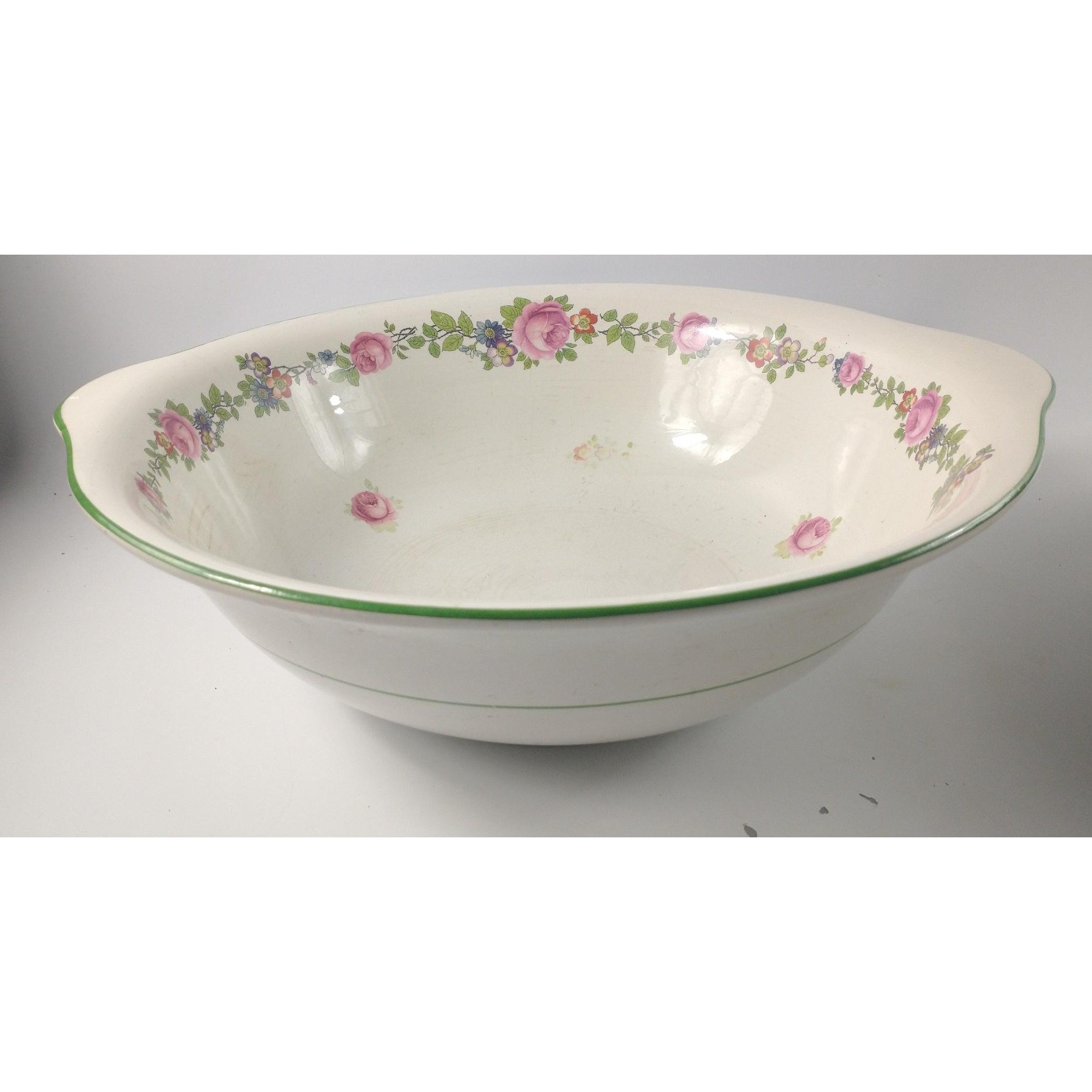 TWO very large antique ceramic basins, one cream based with with a roses floral pattern - dimensions 45cm diameter x 13cm height approx, the second one a 'striking' black based pattern with gold painted rim, - dimensions 41cm diameter x 13cm approx, no makers mark on either