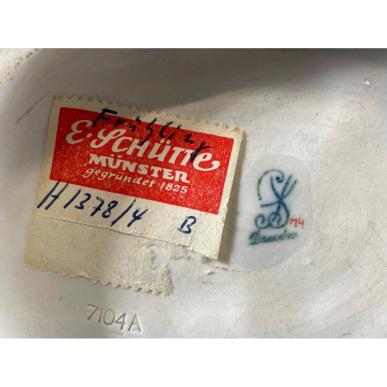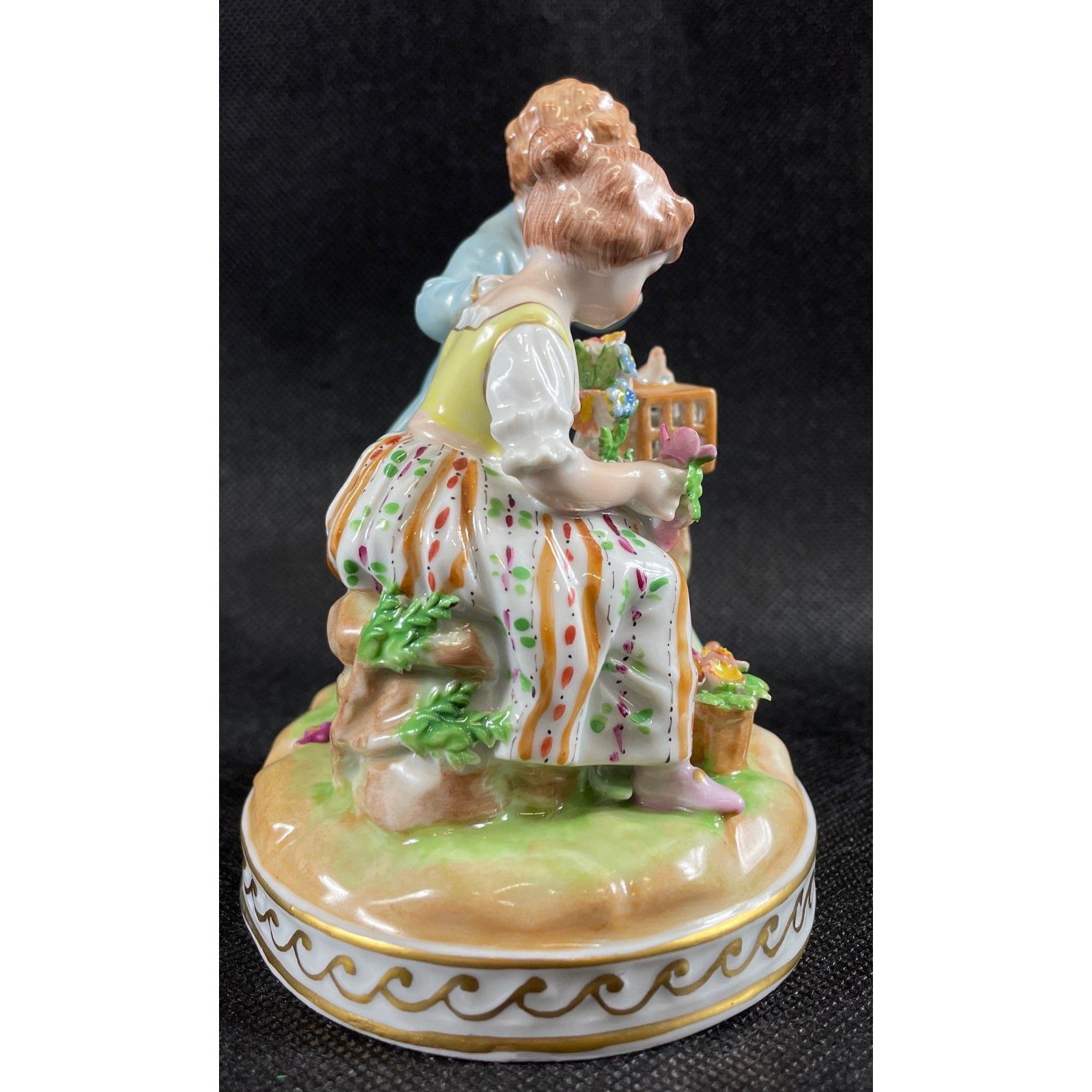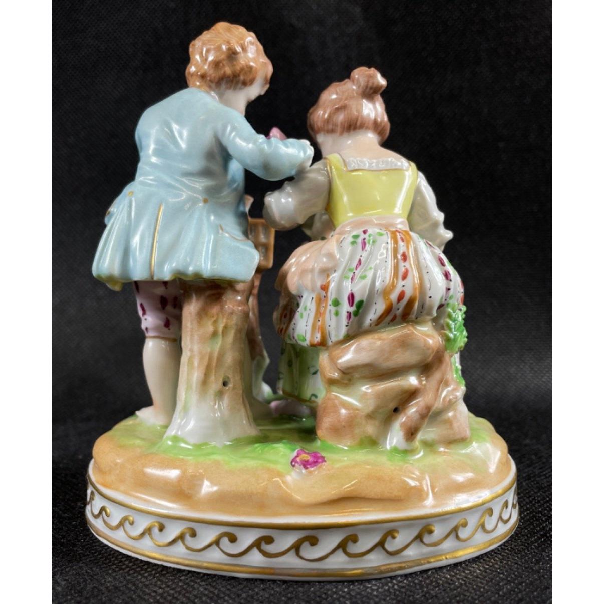 A DRESDEN (7104A) grouping of a girl with flowers and boy with a bird cage, stands 12cm tall, no chips with a 20th century Dresden trademark stampApprox 1 pieces