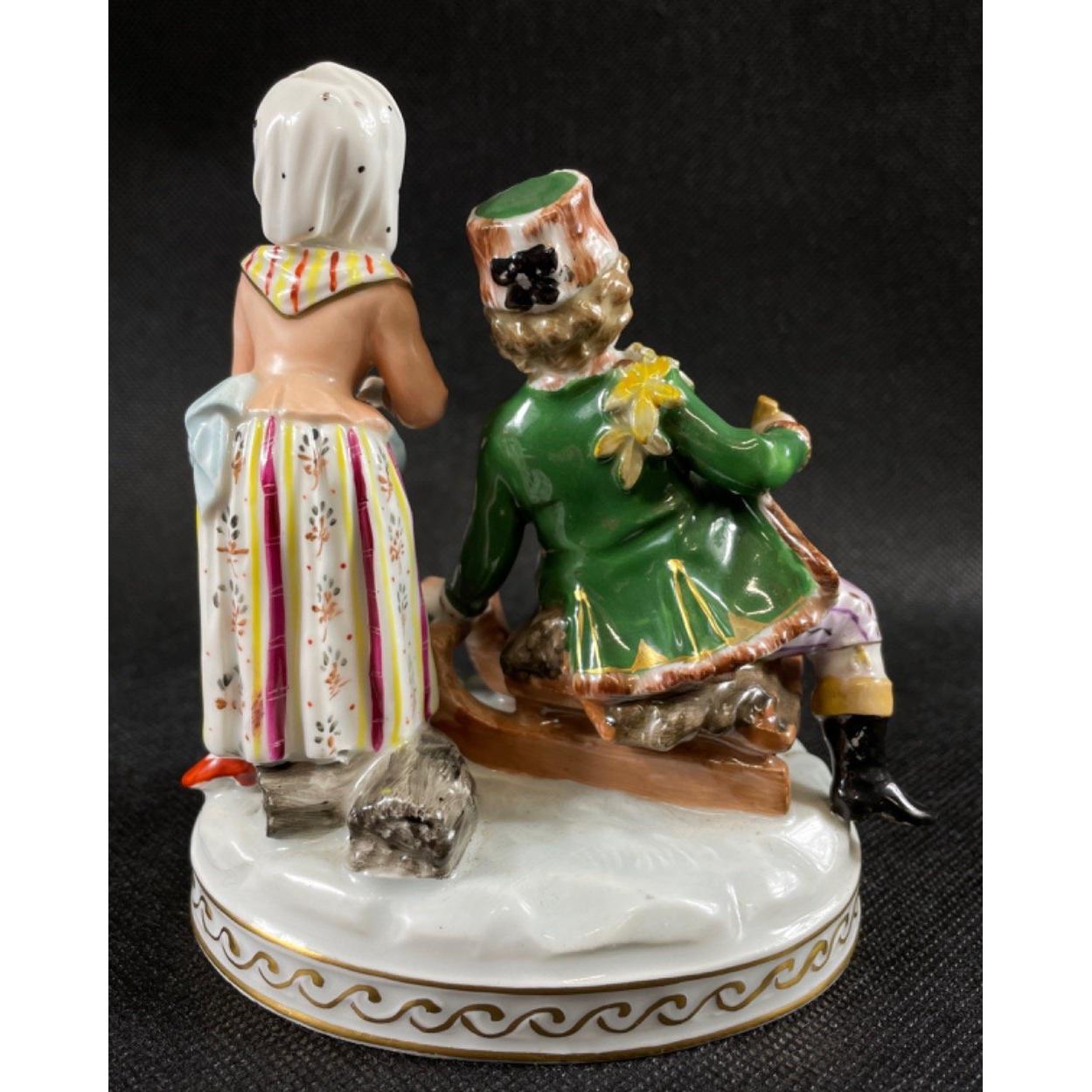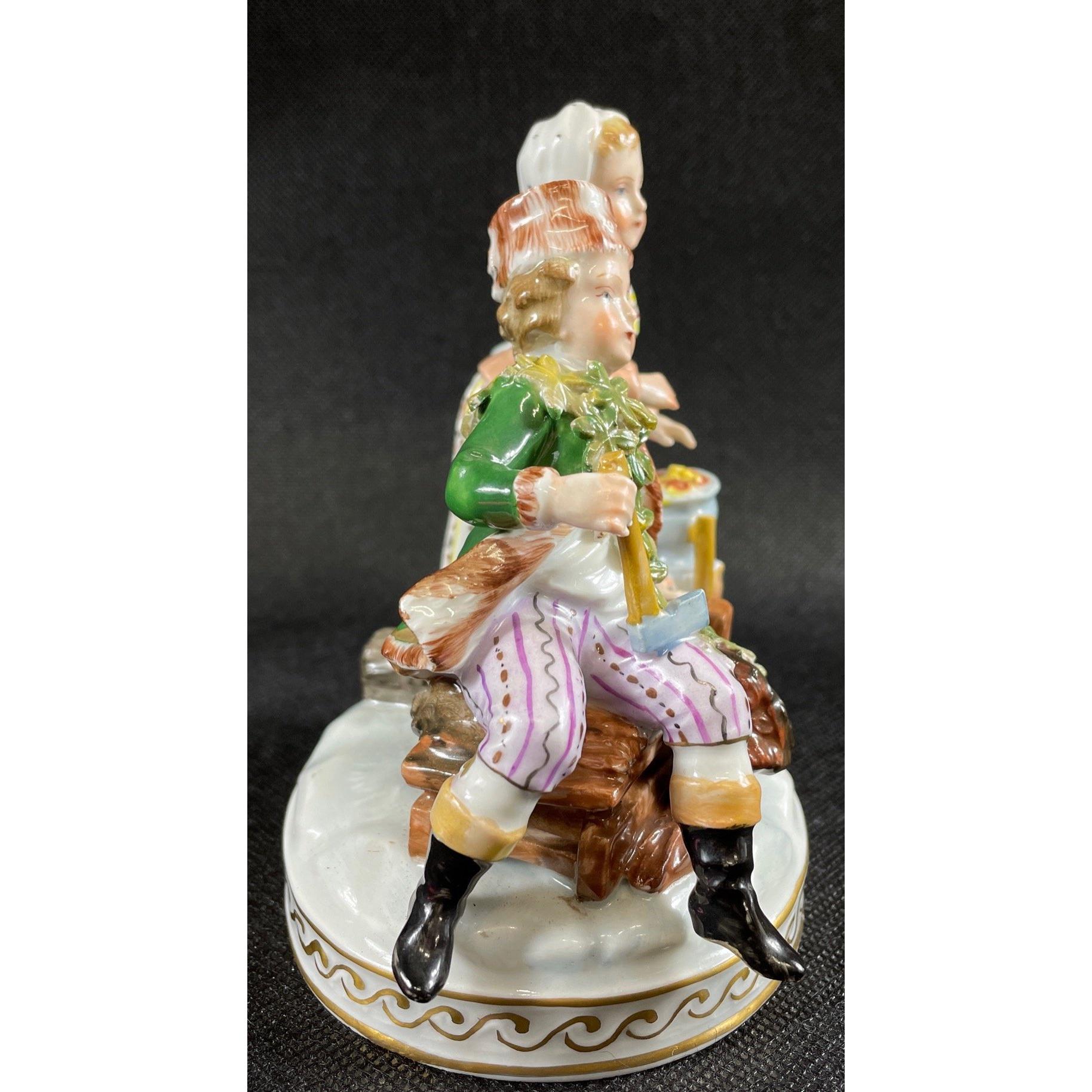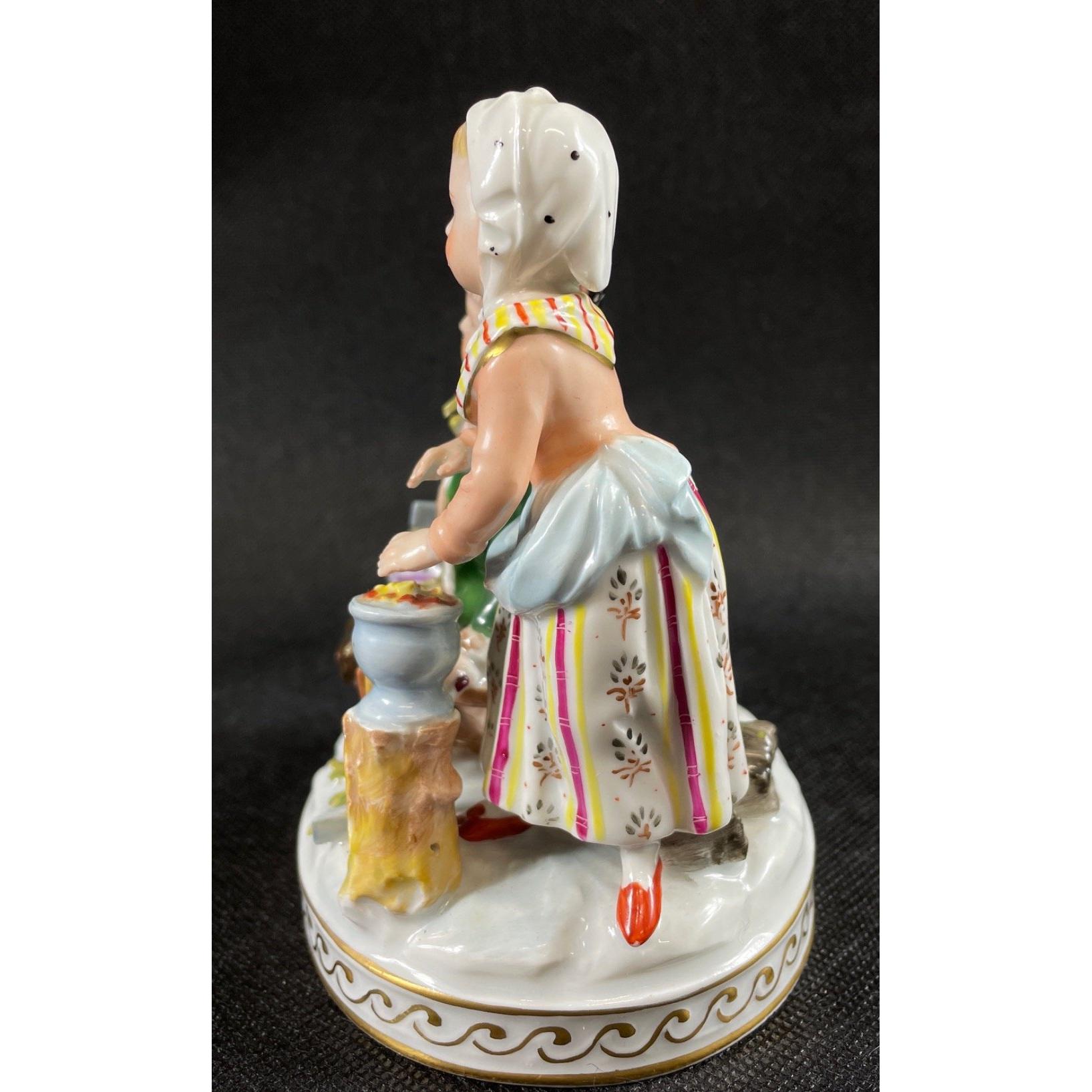 A DRESDEN (M7107) winter grouping of a boy on a sledge with axe and a girl with hot chestnuts with a 20th century Dresden trademark stamp, stands 12cm tall, no chipsApprox 1 pieces