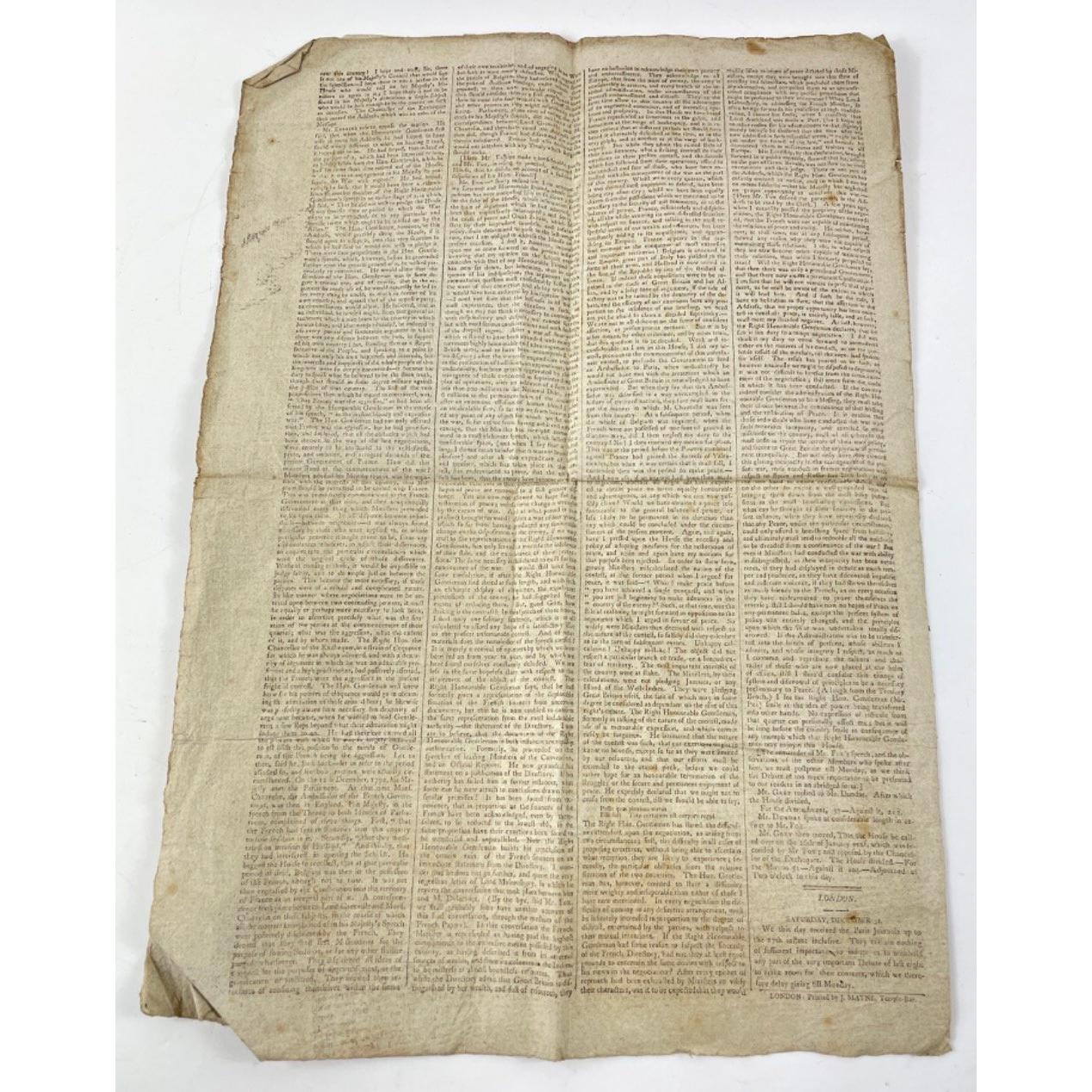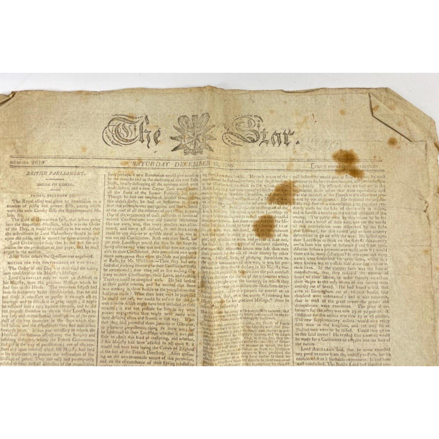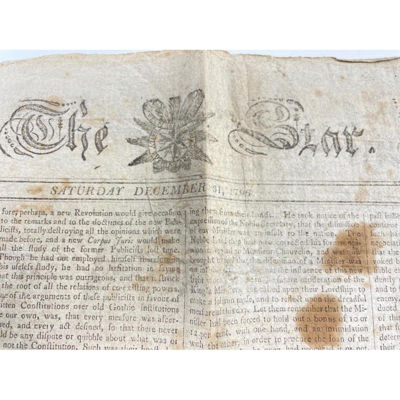 A very old original newspaper - THE STAR from December 31st 1796, issue no 2616 detailing the procedures from the House of Lords - the full page article reveals that their lordships would be adjourned until Feb 14th! The paper shows fold marks and a small amount of foxing but remains legible