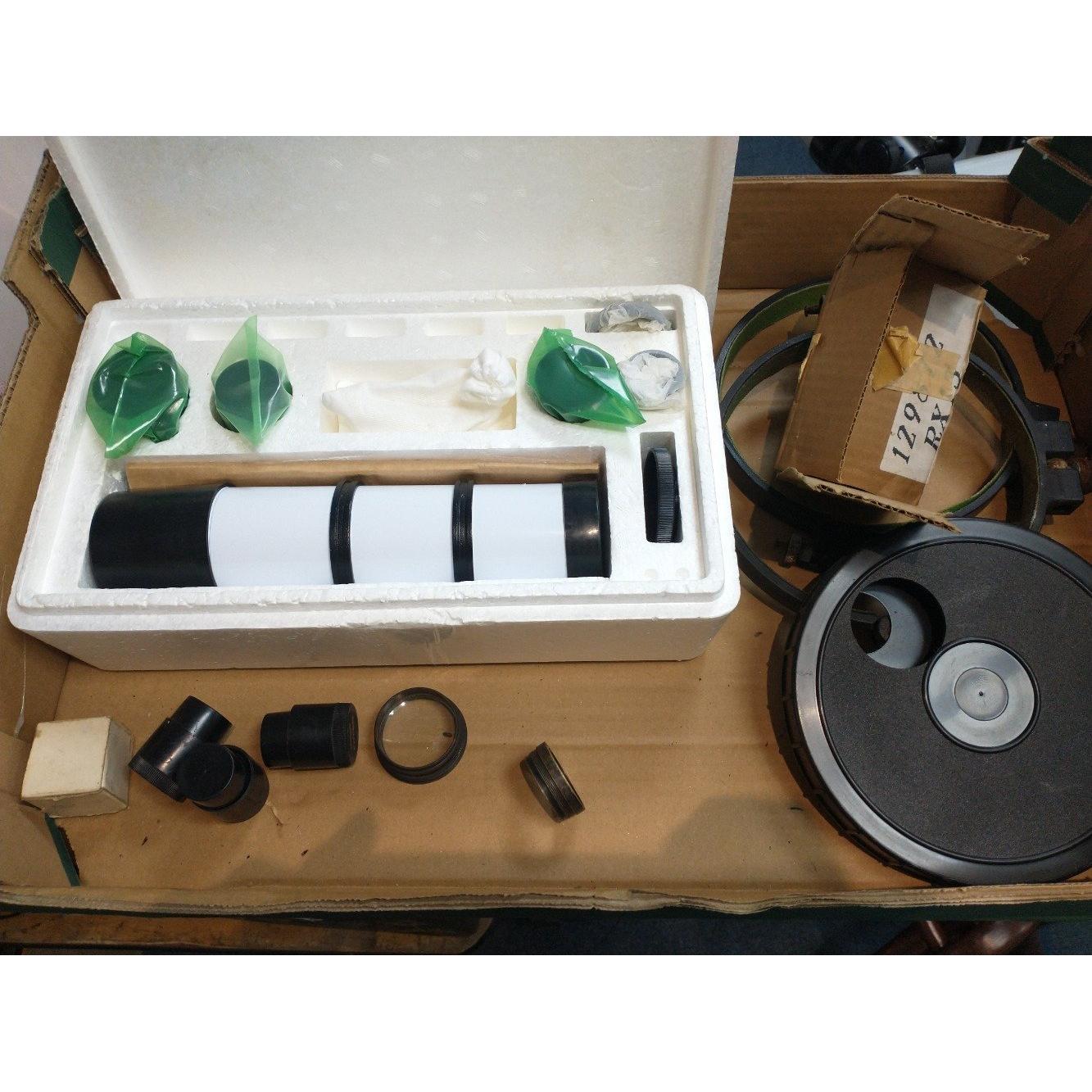 A MEADE metal carry case containing 7 lens eyepieces and a level in sponge cut-out, plus an incomplete box of AUTOCHARGER/IMAGER parts and a box of MEADE lenses, extenders, T-adapters plus an adjustable rod and also weights