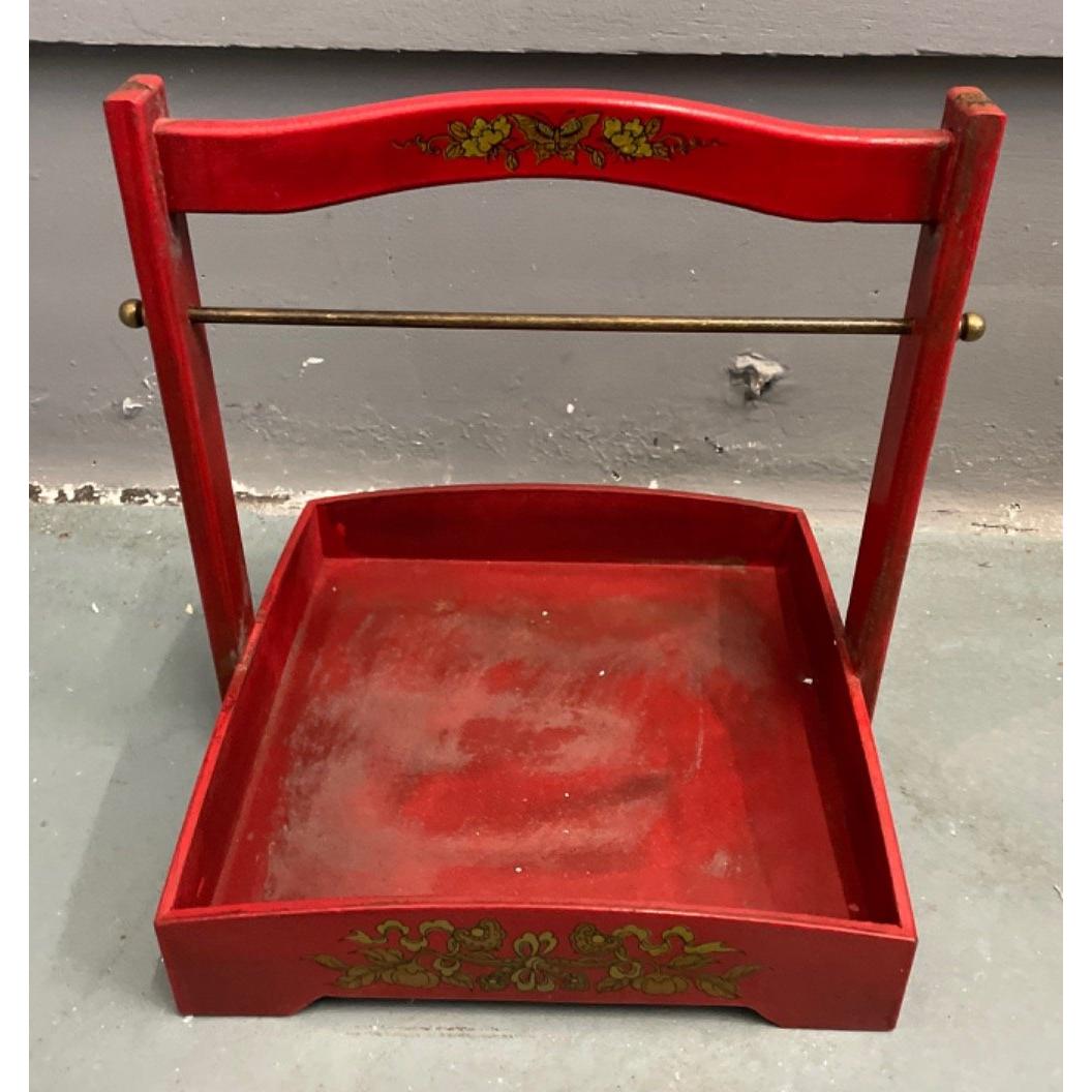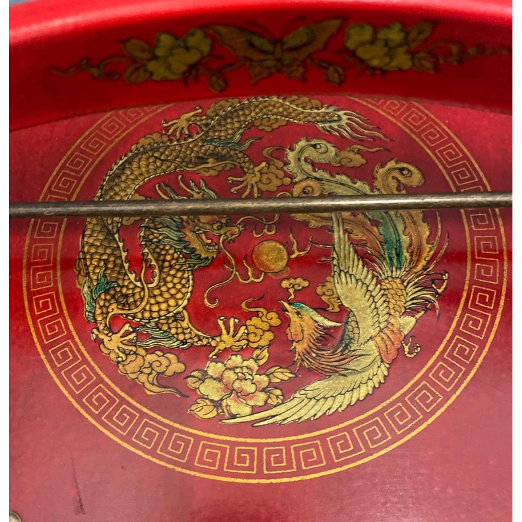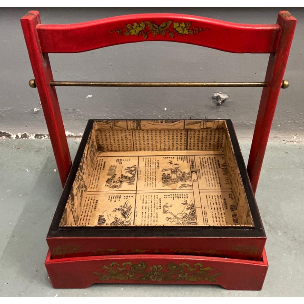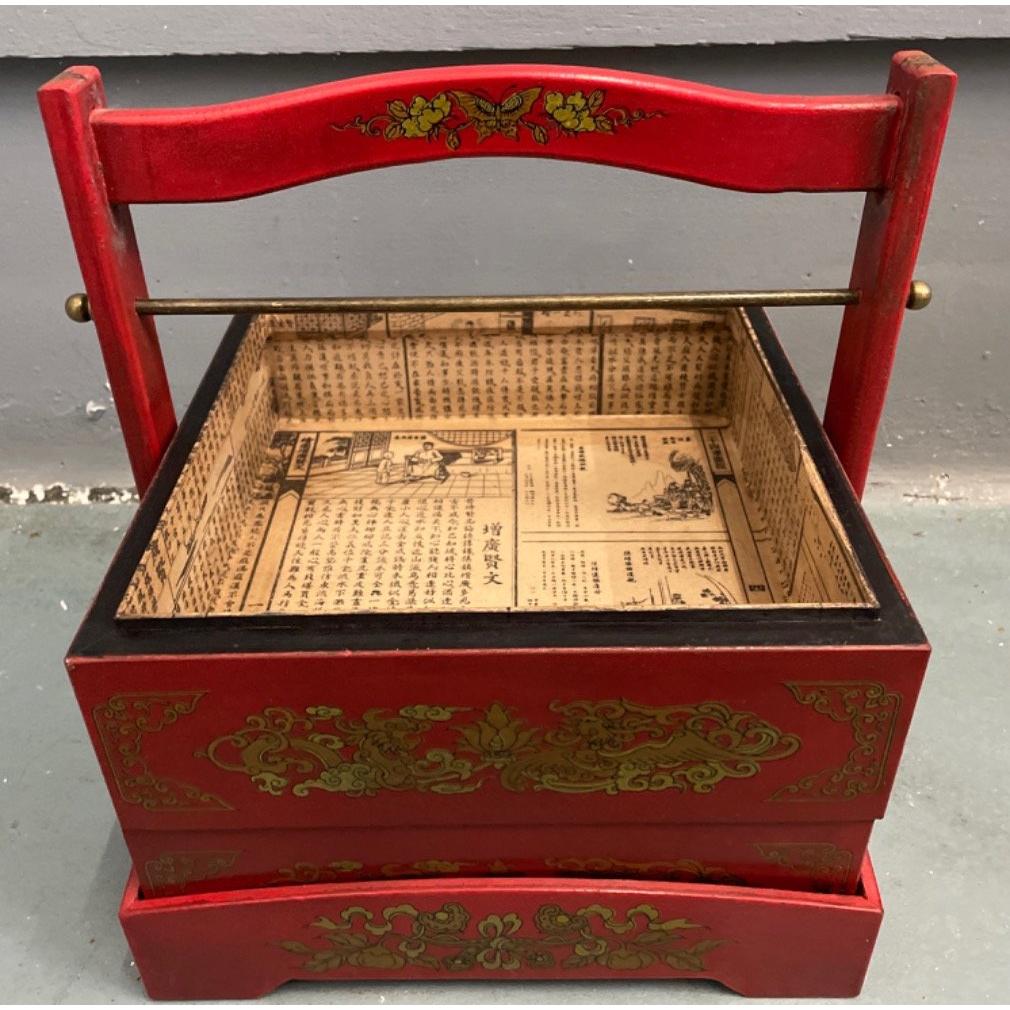 An ORIENTAL HIGHLY decorative red, gold and black painted and lacquered layer with carry handle mock food carrier - new and unused item in storage W: 28cm approx H: 31cm approx D: 28cm approx
