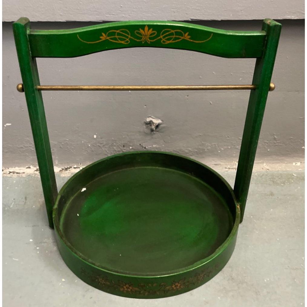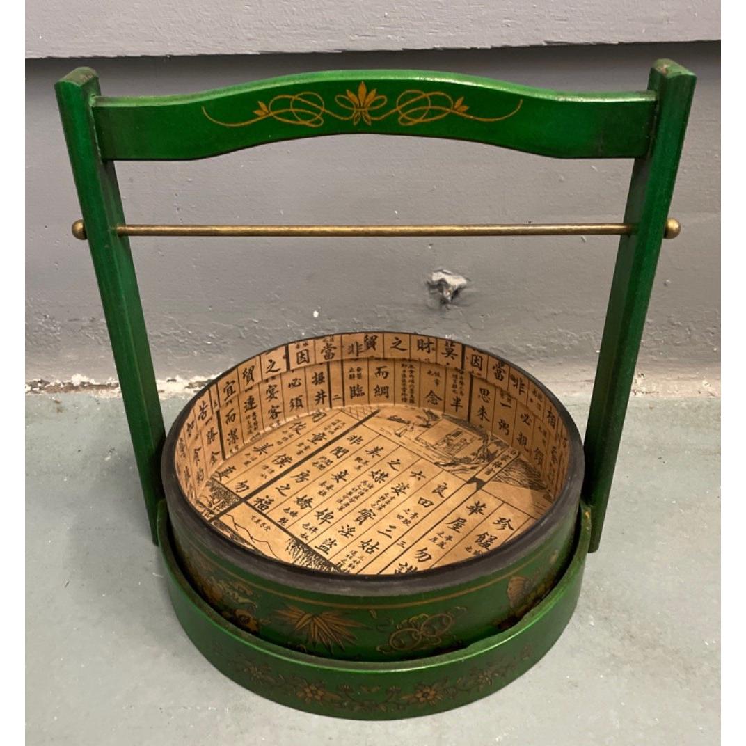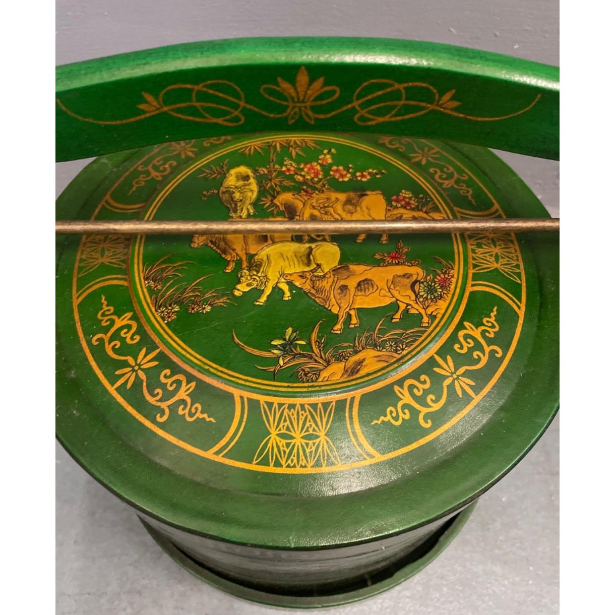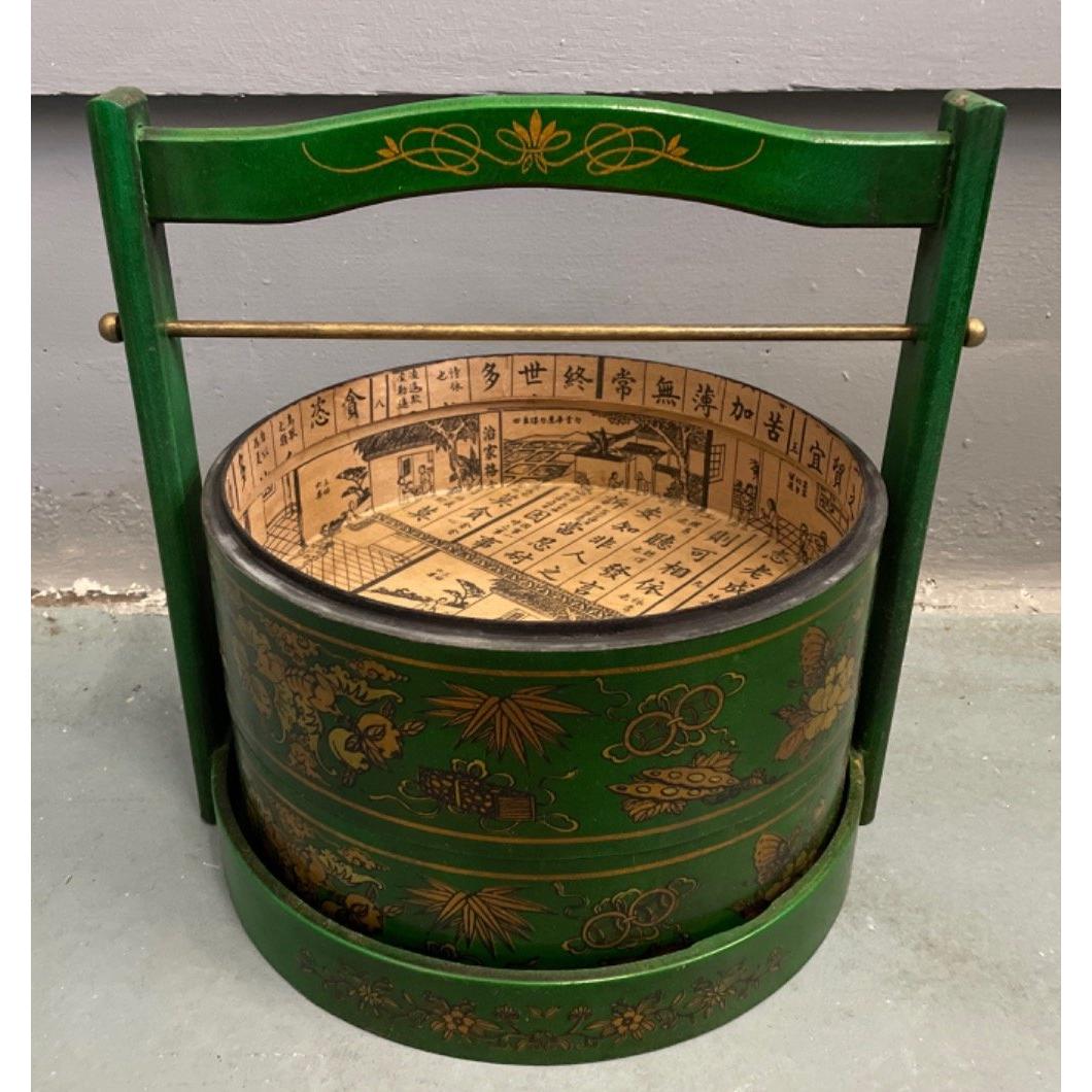 A HIGHLY DECORATIVE ORIENTAL green and gold painted lacquered with carry handle mock food carrier - unused item in storageW: 26cm approx H: 33cm approx D: 26cm approx