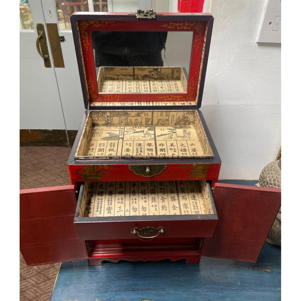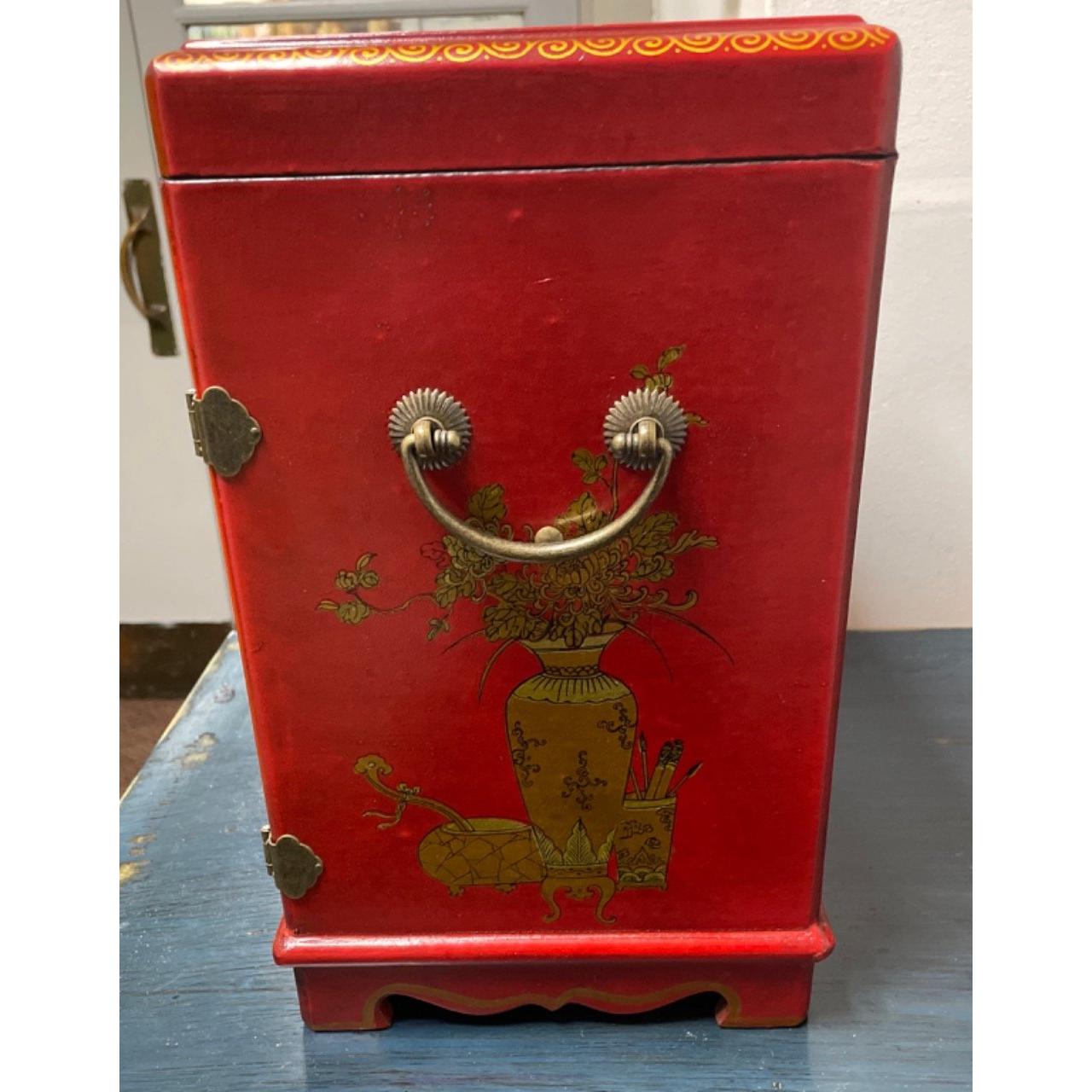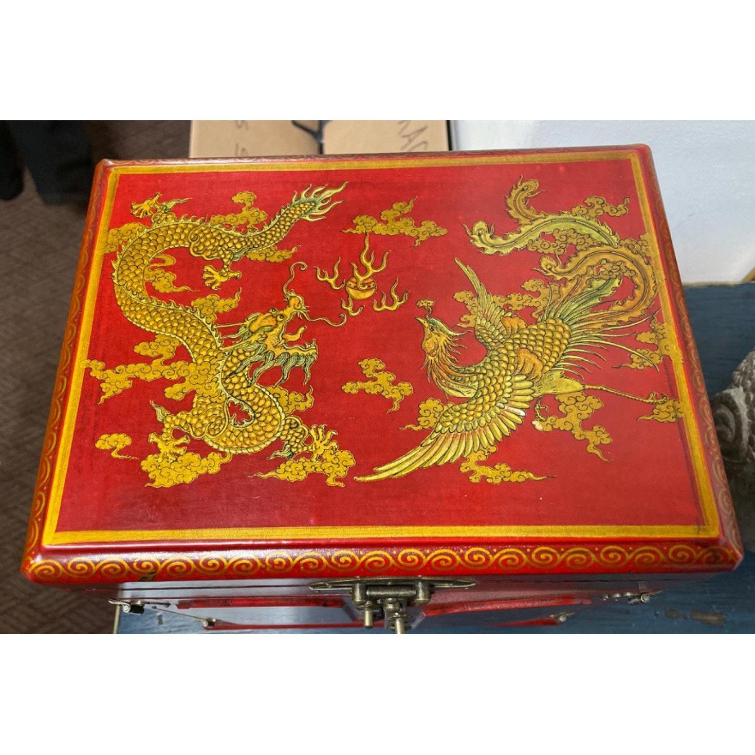 An ORIENTAL HIGHLY decorative red and gold painted and dragon patterned, lacquered red based 2 door storage top stool/side cabinet - as new unused item in storage