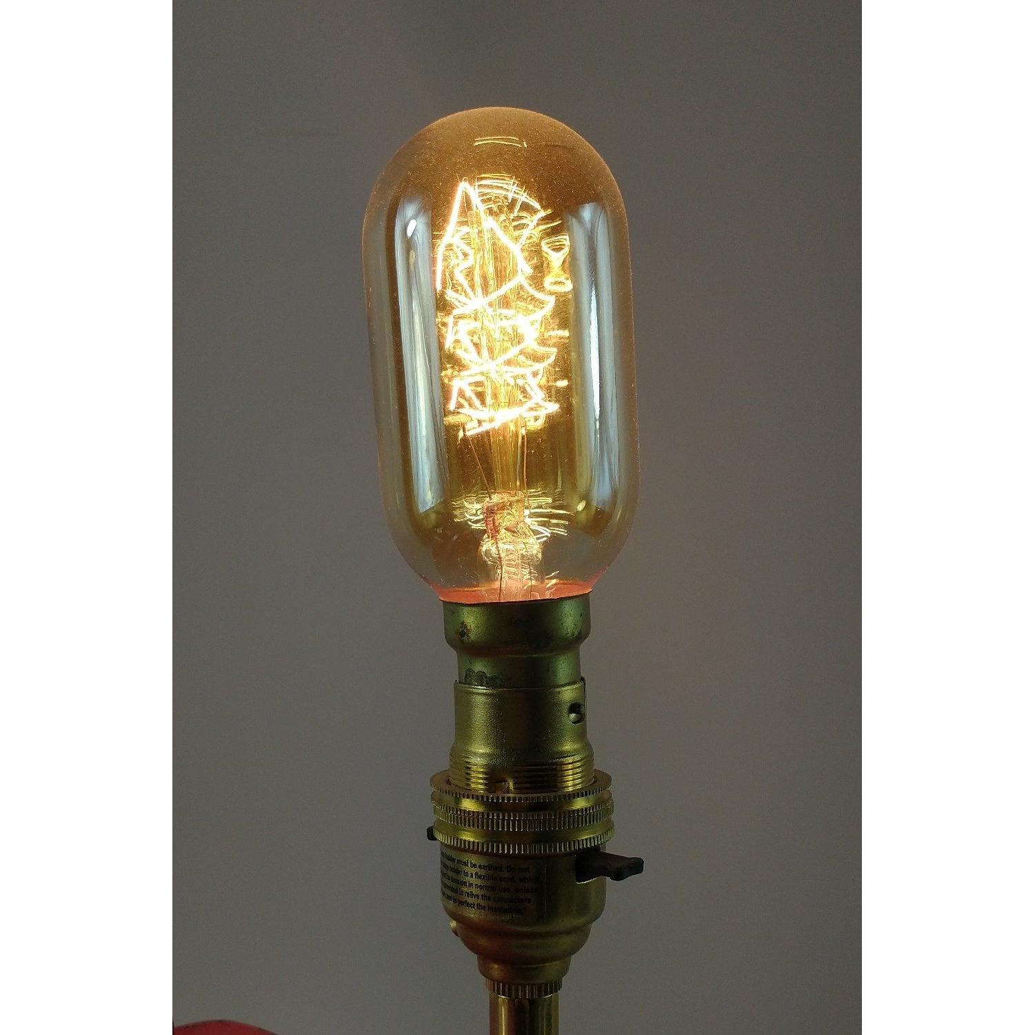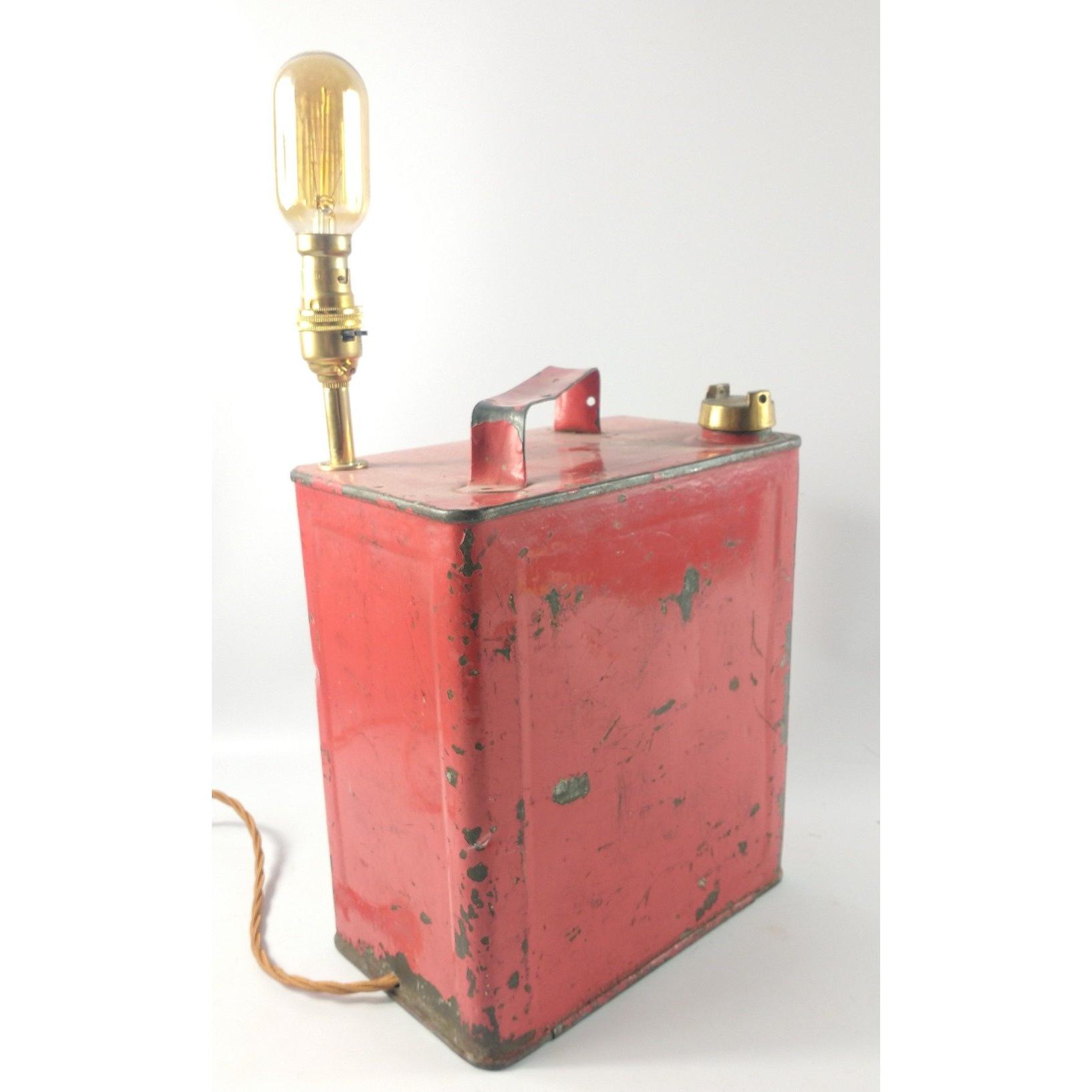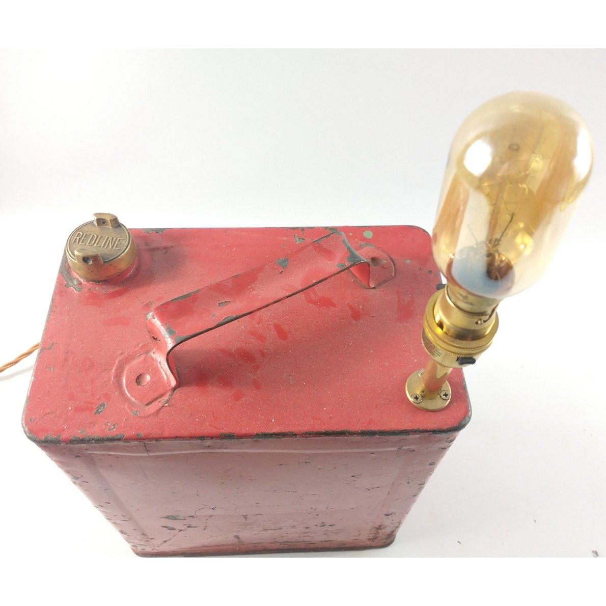 STEAMPUNK! a vintage c1930's REDLINE petrol can with original brass screw-top lid converted quite cleverly to an electric table lamp! - would make a fabulous decorative focal point in any room! - dimensions 48cm height(from ground to the tip of the bulb x 14cm width x 24cm length approx